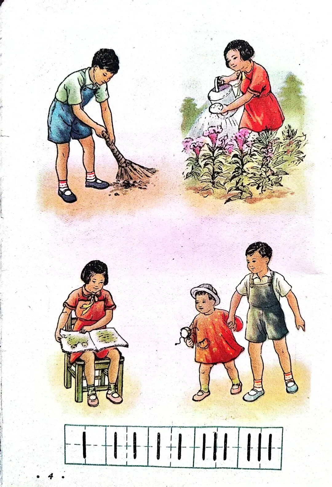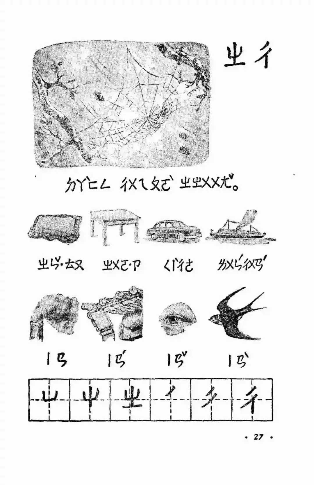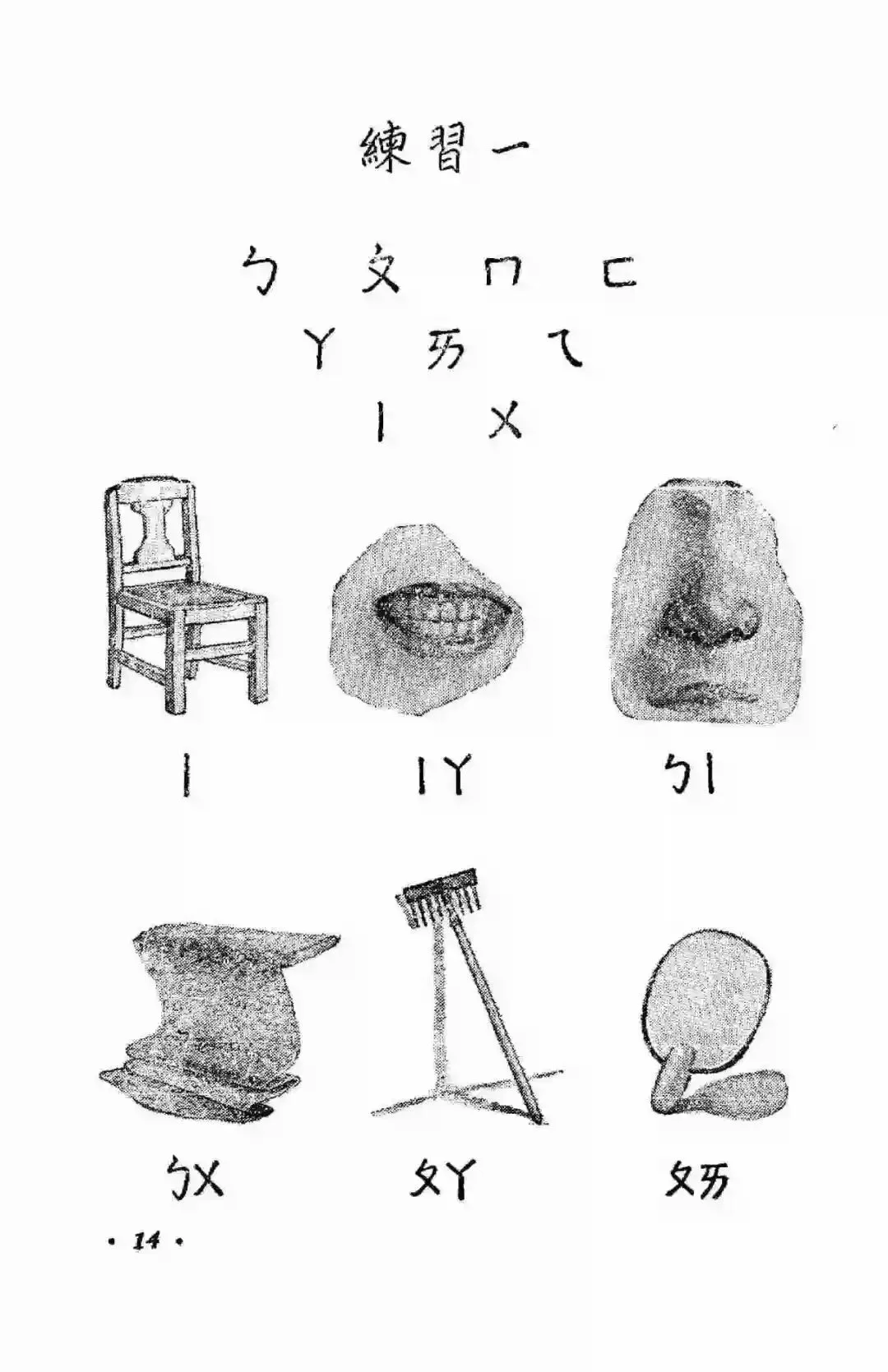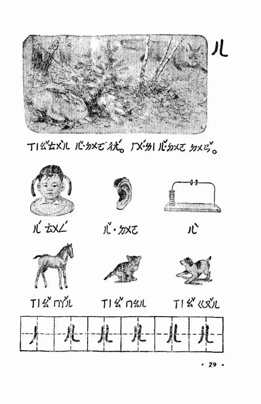 从1954年底到1957年,邓散木用工整的小楷为1955年版小学语文课本的前六册书写了精美的课文、注音符号、封面书名和插图说明,并先后制作出了繁简两个版本的铜字模,为制作新的汉字手写体字模提供了范本。同时他还书写了配合语文课本学习的学生字帖。前面讲过了这套教材承担着文字改革的重大使命,1955年实现了横版书写,1956年开始使用简体字,到了1958年它又承担起了推广汉语拼音方案的使命。但是在这版教材使用的前两年里,它的第一部分,依然是注音符号。注音符号旧称“注音字母”,1918年发布,共计39个字母。1920年字母数增加至40个,在1958年以前,注音符号是语文教育的主要拼读工具,是小学语文的必修内容。接下来,我们就一起走进满是注音符号的1955年小学语文第一册。这幅封面是阿老绘制的,据说曾经有两版,一版是阿老画的,一版是刘继卣画的。虽然注音符号和片假名看起来很像,但它真心是属于我们自己的字母符号。汉语拼音方案推行后,学校不再使用注音符号授课,但注音符号并没有消失。在《新华字典》、《现代汉语字典》中依然有着它的身影。