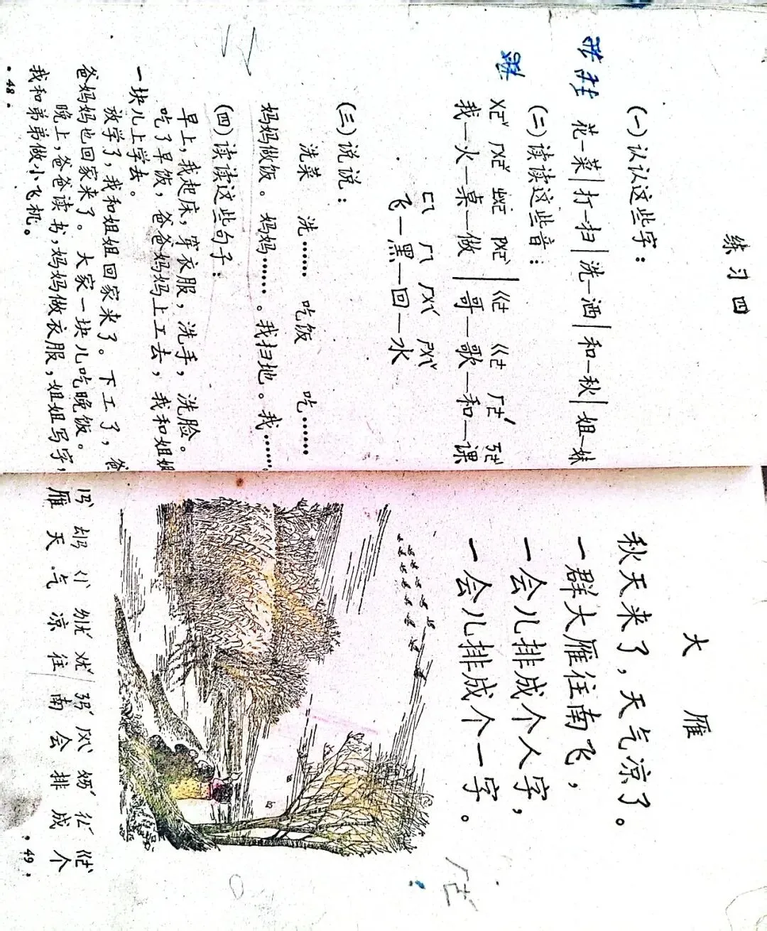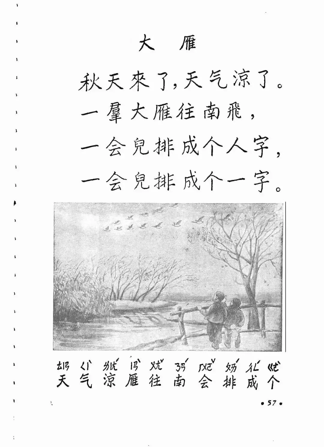 1954年底,邓散木正在上海的里弄里当居委会主任忙得不亦乐乎,接到了书写新版教科书的任务。1955年2月,邓散木正式入职人教社。当时人教社虽然已经汇集了刘继卣等画家,但是作为书法家,尤其是即将面临巨大的文字改革,加入到新版教材编辑的书法家,邓散木还是第一个。由于教材编写阶段正值《汉字简化方案(草案)》发表前后,邓散木为这些工作先后正式书写过两遍,形成了两个版本的手写版。一个版本是草案公布之前,邓散木按照繁体横版的方式写了一遍,这个版本于1955年秋开始试用。1956年1月草案公布之后,汉字出现了515个简体字和54个简化偏旁,邓散木又按照简体横版的形式写了一遍。为了更直观地对比两个版本,周同学选择了第一册中我最喜欢的两篇小文之一的《大雁》来比较一下(另一篇是《小小的船》,但里面繁简变动的字太少了)。