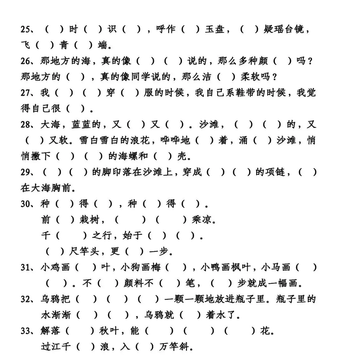 29、(快)(活)的脚印落在沙滩上,穿成(金)(色)的项链,(挂)在大海胸前。