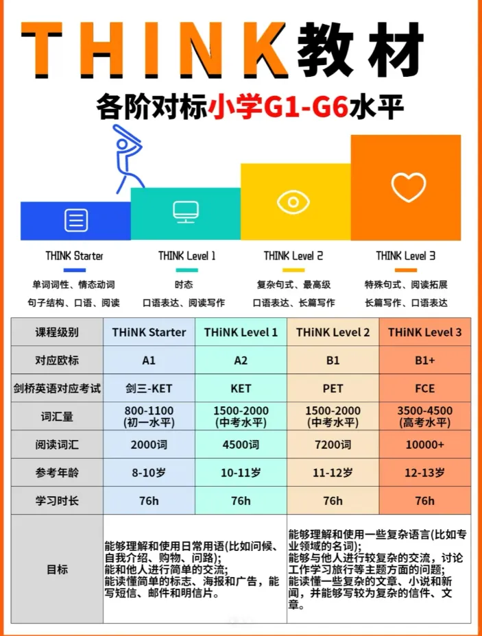 给小学娃选英语教材愁到脱发?怕太简单 “无效学习”、怕太难直接劝退,还想顺便对接剑桥 KET/PET、校内升学?最近家长圈爆火的 THINK 教材,直接把 G1-G6 的分级、对标考试、词汇量甚至学习时长都列得明明白白 —— 今天扒透它的 “真香细节”,娃英语进阶不用瞎试错!