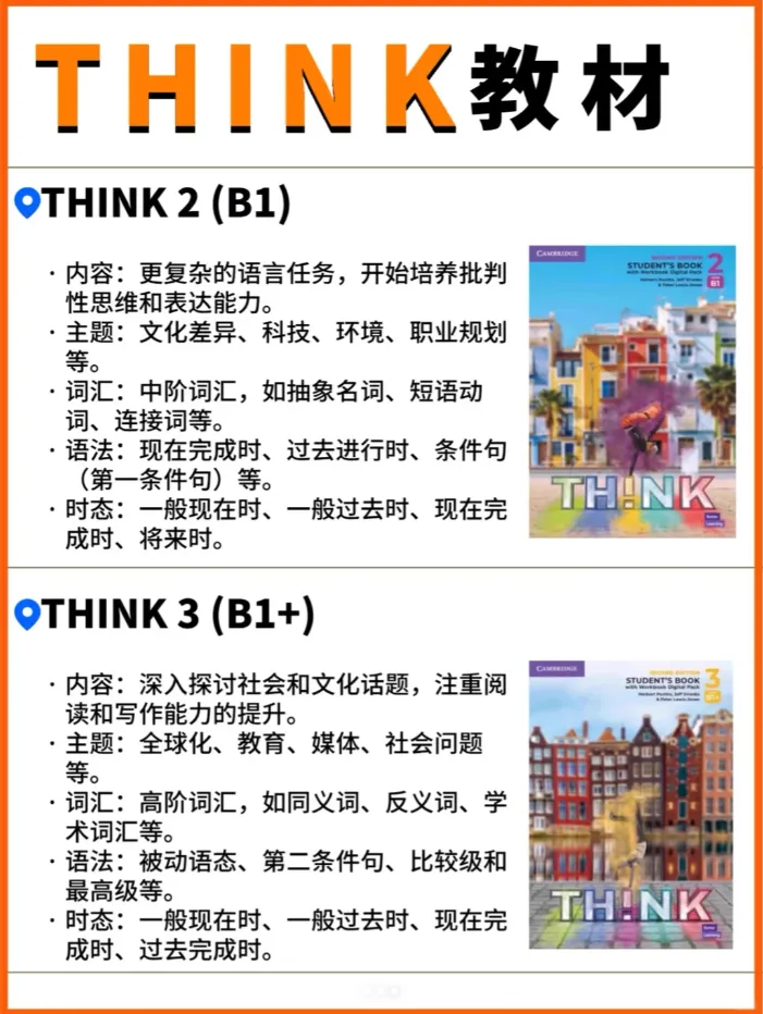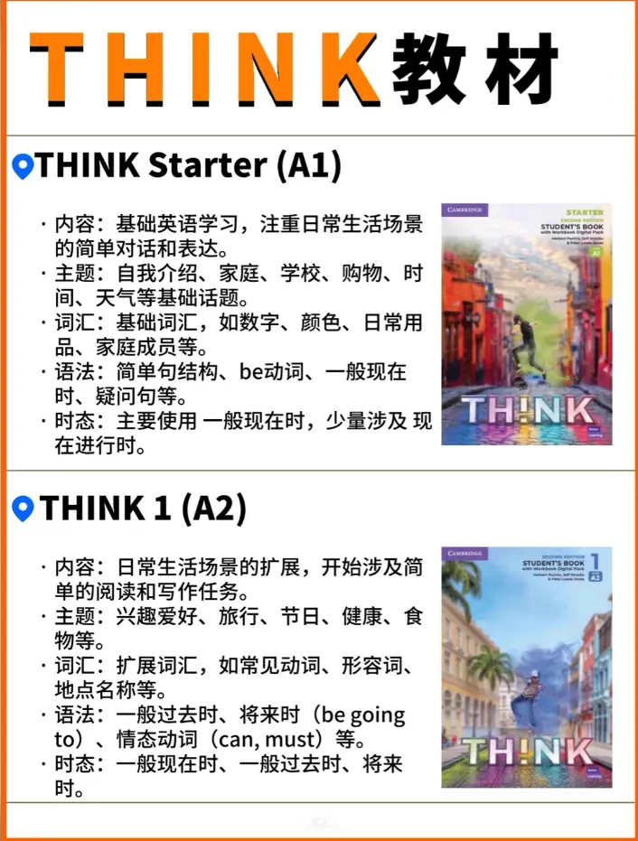这张图把 THINK 的 4 个核心级别(Starter 到 Level3),和小学年龄段、欧标、剑桥考试、校内升学直接挂钩: