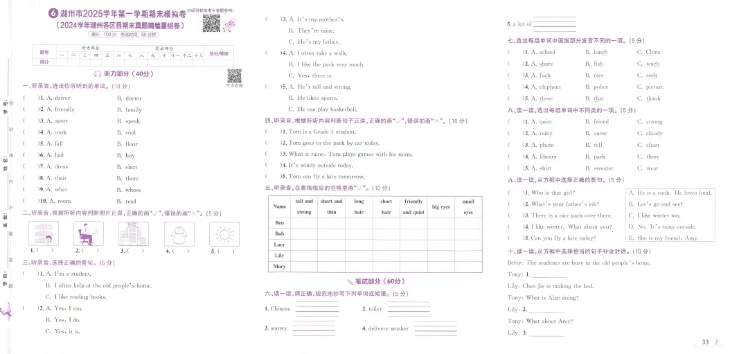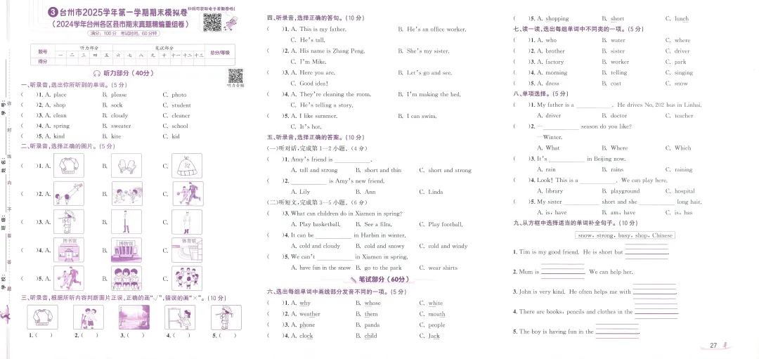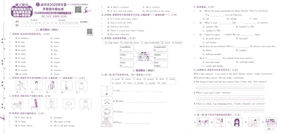 PEP人教版新教材小学英语三上浙版期末真题