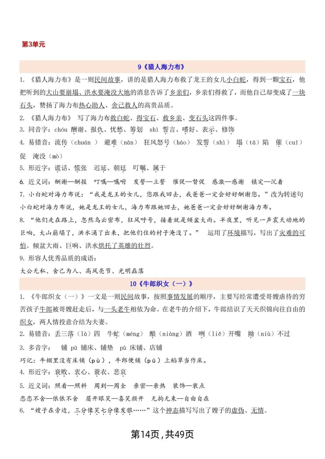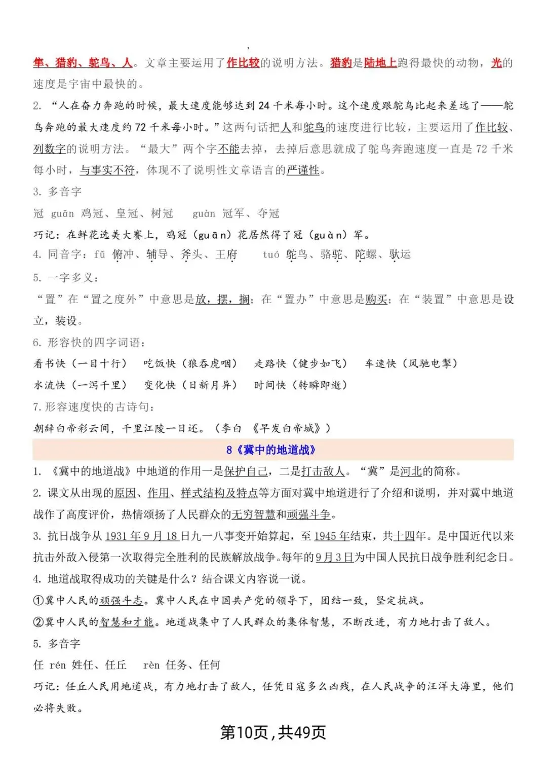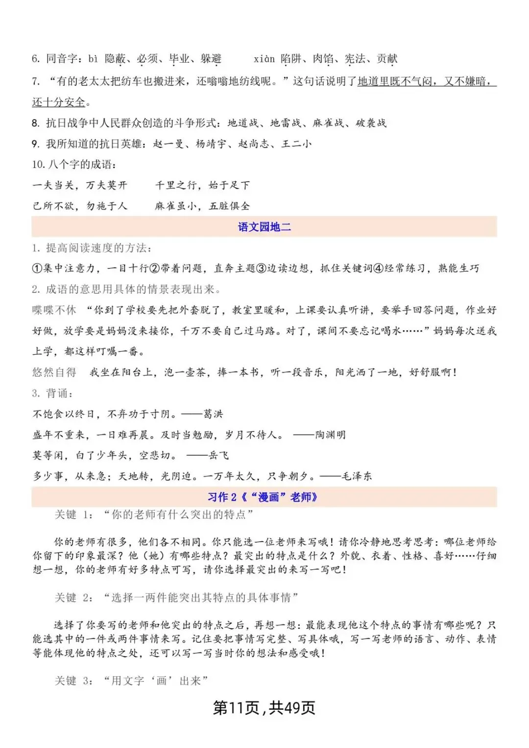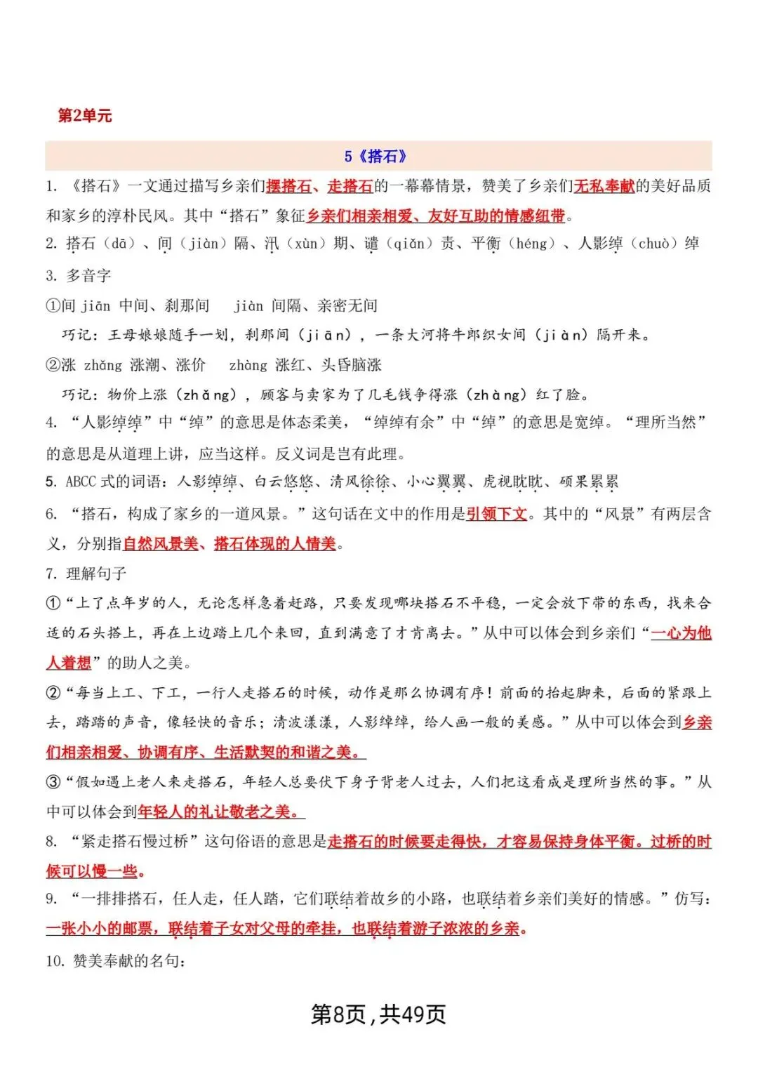【小学语文】五年级(上)语文1-8单元课本详细知识考点