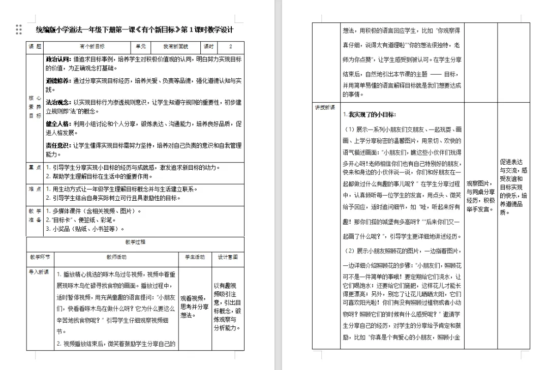 >【道德与法治教案课件】新教材部编版小学道德与法治一年级下册全册核心素养表格配套教案课件(带反思)第1课《有个新目标》