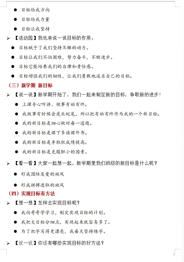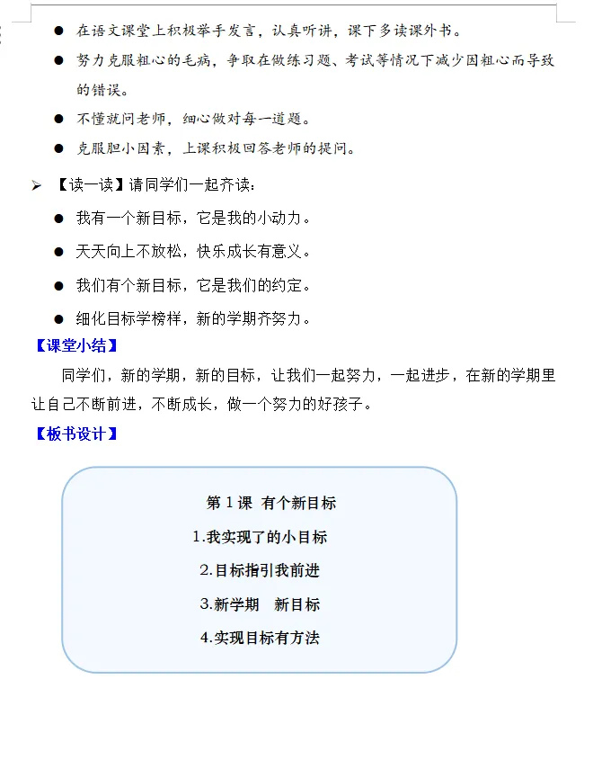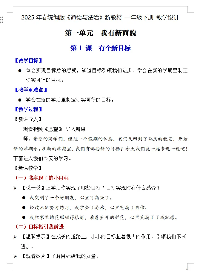 【道德与法治教案课件】新教材部编版小学道德与法治一年级下册全册文本式配套教案课件第1课《有个新目标》