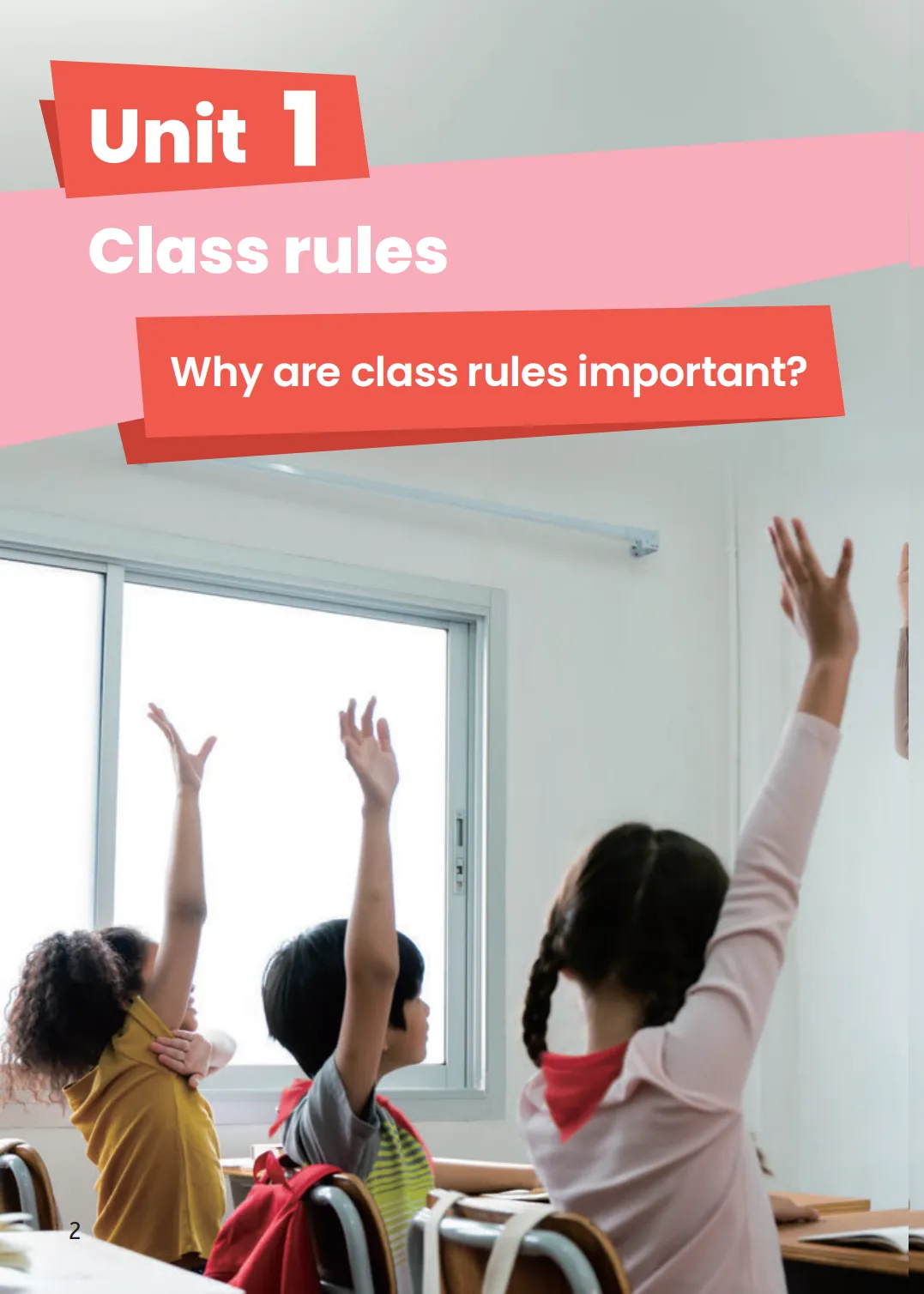 We have some class rules. We put our hand up to speak. We turn off the lights after school. When we don't understand, we say, "Excuse me?"