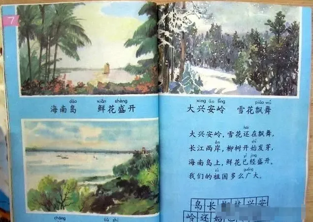 那时候的课本里,是会教我们要热爱祖国的。你看这篇《我们的祖国真大》的课文,是配着一幅我们国家地图的插图的,
