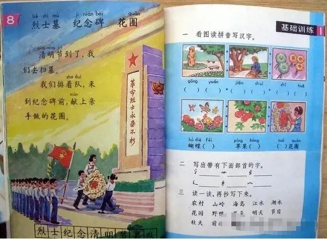 那时候的课本里,是会教我们要热爱劳动的。你看这篇《植树》的课文,是配着一幅孩子们在植树的插图的,