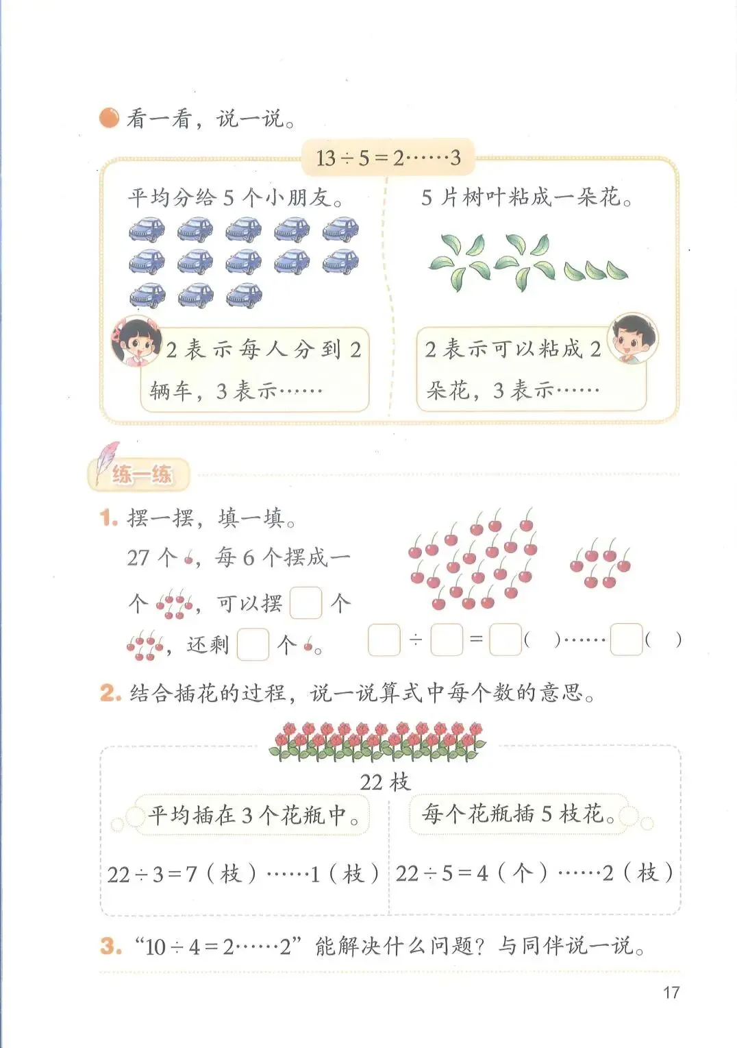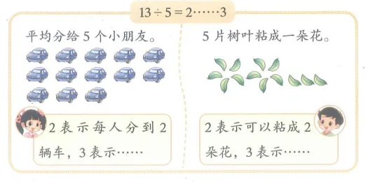 (1)古代分物中的余数:商代人们分粮食时,10袋米分给3户,每户分3袋还剩1袋,这“剩下的1袋”就是余数,是古人解决分物问题的数学智慧。 (2)“余数找朋友”游戏:每人拿12根小棒,分别搭三角形(3根)、正方形(4根),记录余数,找余数相同的同伴,能快速熟悉不同除数下的余数情况。咱们先做几道除法题热热身,看课件上的题目:10÷5、4÷2、30÷6、20÷4、12÷3,大家自己算一算。谁来说说答案?没错,这些都是咱们之前学过的表内除法,正好能分完。那大家能计算“13÷4”吗?这就是咱们今天要学的内容——搭一搭(一)。咱们看课件里的例子:搭一个正方形需要几根小棒?对,4根。现在给大家13根小棒,以小组为单位动手搭一搭,看看能搭几个完整的正方形,还剩几根,顺便用算式把过程和结果记下来。学生1:每搭一个正方形减4根,13-4-4-4=1,减了3次,剩1根,能搭3个。 学生2:3×4=12,13-12=1,搭3个用12根,剩1根。 学生3:13里有几个4,用除法13÷4,但结果怎么表示?这个问题问得好——咱们用“13÷4=3(个)……1(根)”表示,这里剩下的1根叫“余数”,这个算式读作“13除以4等于3余1”。这种没正好分完、有剩余的除法,就是“有余数的除法”。现在对着你们搭的正方形,分组说说算式里每个数的意思吧。学生1:“13”是小棒总数。 学生2:“4”是搭1个正方形要4根。 学生3:“3”是能搭的正方形个数。 学生4:“1”是剩下的小棒。咱们再看课件里的例子,同桌互相说说这两个算式里每个数的意思。学生1:第一幅图里,13是13辆小汽车,5是分给5个小朋友,2是每人分2辆,3是剩3辆。 学生2:第二幅图里,13是13片树叶,5是粘1朵花要5片,2是能粘2朵,3是剩3片。看课件里“练一练”第1题,大家自己先想想,一会儿上台来分享你的解答过程。再看第2题,自己在心里理一理算式各部分的意思,谁来说说你的想法?今天咱们学了有余数的除法,大家说说这节课有什么收获?回家用10根小棒搭三角形(每3根搭1个),写出有余数的除法算式并读出来,和家人说说算式里每个数的意思。用“10÷4=2……2”编一个生活里的分物或搭建问题,明天和小伙伴分享。复习导入能快速衔接旧知,动手搭小棒让学生直观感知余数,小组讨论和分享让学生主动参与理解算式意义。对“余数比除数小”的引导不够,后续可增加不同小棒数量的搭法对比,强化这一规律;同时可增加算式读法的练习,让学生更熟练。点击下方公众号卡片,发送红色关键字