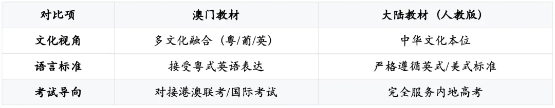特色教材:濠江中学、培正中学等校自编《澳门主题英文读本》(内容含中葡贸易、世遗保育等)。