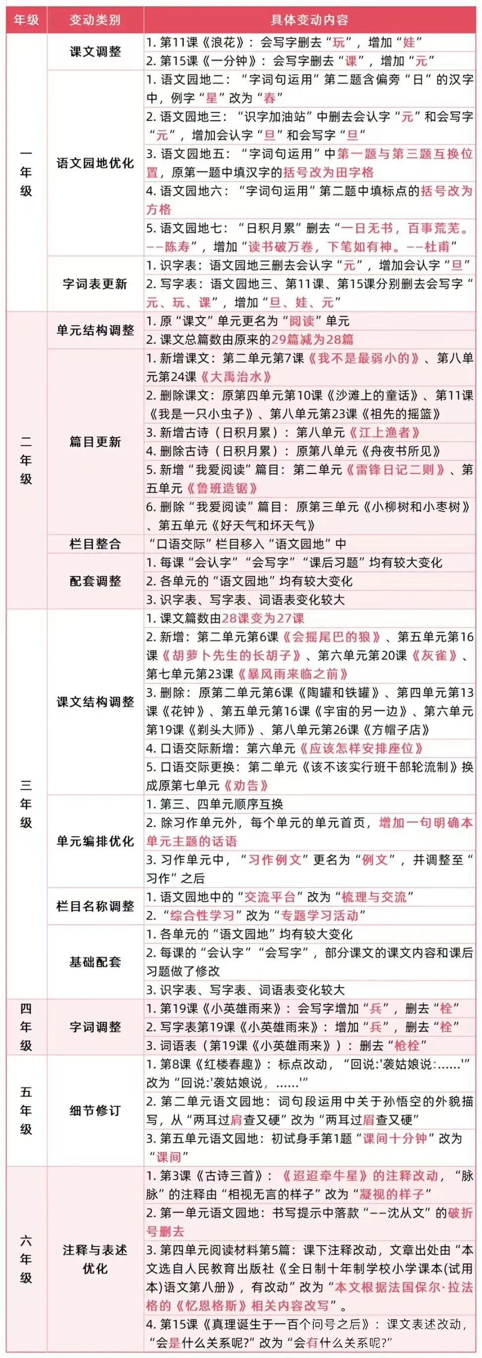课文篇目、会认字、会写字、单元结构、语文园地等核心板块均有调整,各年级都有优化更新,其中三年级变动尤为突出,必须重点关注!