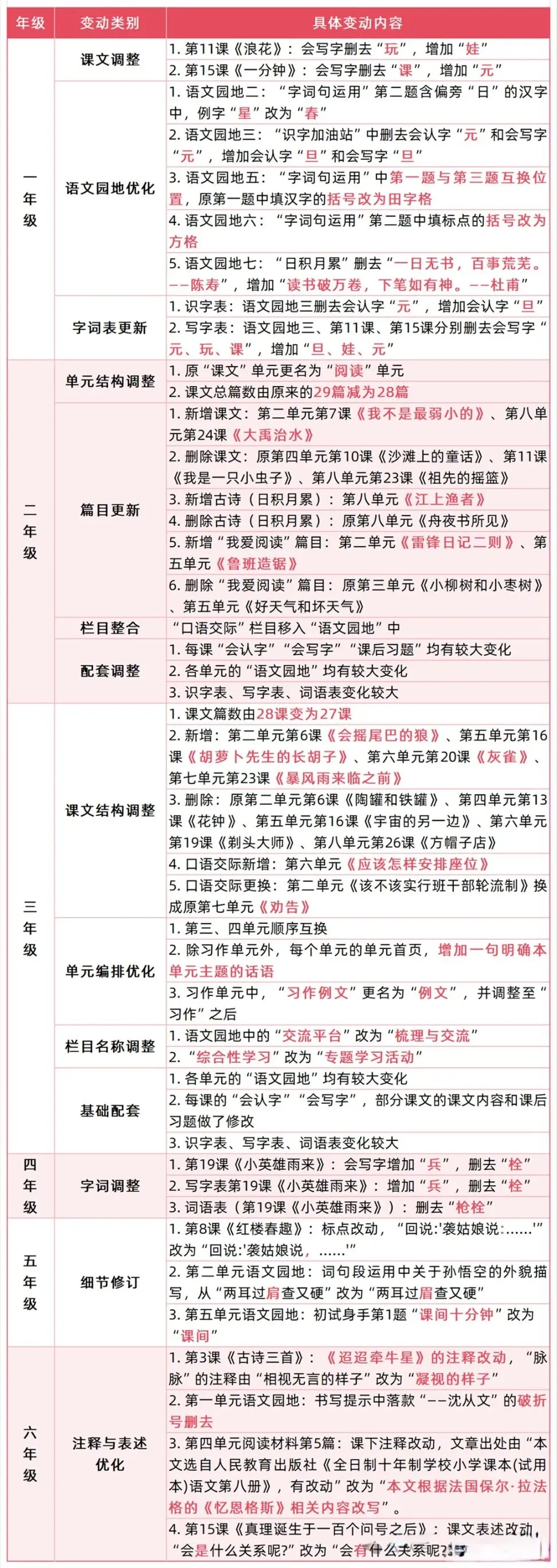2026春小学语文教材又迎来大变动!课文篇目、会认字、会写字、单元结构、语文园地等核心板块均有调整,各年级均有优化更新,具体调整幅度各有不同——其中三年级的变动尤为突出,家长和同学们可重点关注!