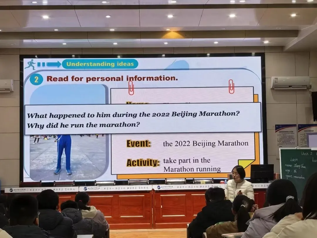 首场活动在五十中学东校西园校区举行。合肥市教育科学研究院英语教研员丹阳莅临指导,活动中,五十中学东校西园校区孙萍老师展示了外研版七年级下册Unit 2 Go For It 中Presenting ideas版块的教学展示。孙萍以创设生活化情境为主线,通过情境创设、互动问答、小组活动等方式调动学生积极性,并初步引导学生通过阅读梳理文本细节,理解主题意义。