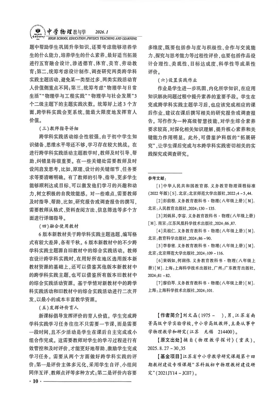 编者按:随着《义务教育物理课程标准(2022 年版)》将"跨学科实践"纳入课程内容,推动学科融合、强化实践育人已成为物理教学的重要导向。近年来,跨学科实践已然成为课程改革的研究热点,引发了广泛的学术关注与教学探索。然而,如何超越形式整合、实现深度实践,仍是广大教师面临的现实挑战。本期专题选文分别从目标设计、任务实施与教材比较等维度展开探讨,共同指向跨学科实践的核心要旨:以素养为导向、以真实问题为牵引、以结构化任务为支撑,推动学生学习方式向探究性、协同性、创造型转变。希望能为一线教师打开实践思路,在教学中真正实现跨学科学习的育人价值。