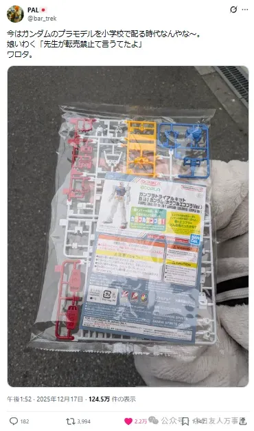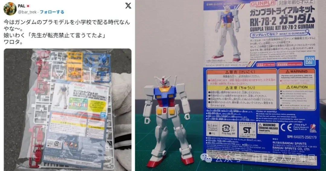 发文引起关注的推主表示,女儿放学回家后,拿给他看学校发的教材,居然是《机动战士钢弹》的RX-78-2初代钢弹钢普拉,也忍不住感叹:「现在已经是小学会发钢弹模型的时代了啊~」,甚至女儿还跟他说道:「老师说这个禁止转售喔。」,让他不禁一笑。