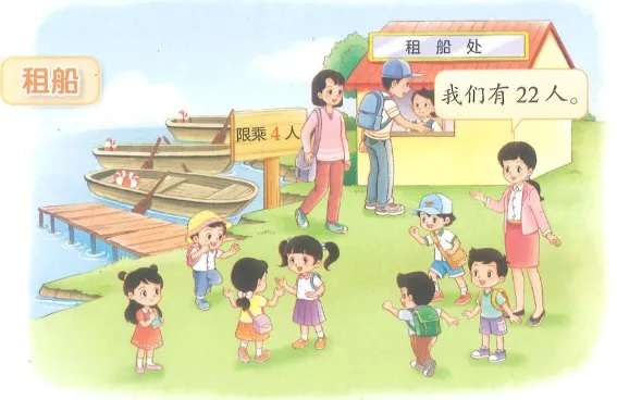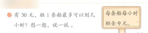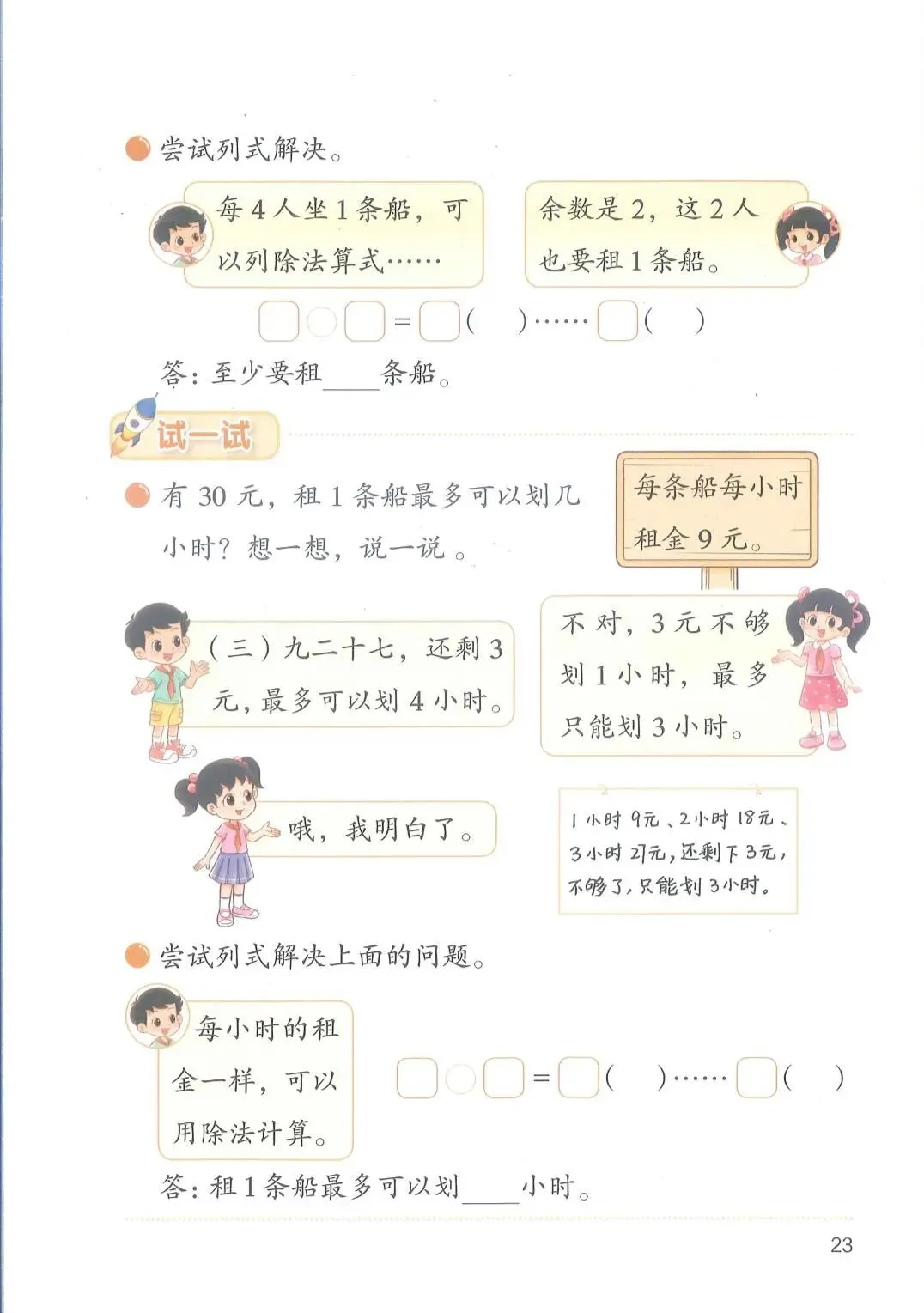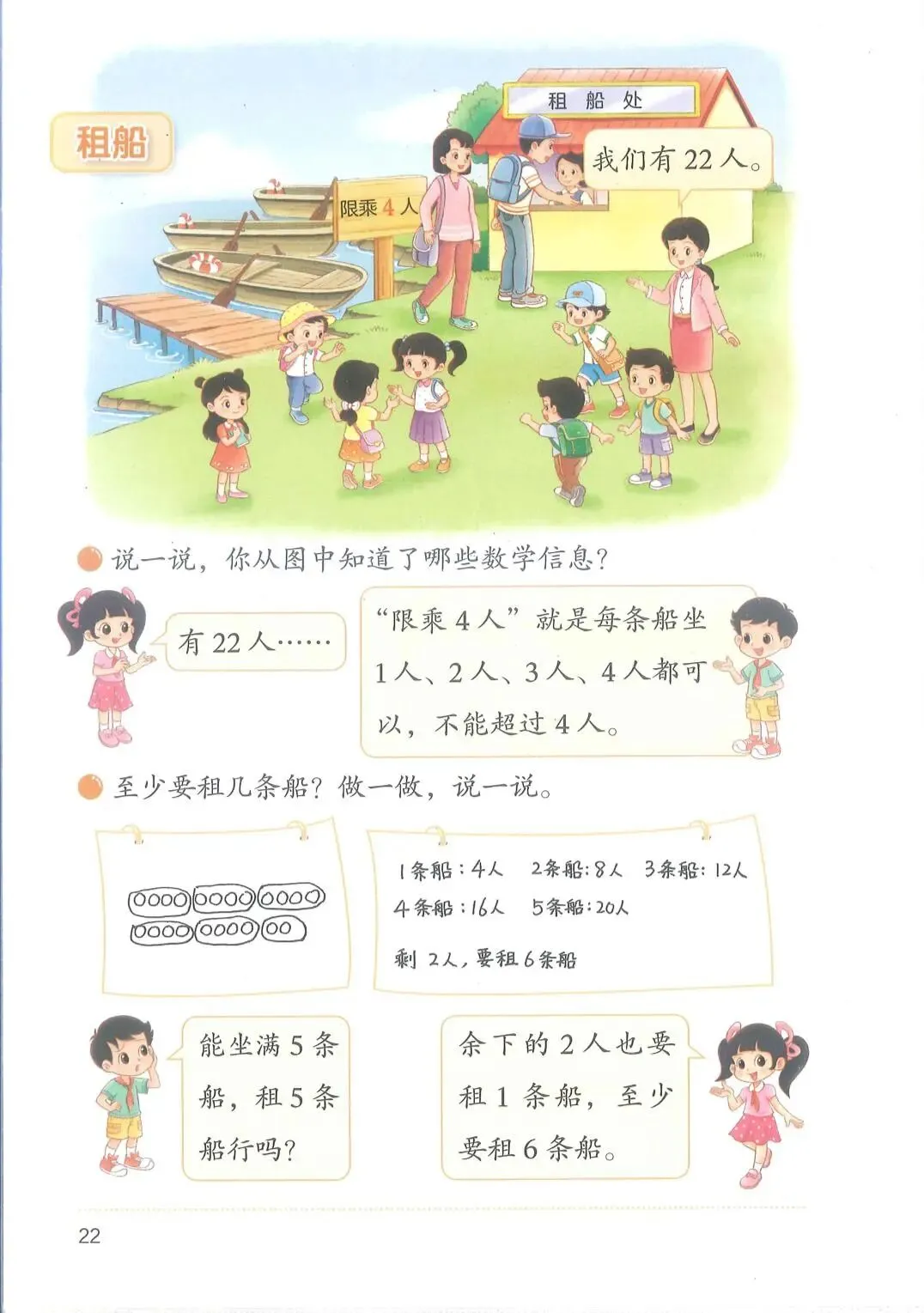 能从租船、划船的生活情境图中,清晰提取“22人、限乘4人”“30元、每小时9元”等关键信息,感知数学与生活的紧密联系。通过画图、列举、列式等方式,形成“进一法”“去尾法”的解题思路,能根据实际情境灵活选择策略,提升问题分析能力。能准确描述“进一”“去尾”的理由,比如“剩下的2人得再租1条船”“剩下的3元不够1小时租金”,清晰表达解题思考过程。(1)结合租船情境,理解“至少”的含义,能用“进一法”解决“22人租限乘4人的船,至少需要几条”的问题,掌握列式方法; (2)结合划船付费情境,理解“最多”的含义,能用“去尾法”解决“30元租每小时9元的船,最多能划几小时”的问题,区分两种策略差异; (3)愿意参与小组讨论和实践操作,能运用所学知识解决生活中类似的实际问题,增强应用意识。掌握“进一法”和“去尾法”,能用有余数的除法正确解决对应的实际问题。根据情境判断何时用“进一法”(剩余部分需额外满足需求)、何时用“去尾法”(剩余部分无法满足1份需求)。从试商复习导入租船(1),通过操作探究“进一法”;衔接上节课内容导入租船(2),辨析“最多”含义探索“去尾法”;对比两种策略,结合教材练习巩固,深化理解。租船情境图课件(含22人租船、30元划船图示)、教材P24“练一练”题目投影、两种解题策略对比卡片。小棒(22根,模拟人数)、圆片(30个,模拟钱数)、练习本(用于画图、列式)。- 进一法(至少租几条):22÷4=5(条)……2(人) 5+1=6(条)
