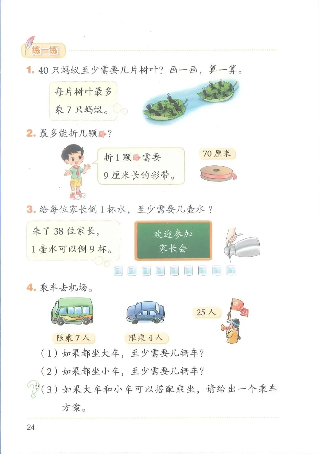 (1)“租船安全小知识”:租船时“限乘人数”是安全标准,超员易发生危险,所以剩余1人也要再租1条船,呼应“进一法”的实际意义。 (2)“策略猜一猜”游戏:说出生活场景(如“分蛋糕剩2块”“租车剩3人”),学生快速判断用“进一法”还是“去尾法”,强化场景辨析。咱们先做几道试商小练习,看课件上的题目:( )×6<55、7×( )<24、5×( )<31,大家自己想一想,举手告诉我答案。做得真不错!上节课我们学会了有余数除法的计算,今天这节课,咱们就用它来解决生活里的租船问题——先看第一部分,租船(1)。大家看课件里的租船图,是不是和咱们去公园游玩租船的样子很像?仔细观察这张租船图,大家能找到哪些和数学有关的信息?慢慢说,不用着急。学生1:图里一共有22人要租船。 学生2:每条船上面写着“限乘4人”。大家观察得真仔细!那“限乘4人”是什么意思呀?有没有同学知道? 学生:就是每条船最多坐4人,不能超过4人,不然会不安全。说得特别对,“限乘4人”是安全规定,绝对不能超员。那现在问题来了:这22人至少要租几条船?“至少”就是最少需要几条船,还得保证每个人都能坐上船,不落下任何人。现在请大家拿出小棒,每4根摆成一组,代表1条船,看看22根小棒能摆成几组,还剩几根。摆完之后和同桌互相说说你的发现。谁愿意分享一下自己的摆法和结果? 学生1:我摆了5组,每组4根,还剩下2根小棒。这说明5条船能坐20人,还剩下2人没船坐。 学生2:我们组用列举法,1条船坐4人,2条坐8人……5条坐20人,剩下的2人也得坐船,所以得再租1条。你们说得都特别有道理!剩下的2人虽然坐不满1条船,但也得给他们租1条,不然就没法一起划船了。那咱们能用算式把这个过程表示出来吗?小组讨论一下怎么列式。学生:22÷4=5(条)……2(人),5+1=6(条)。太准确了!这里的5是能坐满的船数,2是剩下的人数,因为剩下的人也需要船,所以要在商的基础上加1,这种解决问题的方法就叫“进一法”。大家一起读一遍“进一法”,记住这个新朋友。现在我们来做两道练习题,巩固一下“进一法”。看课件里教材P24“练一练”第1题:40只蚂蚁搬东西,每片树叶最多乘7只,至少需要几片树叶?大家自己用画图的方式解决,画完后和同桌说说你为什么这么算。一会儿我请同学来分享答案和思路。再看第3题:有38位家长来参加家长会,给每位家长倒1杯水,1壶水可以倒9杯,至少需要几壶水?大家独立列式计算,写完举手告诉我结果。(检查学生列式,强调“剩下的家长也需要1壶水,所以要用商加1”)上节课我们学会了用“进一法”解决租船问题,剩下的人得再租1条船。今天这节课,咱们继续研究租船的另一个问题——租船(2)。大家看课件里的划船图,这次的问题和钱有关,我们一起来看看。仔细看这张图,大家能找到哪些数学信息?要解决的问题是什么? 学生1:每条船每小时租金9元。 学生2:一共有30元钱。 学生3:要解决的问题是“30元租一条船最多可以划几小时”。那“最多”是什么意思呀?大家讨论一下,发表自己的看法。 学生1:“最多”就是能划的最长时间,把钱尽量花完。 学生2:我觉得是不能超过30元,能划几小时就划几小时。 学生3:如果剩下的钱不够1小时的租金,就不能再划了。大家的想法都有道理,咱们重点看看第三种说法。上节课租船时,剩下的人得租船,所以要加1;那这里剩下的钱不够1小时租金,还能加1吗?请大家拿出圆片,每9个摆成一组,代表1小时的租金,看看30个圆片能摆成几组,还剩几个。摆完之后和小组同学讨论:最多能划几小时?谁来分享一下自己的操作结果和想法? 学生1:我摆了3组,每组9个,还剩下3个圆片。3组代表3小时,花了27元,剩下3元。 学生2:剩下的3元不够再买1小时的租金,所以不能再划了,最多能划3小时。 学生3:我们组用列表法,1小时9元,2小时18元,3小时27元,4小时需要36元,36元超过30元了,所以最多划3小时。大家分析得特别透彻!剩下的3元不够1小时的租金,不能再划了,所以余数要直接去掉,只看商就行。那怎么列式呢? 学生:30÷9=3(时)……3(元),最多能划3小时。这种解决问题的方法就叫“去尾法”,剩下的钱不够满足1份需求,就把余数去掉。大家一起读一遍“去尾法”,和“进一法”对比一下。现在我们来做教材P24“练一练”第2题:70厘米长的彩带,折1颗星星需要9厘米,最多能折几颗星星?大家独立列式计算,写完后和同桌说说:为什么这里要用“去尾法”,不能加1?(指名回答,强调“剩下的彩带不够折1颗星星,所以要去掉余数”)今天我们学习了两种解决有余数除法实际问题的方法,大家还记得是什么吗?对,是“进一法”和“去尾法”。什么时候用“进一法”呀?对,剩下的部分能满足1份需求,比如剩下的人要坐船、剩下的家长要喝水,就需要加1;什么时候用“去尾法”呢?剩下的部分不够满足1份需求,比如剩下的钱不够租1小时船、剩下的彩带不够折1颗星星,就去掉余数。生活里还有很多这样的问题,希望大家能用数学的眼睛去发现,用今天学的方法去解决。回家后和家长一起讨论两个问题:①25个苹果,每盘放6个,至少需要几个盘子?②17元买笔记本,每本5元,最多能买几本?把你的解题思路讲给家长听。自己编一个用“进一法”或“去尾法”的生活小故事,明天上课和小伙伴分享,让大家帮你解决故事里的问题。用生活情境图导入,结合小棒、圆片操作,让学生直观理解两种策略;通过对比“至少”“最多”的含义,帮