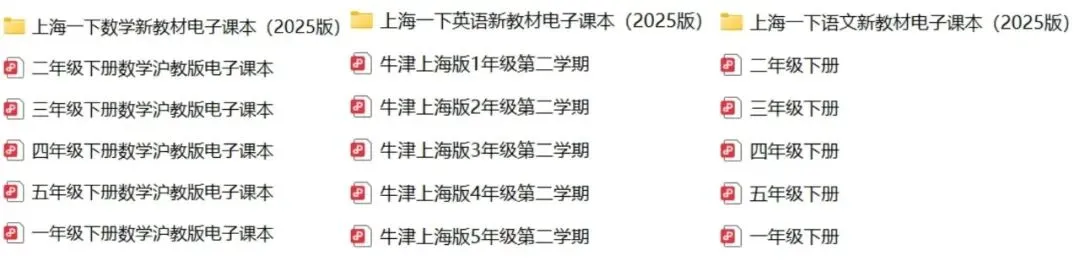 舟舟为大家准备了【上海1-5年级下册语数英电子课本】,一年级聚焦基础字词和20以内加减法,二年级强化句子表达和乘法口诀,三至五年级则同步覆盖课文理解、方程运算、时态运用等重难点,完全贴合上海本地教学进度。