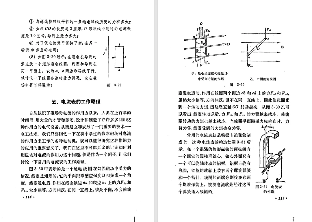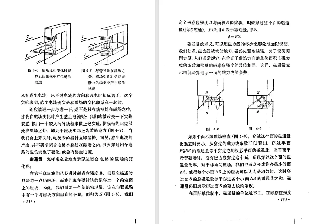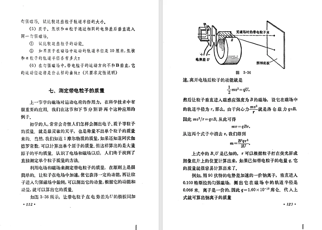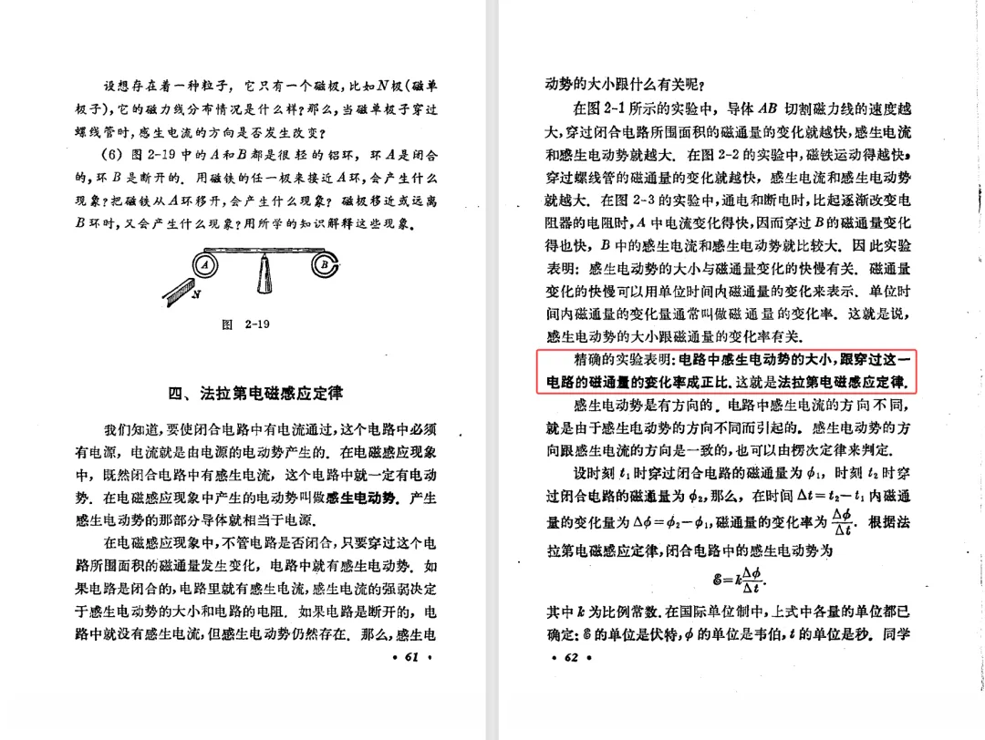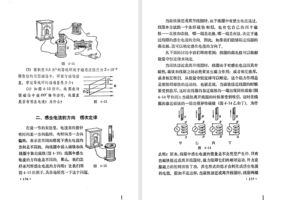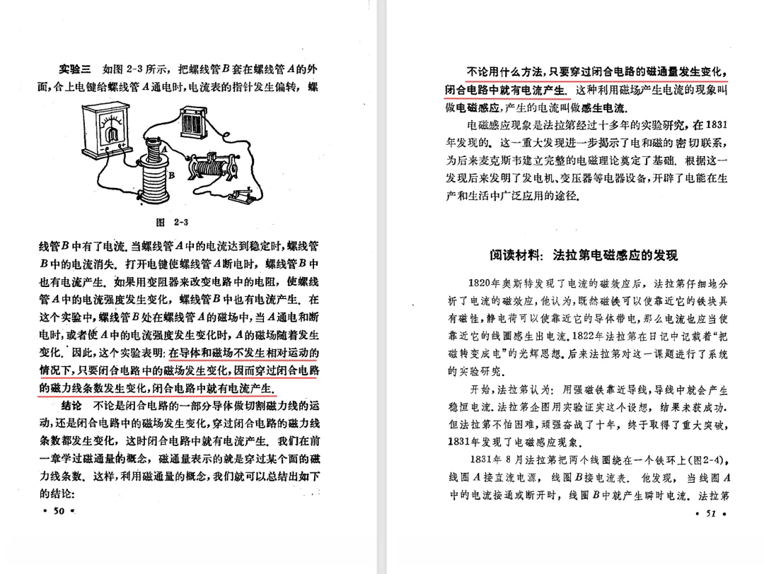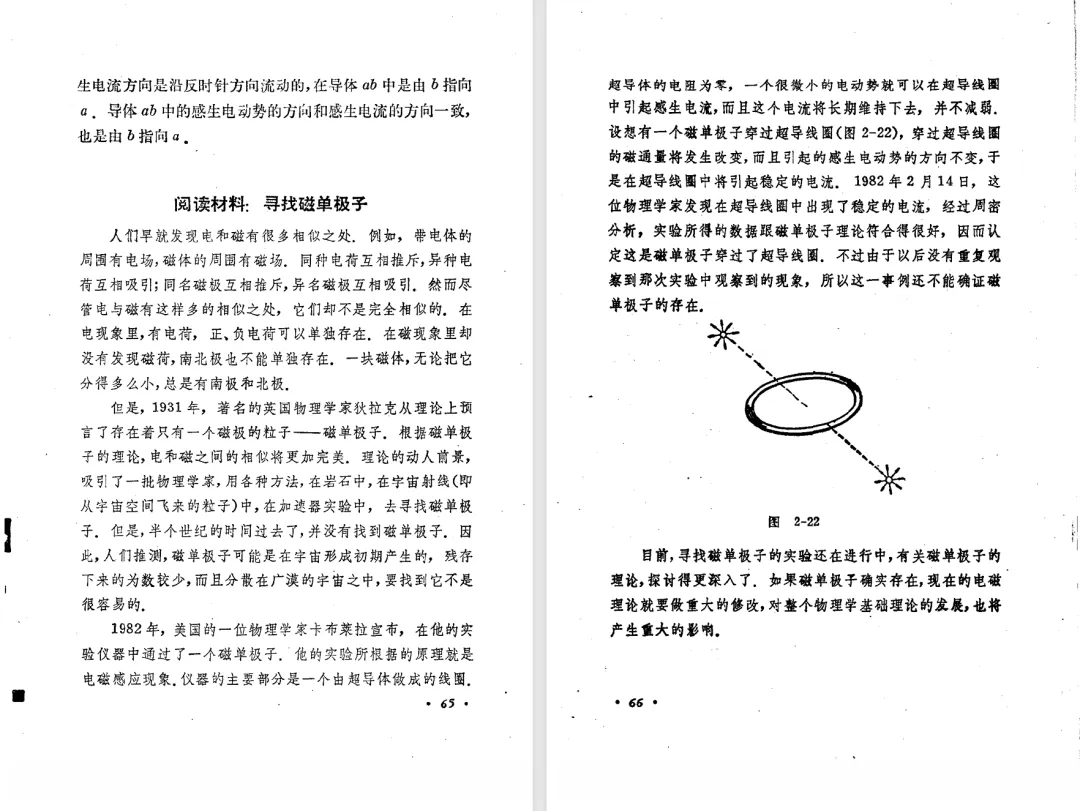 本文对高级中学课本 物理 甲种本 第三册进行详细介绍。本文将物理甲种本与上一版全日制十年制学校高中物理课本(简称旧教材)对比,展示两版教材的差异,从而了解教学要求和教材编写方式和风格的改变。先对比旧教材和甲种本的目录。甲种本同样对旧教材的小节做了拆分。甲种本前三节对应旧教材第一节。甲种本第五节磁通量在旧教材是在电磁感应这章的,甲种本第七节第八节对应旧教材第四节。甲种本第十节第十一节对应旧教材第六节。甲种本删除了测定带电粒子的质量,增加荷质比的测定 质谱仪。甲种本把磁通量放在磁场这一章,用一页半的正文进行介绍。教材给出的磁通量计算公式,覆盖了平面与磁力线垂直的情况和平面与磁力线不垂直的情况。旧教材在介绍电磁感应时才介绍磁通量。教材仅给出了平面与磁力线垂直情况下的磁通量计算公式,不垂直的情况仅文字说明,没有给公式。这种旧教材理论性不如甲种本情况是很少见的。回到甲种本。第六节介绍直线电流的磁场,这节内容对应于点电荷的电场。第七节介绍磁场对电流的作用力。安培力的计算实际上是矢量外积运算,但是甲种本给出的是标量形式的公式,然后根据左手定则确定力的方向,旧教材也如此。下图中的阅读材料介绍了物理基本单位安培。国际单位制中,安培是基本单位,电量单位是导出单位,这是比较反直觉的。下面看旧教材。旧教材对直线电流的磁场的介绍非常详细,不仅通过实验探求影响磁场的因素,还在推导出磁场强度公式后给出了一道例题,显然旧教材更重视本节内容,甲种本弱化了。注意,下图第106页的例题中,表示磁感应强度的Ba和Bb是矢量形式的。事实上旧教材物理下册中的矢量表达式已经少很多了,到了电磁学部分,确实有些公式不太方便用矢量形式表示,但是教材还是尽可能地使用矢量表达式。在第四节 磁场对电流的作用力一节,下图第110页的例题,与甲种本阅读材料介绍国际单位制物理基本单位安培的场景是相同的。本节末尾,如下图红框所示,教材提到电流表灵敏度高,可以测量微弱电流,对过载敏感,说白了就是可测量范围小。本节末尾,如下图红框所示,旧教材多了一段话,说明可以将电流表改造成安培表、伏特表、欧姆表。甲种本和旧教材都是先介绍大量程电表的原理,再介绍基本的敏感度高且量程小的电流表。下图红框这段话的存在可以呼应前文,让教材内容更完整。不知道为什么甲种本删掉了这段话。旧教材给出的对应小节讲的是下图的测定的带电粒子的质量。甲种本同样对小节做了拆分。旧教材第二节对应甲种本第二节和第三节。旧教材第三节对应甲种本第四节和第五节。甲种本中直流电动机的反电动势一节的部分内容,在旧教材中出现在稳恒电流一章欧姆定律的应用一节。本章内容新旧教材的编写方式差别非常大,需要进行仔细对比。先看甲种本如何介绍电磁感应现象。教材给出了三个实验,引出利用磁场产生电流的三种方法。注意三个实验的示意图,所用的实验设备和材料是比较常规的。在第51页开头,教材闭合电路产生电流的条件做了总结。后面的阅读材料介绍法拉第如何发现电磁感应现象,也是介绍了物理学历史。再看旧教材。旧教材在第一节通过两个小标题介绍磁场产生电流的方法。第一个小标题,导体和磁场的相对运动,对应甲种本的实验一和实验二。第二个小标题,磁场的变化,对应甲种本的实验三。需要注意的是,旧教材给出的实验示意图比较抽象,可能只有理论上的可行性,如果真的要做这些实验,所用的实验和材料呈现出的样子可能和示意图有较大的差别。相比之下,甲种本的实验有更强的可行性。上图第132页末尾介绍磁通量,甲种本在磁场一章已经介绍了。甲种本的编排方法导致学了磁通量后没有实际应用,让磁通量这个概念相对孤立地存在。下图中第134页,教材总结闭合电路产生电流的条件。回到甲种本。甲种本介绍楞次定律有两个小节,前一个小节介绍楞次定律,后一个小节介绍楞次定律的应用。旧教材花了较大的篇幅介绍引出楞次定律的实验,对于楞次定律的应用篇幅较少。先看第四节,本节一开头,教材就通过现象直接引出法拉第电磁感应定律。然后给出闭合电路感生电动势的计算方法,得出(1)式。接下来研究导体切割磁力线产生的感生电动势的计算方法,得出(3)式。接下来的第五节,教材从能量守恒的角度研究导线切割磁力线所产生的感生电动势。旧教材的介绍法拉第电磁感应定律的方法完全不同。如下图所示,教材以导线切割磁感线过程中的能量守恒原则推导出了导体切割磁感线所得的感生电动势的公式,即(1)式。然后进一步研究磁通量变化率与感生电动势的关系,得出(3)式。进而得出法拉第电磁感应定律。可以看出,旧教材是通过直线导体切割磁感线中的能量守恒关系得出感生电动势的计算方法,进而推导出感生电动势与磁通量变化率成正比这个规律,即法拉第电磁感应定律。而甲种本是先通过简单的定性的实验直接引出法拉第电磁感应定律,再推导直线导体切割磁感线所产生的感生电动势,最后研究直线导体切割磁感线中的能量守恒关系。两个版本教材编排完全是相反的。旧教材体现的是逐步得出法拉第电磁感应定律的过程,甲种本是先给出法拉第电磁感应定律,再研究电磁感应中的一些关系。