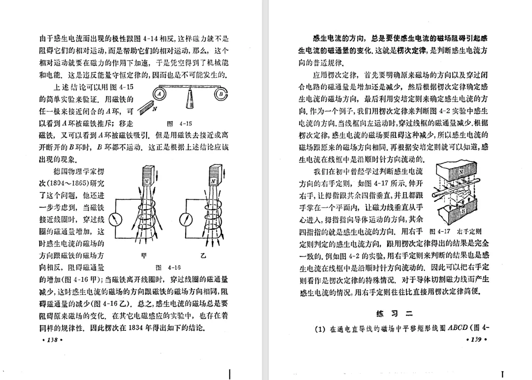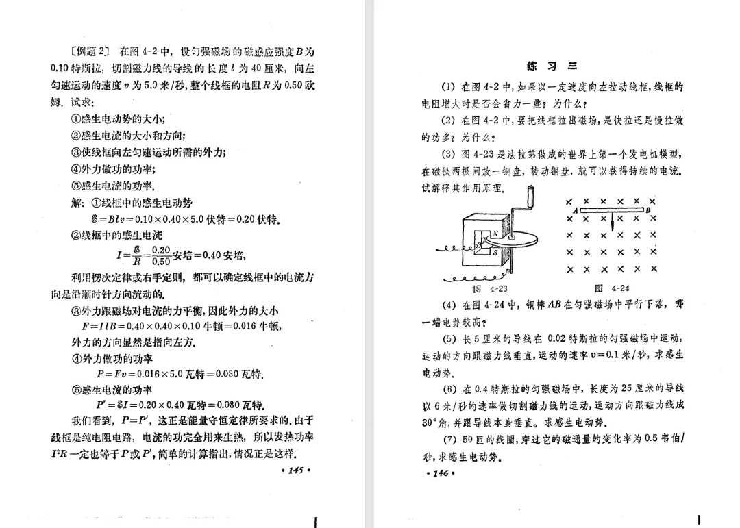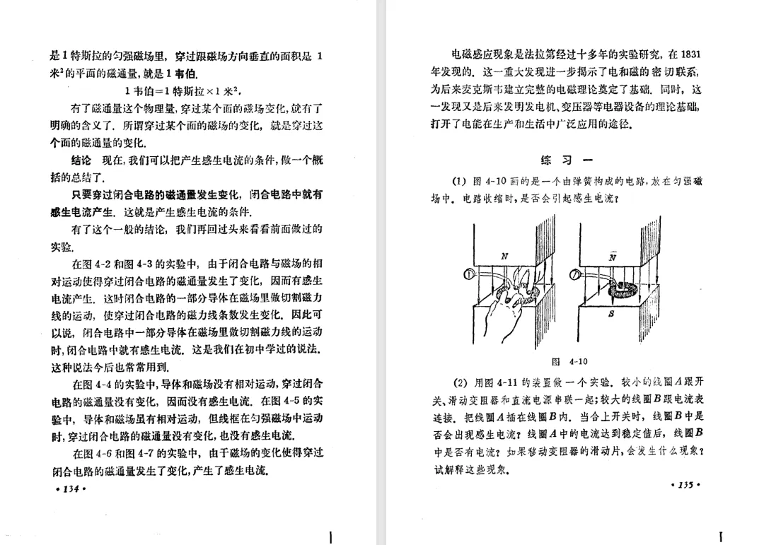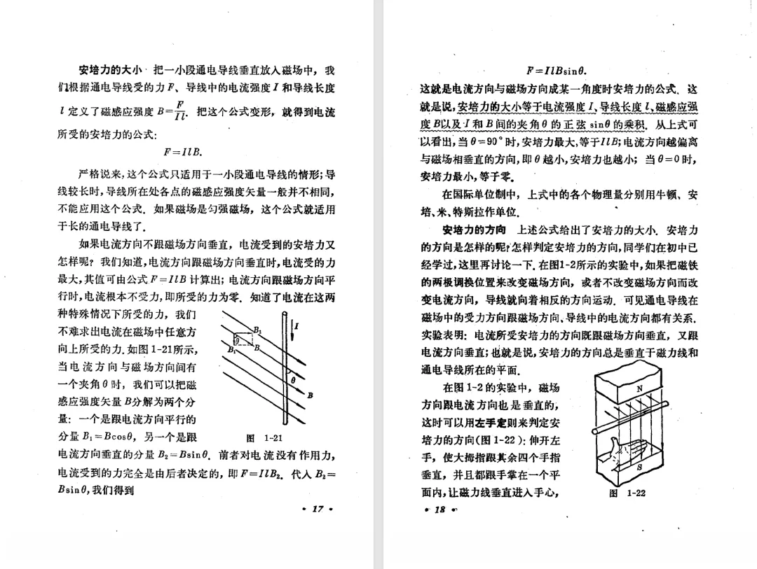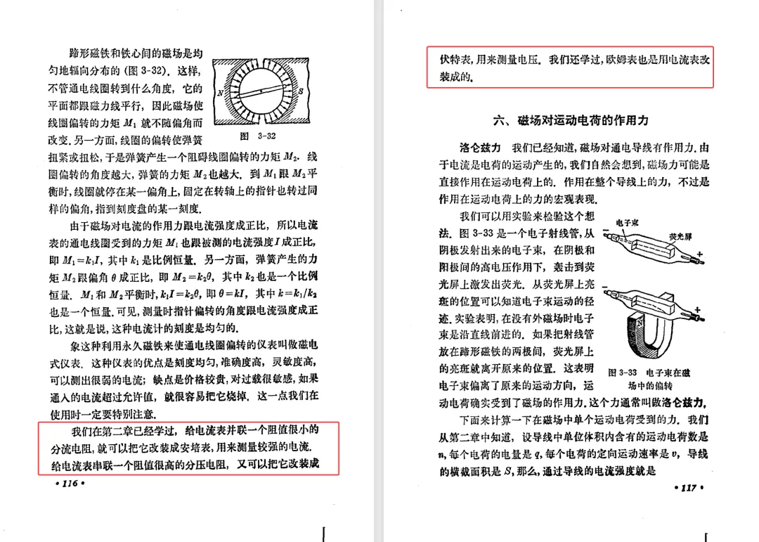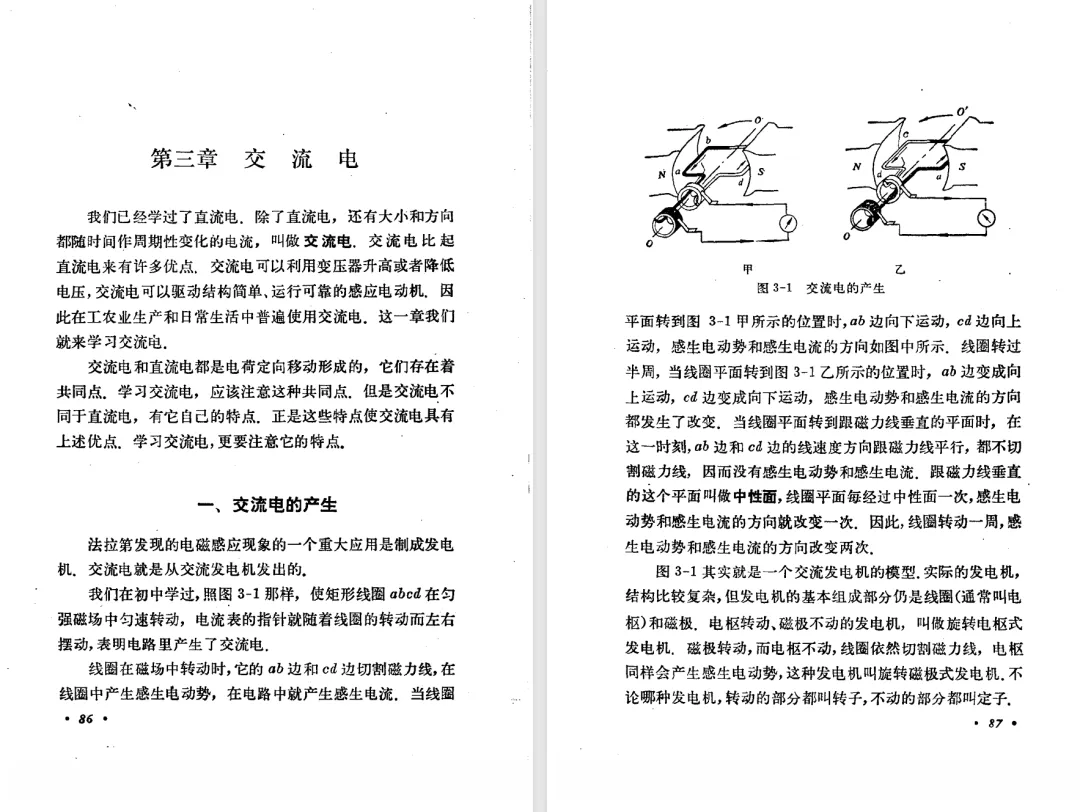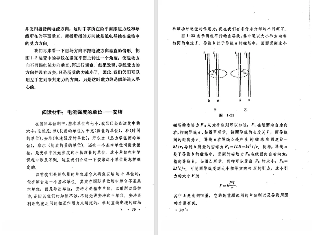 本文对高级中学课本 物理 甲种本 第三册进行详细介绍。本文将物理甲种本与上一版全日制十年制学校高中物理课本(简称旧教材)对比,展示两版教材的差异,从而了解教学要求和教材编写方式和风格的改变。先对比旧教材和甲种本的目录。甲种本同样对旧教材的小节做了拆分。甲种本前三节对应旧教材第一节。甲种本第五节磁通量在旧教材是在电磁感应这章的,甲种本第七节第八节对应旧教材第四节。甲种本第十节第十一节对应旧教材第六节。甲种本删除了测定带电粒子的质量,增加荷质比的测定 质谱仪。甲种本把磁通量放在磁场这一章,用一页半的正文进行介绍。教材给出的磁通量计算公式,覆盖了平面与磁力线垂直的情况和平面与磁力线不垂直的情况。旧教材在介绍电磁感应时才介绍磁通量。教材仅给出了平面与磁力线垂直情况下的磁通量计算公式,不垂直的情况仅文字说明,没有给公式。这种旧教材理论性不如甲种本情况是很少见的。回到甲种本。第六节介绍直线电流的磁场,这节内容对应于点电荷的电场。第七节介绍磁场对电流的作用力。安培力的计算实际上是矢量外积运算,但是甲种本给出的是标量形式的公式,然后根据左手定则确定力的方向,旧教材也如此。下图中的阅读材料介绍了物理基本单位安培。国际单位制中,安培是基本单位,电量单位是导出单位,这是比较反直觉的。下面看旧教材。旧教材对直线电流的磁场的介绍非常详细,不仅通过实验探求影响磁场的因素,还在推导出磁场强度公式后给出了一道例题,显然旧教材更重视本节内容,甲种本弱化了。注意,下图第106页的例题中,表示磁感应强度的Ba和Bb是矢量形式的。事实上旧教材物理下册中的矢量表达式已经少很多了,到了电磁学部分,确实有些公式不太方便用矢量形式表示,但是教材还是尽可能地使用矢量表达式。在第四节 磁场对电流的作用力一节,下图第110页的例题,与甲种本阅读材料介绍国际单位制物理基本单位安培的场景是相同的。本节末尾,如下图红框所示,教材提到电流表灵敏度高,可以测量微弱电流,对过载敏感,说白了就是可测量范围小。本节末尾,如下图红框所示,旧教材多了一段话,说明可以将电流表改造成安培表、伏特表、欧姆表。甲种本和旧教材都是先介绍大量程电表的原理,再介绍基本的敏感度高且量程小的电流表。下图红框这段话的存在可以呼应前文,让教材内容更完整。不知道为什么甲种本删掉了这段话。旧教材给出的对应小节讲的是下图的测定的带电粒子的质量。甲种本同样对小节做了拆分。旧教材第二节对应甲种本第二节和第三节。旧教材第三节对应甲种本第四节和第五节。甲种本中直流电动机的反电动势一节的部分内容,在旧教材中出现在稳恒电流一章欧姆定律的应用一节。本章内容新旧教材的编写方式差别非常大,需要进行仔细对比。先看甲种本如何介绍电磁感应现象。教材给出了三个实验,引出利用磁场产生电流的三种方法。注意三个实验的示意图,所用的实验设备和材料是比较常规的。在第51页开头,教材闭合电路产生电流的条件做了总结。后面的阅读材料介绍法拉第如何发现电磁感应现象,也是介绍了物理学历史。再看旧教材。旧教材在第一节通过两个小标题介绍磁场产生电流的方法。第一个小标题,导体和磁场的相对运动,对应甲种本的实验一和实验二。第二个小标题,磁场的变化,对应甲种本的实验三。需要注意的是,旧教材给出的实验示意图比较抽象,可能只有理论上的可行性,如果真的要做这些实验,所用的实验和材料呈现出的样子可能和示意图有较大的差别。相比之下,甲种本的实验有更强的可行性。上图第132页末尾介绍磁通量,甲种本在磁场一章已经介绍了。甲种本的编排方法导致学了磁通量后没有实际应用,让磁通量这个概念相对孤立地存在。下图中第134页,教材总结闭合电路产生电流的条件。回到甲种本。甲种本介绍楞次定律有两个小节,前一个小节介绍楞次定律,后一个小节介绍楞次定律的应用。旧教材花了较大的篇幅介绍引出楞次定律的实验,对于楞次定律的应用篇幅较少。先看第四节,本节一开头,教材就通过现象直接引出法拉第电磁感应定律。然后给出闭合电路感生电动势的计算方法,得出(1)式。接下来研究导体切割磁力线产生的感生电动势的计算方法,得出(3)式。接下来的第五节,教材从能量守恒的角度研究导线切割磁力线所产生的感生电动势。旧教材的介绍法拉第电磁感应定律的方法完全不同。如下图所示,教材以导线切割磁感线过程中的能量守恒原则推导出了导体切割磁感线所得的感生电动势的公式,即(1)式。然后进一步研究磁通量变化率与感生电动势的关系,得出(3)式。进而得出法拉第电磁感应定律。可以看出,旧教材是通过直线导体切割磁感线中的能量守恒关系得出感生电动势的计算方法,进而推导出感生电动势与磁通量变化率成正比这个规律,即法拉第电磁感应定律。而甲种本是先通过简单的定性的实验直接引出法拉第电磁感应定律,再推导直线导体切割磁感线所产生的感生电动势,最后研究直线导体切割磁感线中的能量守恒关系。两个版本教材编排完全是相反的。旧教材体现的是逐步得出法拉第电磁感应定律的过程,甲种本是先给出法拉第电磁感应定律,再研究电磁感应中的一些关系。