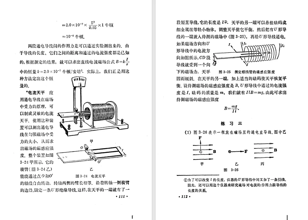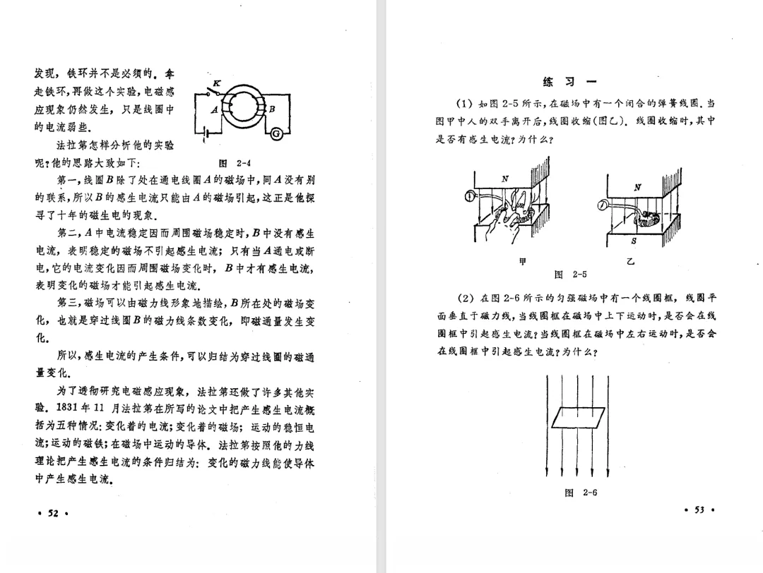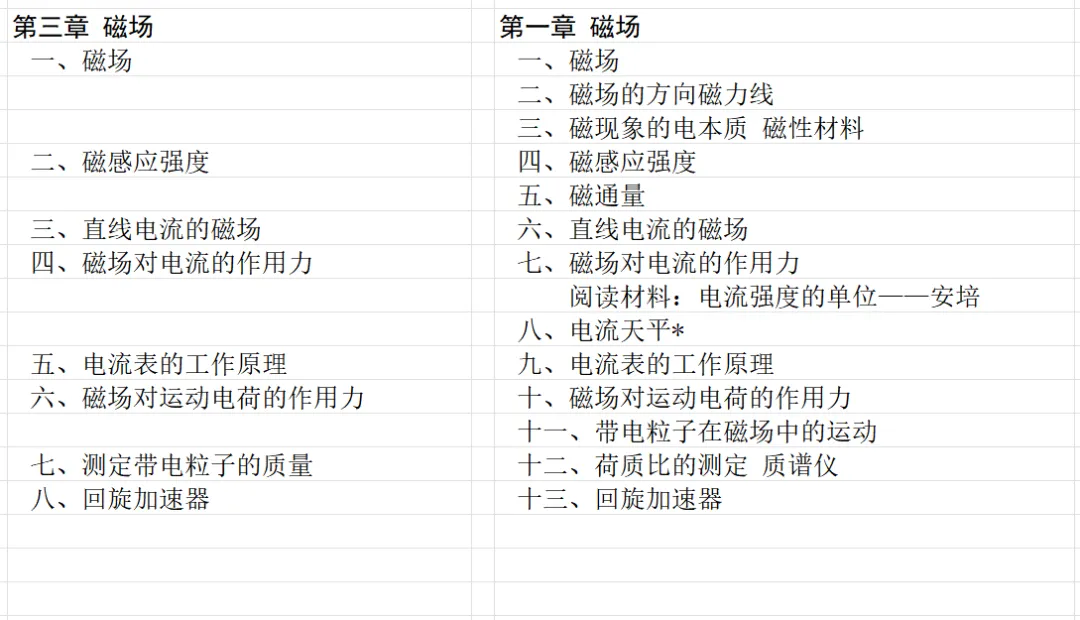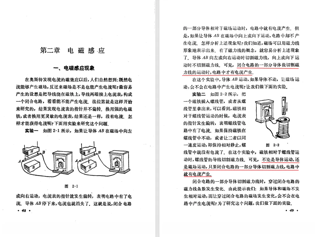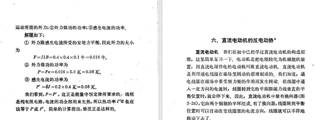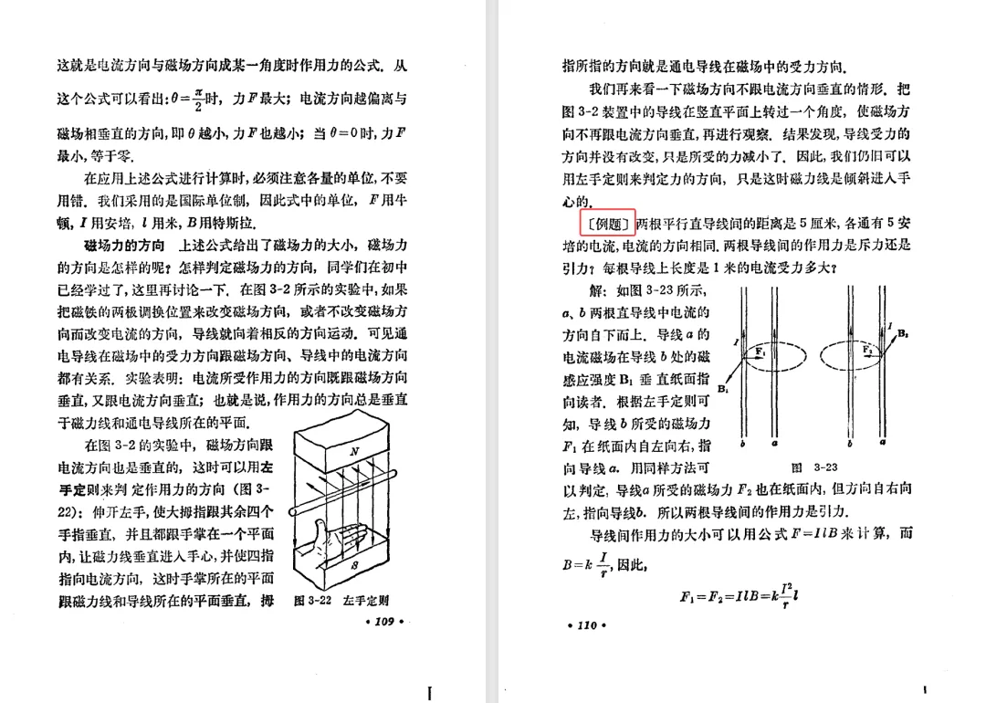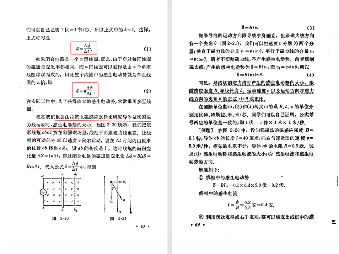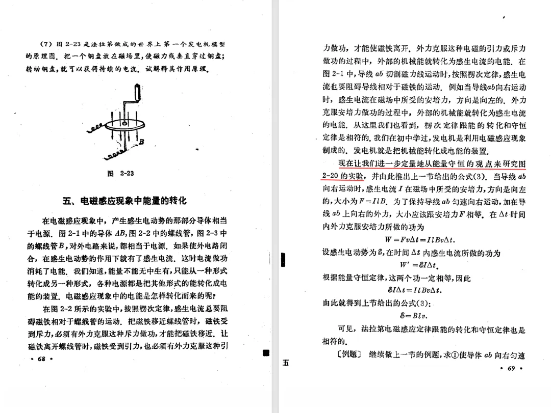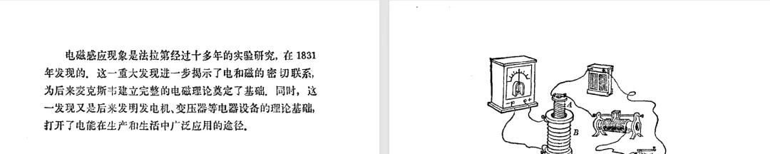 本文对高级中学课本 物理 甲种本 第三册进行详细介绍。本文将物理甲种本与上一版全日制十年制学校高中物理课本(简称旧教材)对比,展示两版教材的差异,从而了解教学要求和教材编写方式和风格的改变。先对比旧教材和甲种本的目录。甲种本同样对旧教材的小节做了拆分。甲种本前三节对应旧教材第一节。甲种本第五节磁通量在旧教材是在电磁感应这章的,甲种本第七节第八节对应旧教材第四节。甲种本第十节第十一节对应旧教材第六节。甲种本删除了测定带电粒子的质量,增加荷质比的测定 质谱仪。甲种本把磁通量放在磁场这一章,用一页半的正文进行介绍。教材给出的磁通量计算公式,覆盖了平面与磁力线垂直的情况和平面与磁力线不垂直的情况。旧教材在介绍电磁感应时才介绍磁通量。教材仅给出了平面与磁力线垂直情况下的磁通量计算公式,不垂直的情况仅文字说明,没有给公式。这种旧教材理论性不如甲种本情况是很少见的。回到甲种本。第六节介绍直线电流的磁场,这节内容对应于点电荷的电场。第七节介绍磁场对电流的作用力。安培力的计算实际上是矢量外积运算,但是甲种本给出的是标量形式的公式,然后根据左手定则确定力的方向,旧教材也如此。下图中的阅读材料介绍了物理基本单位安培。国际单位制中,安培是基本单位,电量单位是导出单位,这是比较反直觉的。下面看旧教材。旧教材对直线电流的磁场的介绍非常详细,不仅通过实验探求影响磁场的因素,还在推导出磁场强度公式后给出了一道例题,显然旧教材更重视本节内容,甲种本弱化了。注意,下图第106页的例题中,表示磁感应强度的Ba和Bb是矢量形式的。事实上旧教材物理下册中的矢量表达式已经少很多了,到了电磁学部分,确实有些公式不太方便用矢量形式表示,但是教材还是尽可能地使用矢量表达式。在第四节 磁场对电流的作用力一节,下图第110页的例题,与甲种本阅读材料介绍国际单位制物理基本单位安培的场景是相同的。本节末尾,如下图红框所示,教材提到电流表灵敏度高,可以测量微弱电流,对过载敏感,说白了就是可测量范围小。本节末尾,如下图红框所示,旧教材多了一段话,说明可以将电流表改造成安培表、伏特表、欧姆表。甲种本和旧教材都是先介绍大量程电表的原理,再介绍基本的敏感度高且量程小的电流表。下图红框这段话的存在可以呼应前文,让教材内容更完整。不知道为什么甲种本删掉了这段话。旧教材给出的对应小节讲的是下图的测定的带电粒子的质量。甲种本同样对小节做了拆分。旧教材第二节对应甲种本第二节和第三节。旧教材第三节对应甲种本第四节和第五节。甲种本中直流电动机的反电动势一节的部分内容,在旧教材中出现在稳恒电流一章欧姆定律的应用一节。本章内容新旧教材的编写方式差别非常大,需要进行仔细对比。先看甲种本如何介绍电磁感应现象。教材给出了三个实验,引出利用磁场产生电流的三种方法。注意三个实验的示意图,所用的实验设备和材料是比较常规的。在第51页开头,教材闭合电路产生电流的条件做了总结。后面的阅读材料介绍法拉第如何发现电磁感应现象,也是介绍了物理学历史。再看旧教材。旧教材在第一节通过两个小标题介绍磁场产生电流的方法。第一个小标题,导体和磁场的相对运动,对应甲种本的实验一和实验二。第二个小标题,磁场的变化,对应甲种本的实验三。需要注意的是,旧教材给出的实验示意图比较抽象,可能只有理论上的可行性,如果真的要做这些实验,所用的实验和材料呈现出的样子可能和示意图有较大的差别。相比之下,甲种本的实验有更强的可行性。上图第132页末尾介绍磁通量,甲种本在磁场一章已经介绍了。甲种本的编排方法导致学了磁通量后没有实际应用,让磁通量这个概念相对孤立地存在。下图中第134页,教材总结闭合电路产生电流的条件。回到甲种本。甲种本介绍楞次定律有两个小节,前一个小节介绍楞次定律,后一个小节介绍楞次定律的应用。旧教材花了较大的篇幅介绍引出楞次定律的实验,对于楞次定律的应用篇幅较少。先看第四节,本节一开头,教材就通过现象直接引出法拉第电磁感应定律。然后给出闭合电路感生电动势的计算方法,得出(1)式。接下来研究导体切割磁力线产生的感生电动势的计算方法,得出(3)式。接下来的第五节,教材从能量守恒的角度研究导线切割磁力线所产生的感生电动势。旧教材的介绍法拉第电磁感应定律的方法完全不同。如下图所示,教材以导线切割磁感线过程中的能量守恒原则推导出了导体切割磁感线所得的感生电动势的公式,即(1)式。然后进一步研究磁通量变化率与感生电动势的关系,得出(3)式。进而得出法拉第电磁感应定律。可以看出,旧教材是通过直线导体切割磁感线中的能量守恒关系得出感生电动势的计算方法,进而推导出感生电动势与磁通量变化率成正比这个规律,即法拉第电磁感应定律。而甲种本是先通过简单的定性的实验直接引出法拉第电磁感应定律,再推导直线导体切割磁感线所产生的感生电动势,最后研究直线导体切割磁感线中的能量守恒关系。两个版本教材编排完全是相反的。旧教材体现的是逐步得出法拉第电磁感应定律的过程,甲种本是先给出法拉第电磁感应定律,再研究电磁感应中的一些关系。