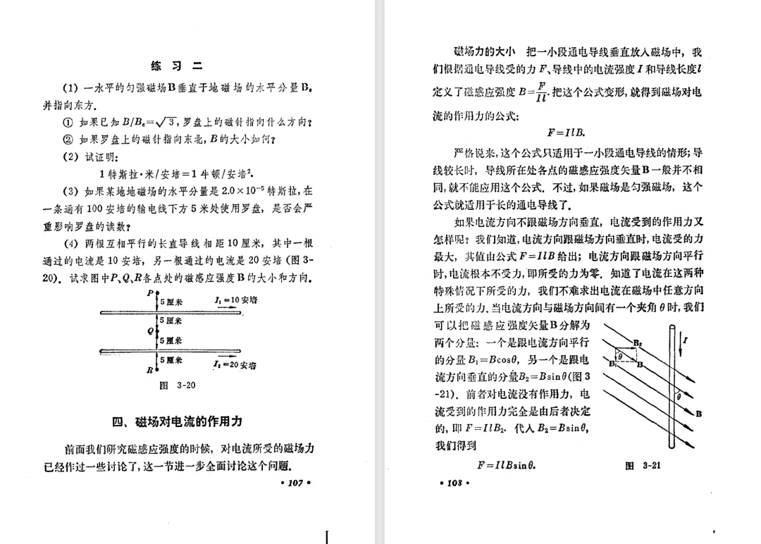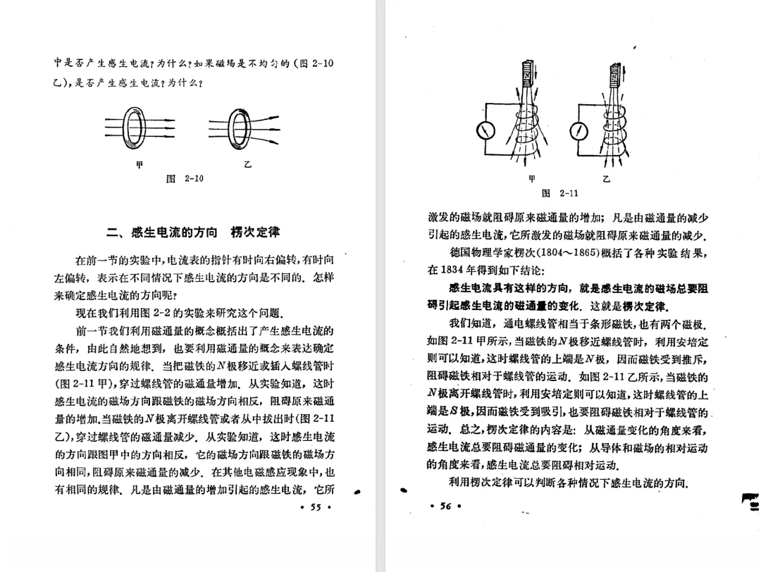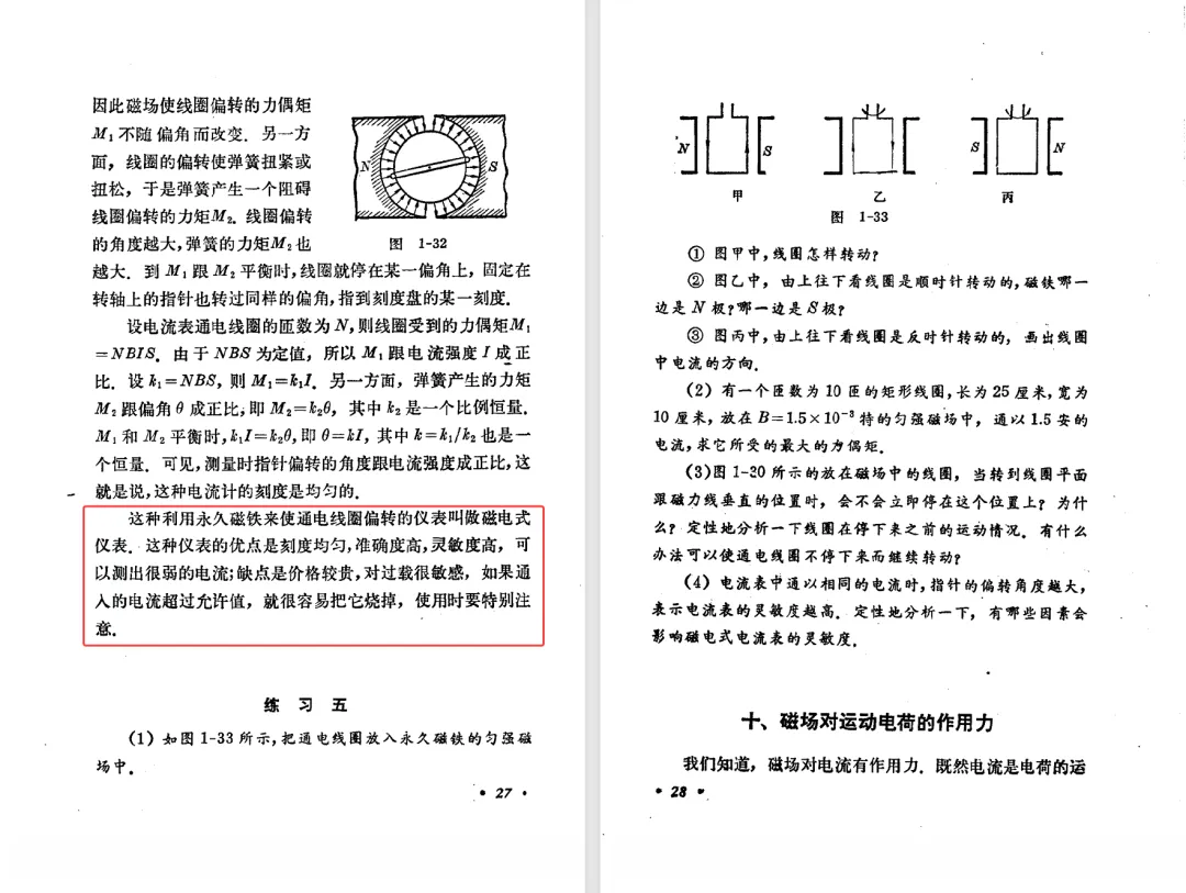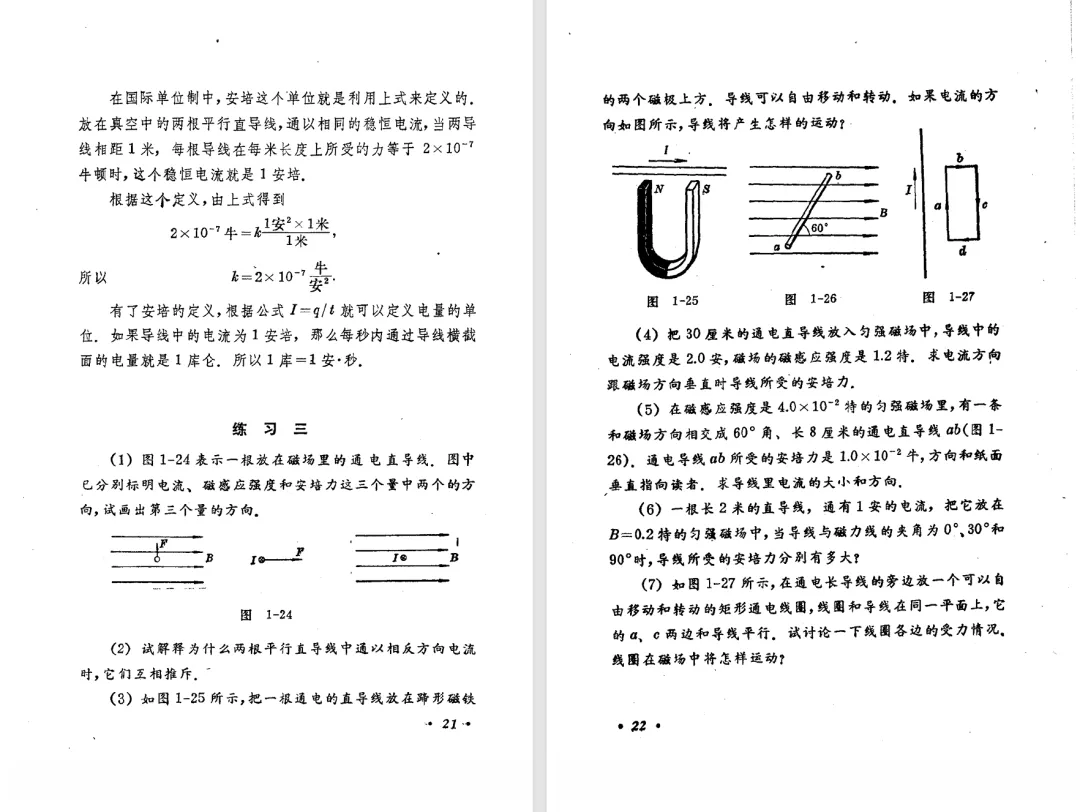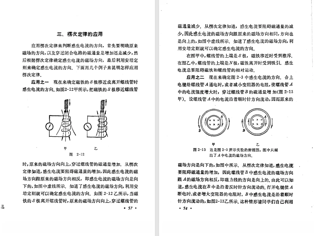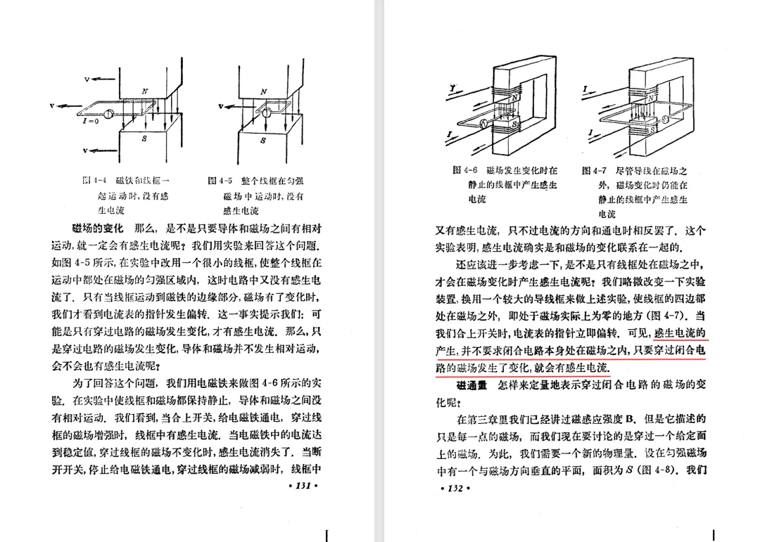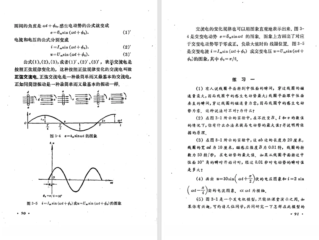 本文对高级中学课本 物理 甲种本 第三册进行详细介绍。本文将物理甲种本与上一版全日制十年制学校高中物理课本(简称旧教材)对比,展示两版教材的差异,从而了解教学要求和教材编写方式和风格的改变。先对比旧教材和甲种本的目录。甲种本同样对旧教材的小节做了拆分。甲种本前三节对应旧教材第一节。甲种本第五节磁通量在旧教材是在电磁感应这章的,甲种本第七节第八节对应旧教材第四节。甲种本第十节第十一节对应旧教材第六节。甲种本删除了测定带电粒子的质量,增加荷质比的测定 质谱仪。甲种本把磁通量放在磁场这一章,用一页半的正文进行介绍。教材给出的磁通量计算公式,覆盖了平面与磁力线垂直的情况和平面与磁力线不垂直的情况。旧教材在介绍电磁感应时才介绍磁通量。教材仅给出了平面与磁力线垂直情况下的磁通量计算公式,不垂直的情况仅文字说明,没有给公式。这种旧教材理论性不如甲种本情况是很少见的。回到甲种本。第六节介绍直线电流的磁场,这节内容对应于点电荷的电场。第七节介绍磁场对电流的作用力。安培力的计算实际上是矢量外积运算,但是甲种本给出的是标量形式的公式,然后根据左手定则确定力的方向,旧教材也如此。下图中的阅读材料介绍了物理基本单位安培。国际单位制中,安培是基本单位,电量单位是导出单位,这是比较反直觉的。下面看旧教材。旧教材对直线电流的磁场的介绍非常详细,不仅通过实验探求影响磁场的因素,还在推导出磁场强度公式后给出了一道例题,显然旧教材更重视本节内容,甲种本弱化了。注意,下图第106页的例题中,表示磁感应强度的Ba和Bb是矢量形式的。事实上旧教材物理下册中的矢量表达式已经少很多了,到了电磁学部分,确实有些公式不太方便用矢量形式表示,但是教材还是尽可能地使用矢量表达式。在第四节 磁场对电流的作用力一节,下图第110页的例题,与甲种本阅读材料介绍国际单位制物理基本单位安培的场景是相同的。本节末尾,如下图红框所示,教材提到电流表灵敏度高,可以测量微弱电流,对过载敏感,说白了就是可测量范围小。本节末尾,如下图红框所示,旧教材多了一段话,说明可以将电流表改造成安培表、伏特表、欧姆表。甲种本和旧教材都是先介绍大量程电表的原理,再介绍基本的敏感度高且量程小的电流表。下图红框这段话的存在可以呼应前文,让教材内容更完整。不知道为什么甲种本删掉了这段话。旧教材给出的对应小节讲的是下图的测定的带电粒子的质量。甲种本同样对小节做了拆分。旧教材第二节对应甲种本第二节和第三节。旧教材第三节对应甲种本第四节和第五节。甲种本中直流电动机的反电动势一节的部分内容,在旧教材中出现在稳恒电流一章欧姆定律的应用一节。本章内容新旧教材的编写方式差别非常大,需要进行仔细对比。先看甲种本如何介绍电磁感应现象。教材给出了三个实验,引出利用磁场产生电流的三种方法。注意三个实验的示意图,所用的实验设备和材料是比较常规的。在第51页开头,教材闭合电路产生电流的条件做了总结。后面的阅读材料介绍法拉第如何发现电磁感应现象,也是介绍了物理学历史。再看旧教材。旧教材在第一节通过两个小标题介绍磁场产生电流的方法。第一个小标题,导体和磁场的相对运动,对应甲种本的实验一和实验二。第二个小标题,磁场的变化,对应甲种本的实验三。需要注意的是,旧教材给出的实验示意图比较抽象,可能只有理论上的可行性,如果真的要做这些实验,所用的实验和材料呈现出的样子可能和示意图有较大的差别。相比之下,甲种本的实验有更强的可行性。上图第132页末尾介绍磁通量,甲种本在磁场一章已经介绍了。甲种本的编排方法导致学了磁通量后没有实际应用,让磁通量这个概念相对孤立地存在。下图中第134页,教材总结闭合电路产生电流的条件。回到甲种本。甲种本介绍楞次定律有两个小节,前一个小节介绍楞次定律,后一个小节介绍楞次定律的应用。旧教材花了较大的篇幅介绍引出楞次定律的实验,对于楞次定律的应用篇幅较少。先看第四节,本节一开头,教材就通过现象直接引出法拉第电磁感应定律。然后给出闭合电路感生电动势的计算方法,得出(1)式。接下来研究导体切割磁力线产生的感生电动势的计算方法,得出(3)式。接下来的第五节,教材从能量守恒的角度研究导线切割磁力线所产生的感生电动势。旧教材的介绍法拉第电磁感应定律的方法完全不同。如下图所示,教材以导线切割磁感线过程中的能量守恒原则推导出了导体切割磁感线所得的感生电动势的公式,即(1)式。然后进一步研究磁通量变化率与感生电动势的关系,得出(3)式。进而得出法拉第电磁感应定律。可以看出,旧教材是通过直线导体切割磁感线中的能量守恒关系得出感生电动势的计算方法,进而推导出感生电动势与磁通量变化率成正比这个规律,即法拉第电磁感应定律。而甲种本是先通过简单的定性的实验直接引出法拉第电磁感应定律,再推导直线导体切割磁感线所产生的感生电动势,最后研究直线导体切割磁感线中的能量守恒关系。两个版本教材编排完全是相反的。旧教材体现的是逐步得出法拉第电磁感应定律的过程,甲种本是先给出法拉第电磁感应定律,再研究电磁感应中的一些关系。