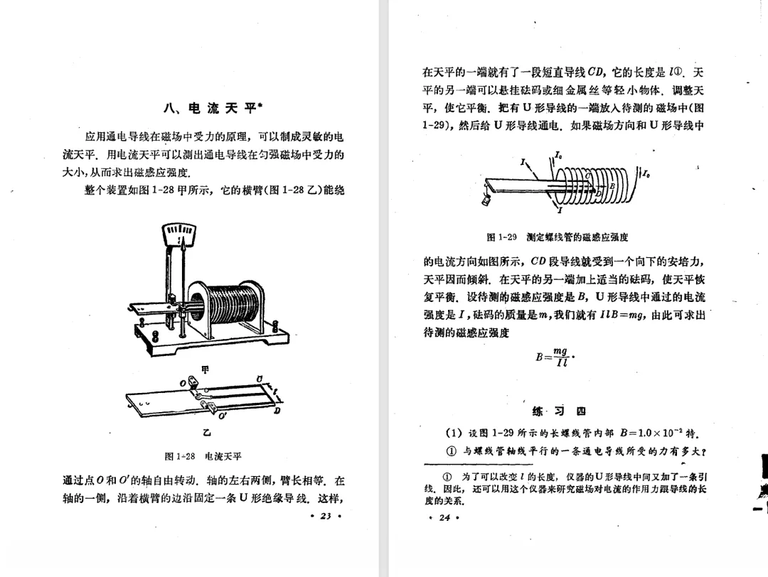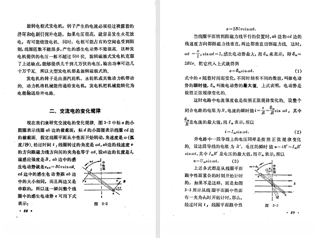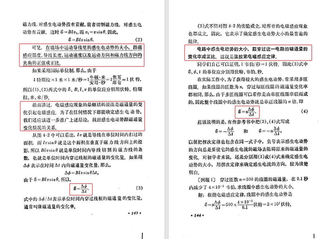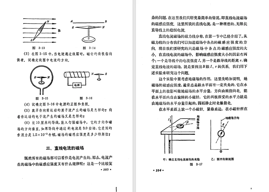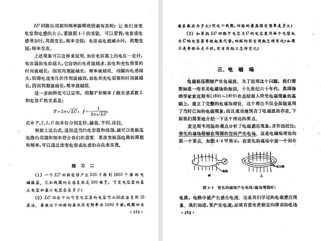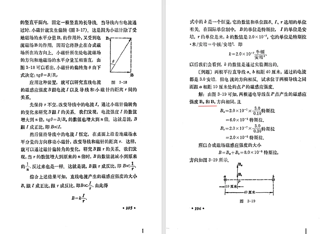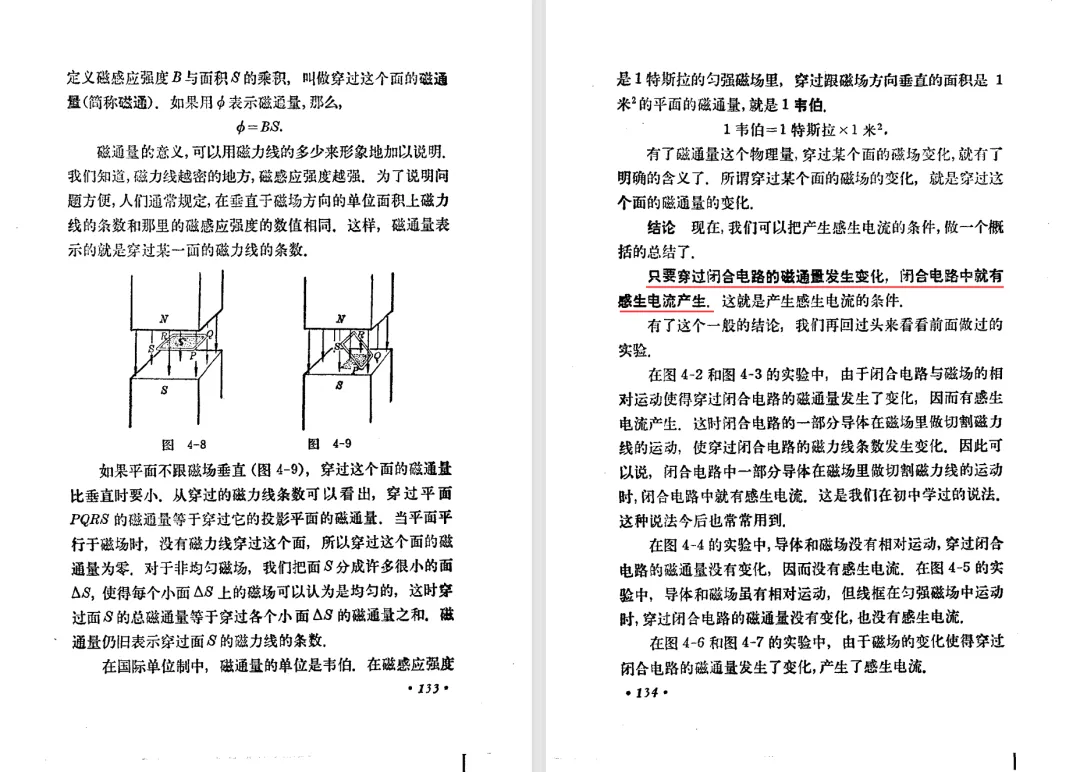 本文对高级中学课本 物理 甲种本 第三册进行详细介绍。本文将物理甲种本与上一版全日制十年制学校高中物理课本(简称旧教材)对比,展示两版教材的差异,从而了解教学要求和教材编写方式和风格的改变。先对比旧教材和甲种本的目录。甲种本同样对旧教材的小节做了拆分。甲种本前三节对应旧教材第一节。甲种本第五节磁通量在旧教材是在电磁感应这章的,甲种本第七节第八节对应旧教材第四节。甲种本第十节第十一节对应旧教材第六节。甲种本删除了测定带电粒子的质量,增加荷质比的测定 质谱仪。甲种本把磁通量放在磁场这一章,用一页半的正文进行介绍。教材给出的磁通量计算公式,覆盖了平面与磁力线垂直的情况和平面与磁力线不垂直的情况。旧教材在介绍电磁感应时才介绍磁通量。教材仅给出了平面与磁力线垂直情况下的磁通量计算公式,不垂直的情况仅文字说明,没有给公式。这种旧教材理论性不如甲种本情况是很少见的。回到甲种本。第六节介绍直线电流的磁场,这节内容对应于点电荷的电场。第七节介绍磁场对电流的作用力。安培力的计算实际上是矢量外积运算,但是甲种本给出的是标量形式的公式,然后根据左手定则确定力的方向,旧教材也如此。下图中的阅读材料介绍了物理基本单位安培。国际单位制中,安培是基本单位,电量单位是导出单位,这是比较反直觉的。下面看旧教材。旧教材对直线电流的磁场的介绍非常详细,不仅通过实验探求影响磁场的因素,还在推导出磁场强度公式后给出了一道例题,显然旧教材更重视本节内容,甲种本弱化了。注意,下图第106页的例题中,表示磁感应强度的Ba和Bb是矢量形式的。事实上旧教材物理下册中的矢量表达式已经少很多了,到了电磁学部分,确实有些公式不太方便用矢量形式表示,但是教材还是尽可能地使用矢量表达式。在第四节 磁场对电流的作用力一节,下图第110页的例题,与甲种本阅读材料介绍国际单位制物理基本单位安培的场景是相同的。本节末尾,如下图红框所示,教材提到电流表灵敏度高,可以测量微弱电流,对过载敏感,说白了就是可测量范围小。本节末尾,如下图红框所示,旧教材多了一段话,说明可以将电流表改造成安培表、伏特表、欧姆表。甲种本和旧教材都是先介绍大量程电表的原理,再介绍基本的敏感度高且量程小的电流表。下图红框这段话的存在可以呼应前文,让教材内容更完整。不知道为什么甲种本删掉了这段话。旧教材给出的对应小节讲的是下图的测定的带电粒子的质量。甲种本同样对小节做了拆分。旧教材第二节对应甲种本第二节和第三节。旧教材第三节对应甲种本第四节和第五节。甲种本中直流电动机的反电动势一节的部分内容,在旧教材中出现在稳恒电流一章欧姆定律的应用一节。本章内容新旧教材的编写方式差别非常大,需要进行仔细对比。先看甲种本如何介绍电磁感应现象。教材给出了三个实验,引出利用磁场产生电流的三种方法。注意三个实验的示意图,所用的实验设备和材料是比较常规的。在第51页开头,教材闭合电路产生电流的条件做了总结。后面的阅读材料介绍法拉第如何发现电磁感应现象,也是介绍了物理学历史。再看旧教材。旧教材在第一节通过两个小标题介绍磁场产生电流的方法。第一个小标题,导体和磁场的相对运动,对应甲种本的实验一和实验二。第二个小标题,磁场的变化,对应甲种本的实验三。需要注意的是,旧教材给出的实验示意图比较抽象,可能只有理论上的可行性,如果真的要做这些实验,所用的实验和材料呈现出的样子可能和示意图有较大的差别。相比之下,甲种本的实验有更强的可行性。上图第132页末尾介绍磁通量,甲种本在磁场一章已经介绍了。甲种本的编排方法导致学了磁通量后没有实际应用,让磁通量这个概念相对孤立地存在。下图中第134页,教材总结闭合电路产生电流的条件。回到甲种本。甲种本介绍楞次定律有两个小节,前一个小节介绍楞次定律,后一个小节介绍楞次定律的应用。旧教材花了较大的篇幅介绍引出楞次定律的实验,对于楞次定律的应用篇幅较少。先看第四节,本节一开头,教材就通过现象直接引出法拉第电磁感应定律。然后给出闭合电路感生电动势的计算方法,得出(1)式。接下来研究导体切割磁力线产生的感生电动势的计算方法,得出(3)式。接下来的第五节,教材从能量守恒的角度研究导线切割磁力线所产生的感生电动势。旧教材的介绍法拉第电磁感应定律的方法完全不同。如下图所示,教材以导线切割磁感线过程中的能量守恒原则推导出了导体切割磁感线所得的感生电动势的公式,即(1)式。然后进一步研究磁通量变化率与感生电动势的关系,得出(3)式。进而得出法拉第电磁感应定律。可以看出,旧教材是通过直线导体切割磁感线中的能量守恒关系得出感生电动势的计算方法,进而推导出感生电动势与磁通量变化率成正比这个规律,即法拉第电磁感应定律。而甲种本是先通过简单的定性的实验直接引出法拉第电磁感应定律,再推导直线导体切割磁感线所产生的感生电动势,最后研究直线导体切割磁感线中的能量守恒关系。两个版本教材编排完全是相反的。旧教材体现的是逐步得出法拉第电磁感应定律的过程,甲种本是先给出法拉第电磁感应定律,再研究电磁感应中的一些关系。