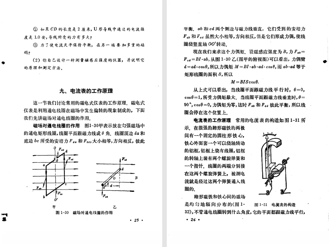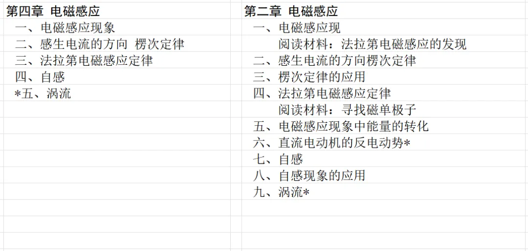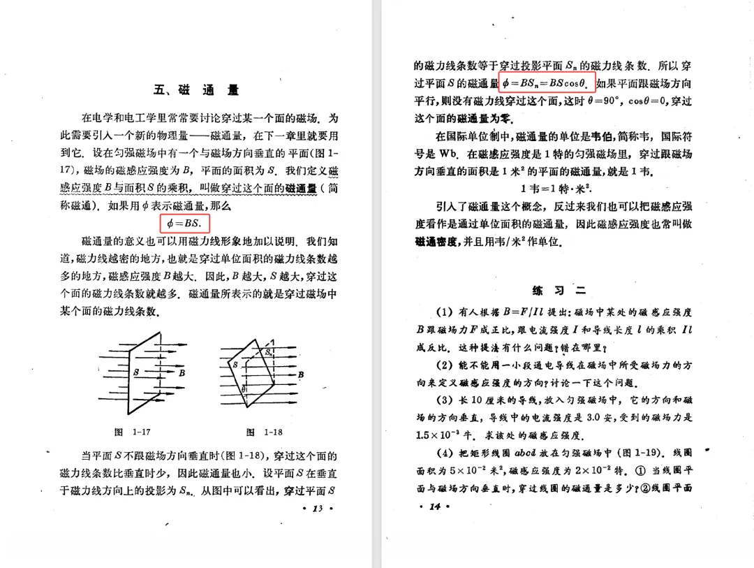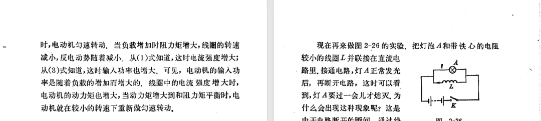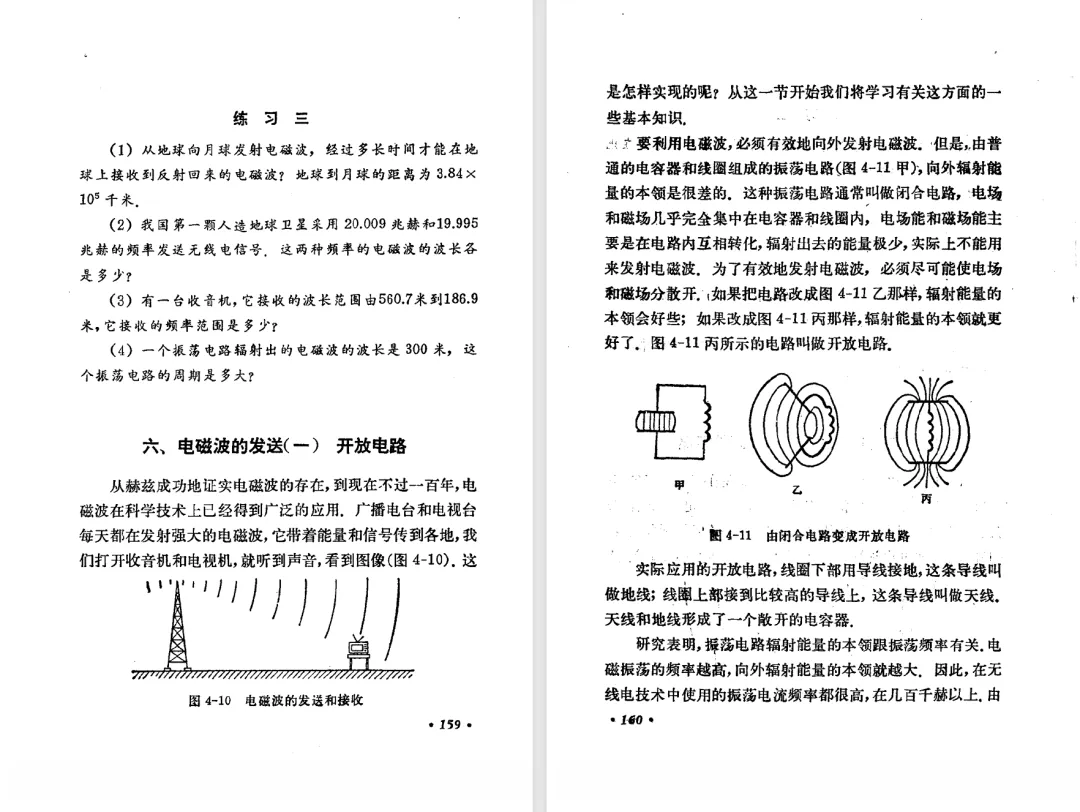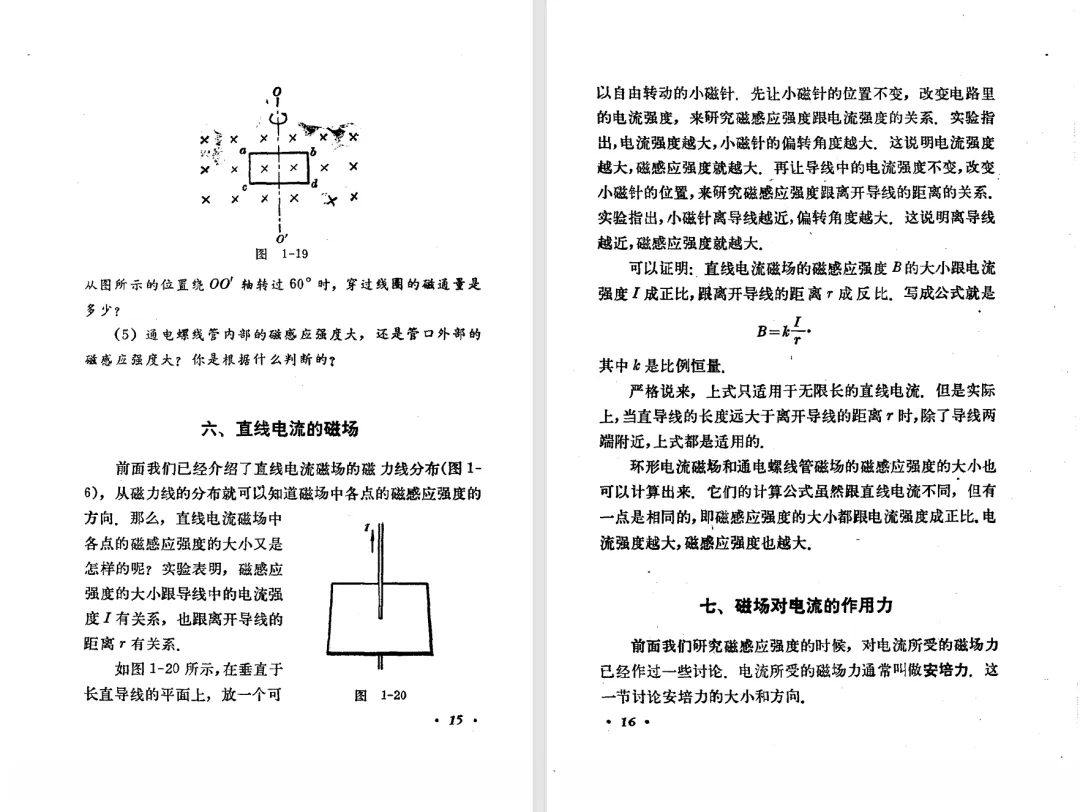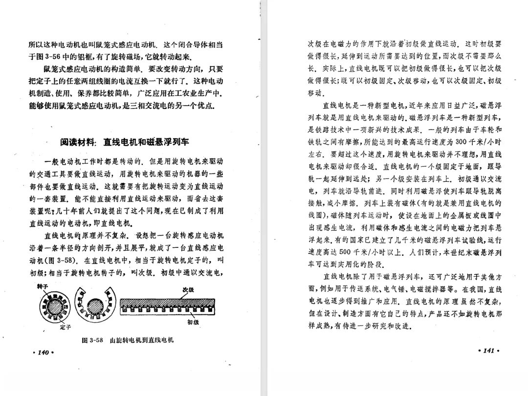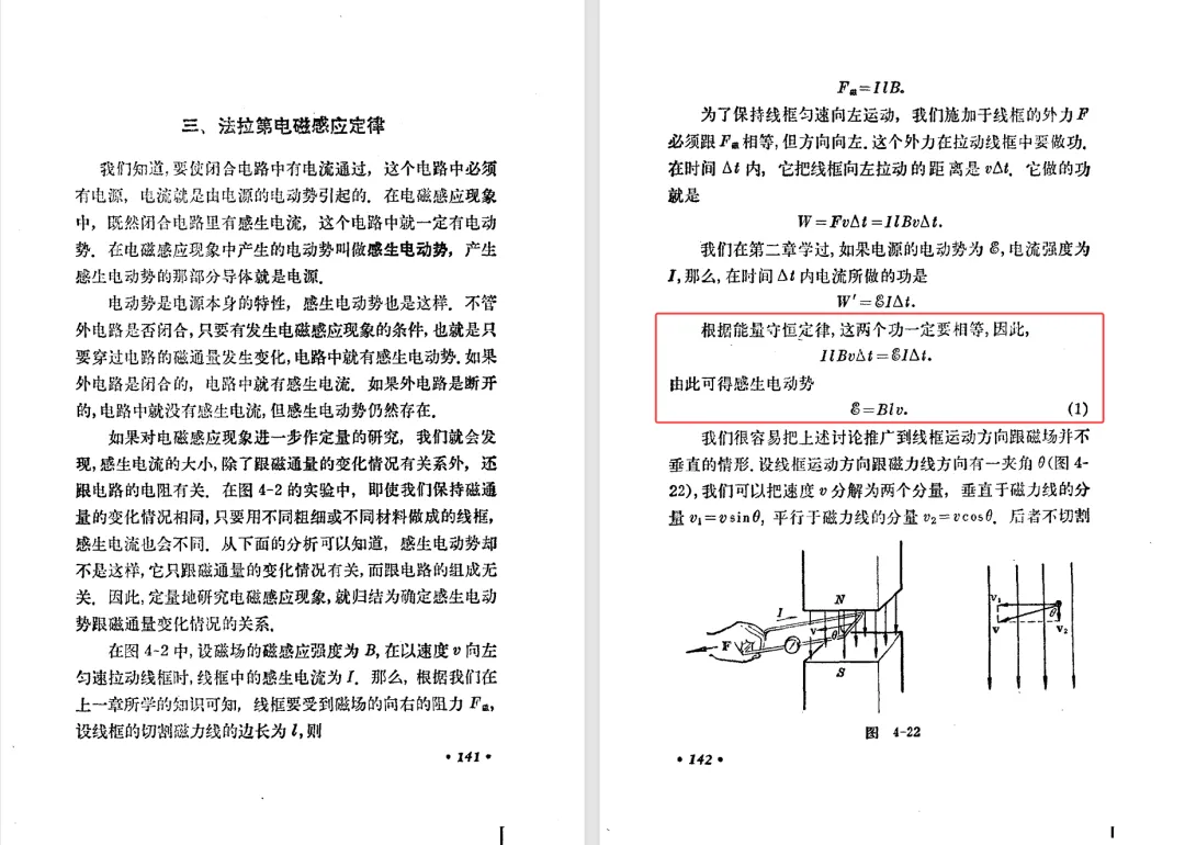 本文对高级中学课本 物理 甲种本 第三册进行详细介绍。本文将物理甲种本与上一版全日制十年制学校高中物理课本(简称旧教材)对比,展示两版教材的差异,从而了解教学要求和教材编写方式和风格的改变。先对比旧教材和甲种本的目录。甲种本同样对旧教材的小节做了拆分。甲种本前三节对应旧教材第一节。甲种本第五节磁通量在旧教材是在电磁感应这章的,甲种本第七节第八节对应旧教材第四节。甲种本第十节第十一节对应旧教材第六节。甲种本删除了测定带电粒子的质量,增加荷质比的测定 质谱仪。甲种本把磁通量放在磁场这一章,用一页半的正文进行介绍。教材给出的磁通量计算公式,覆盖了平面与磁力线垂直的情况和平面与磁力线不垂直的情况。旧教材在介绍电磁感应时才介绍磁通量。教材仅给出了平面与磁力线垂直情况下的磁通量计算公式,不垂直的情况仅文字说明,没有给公式。这种旧教材理论性不如甲种本情况是很少见的。回到甲种本。第六节介绍直线电流的磁场,这节内容对应于点电荷的电场。第七节介绍磁场对电流的作用力。安培力的计算实际上是矢量外积运算,但是甲种本给出的是标量形式的公式,然后根据左手定则确定力的方向,旧教材也如此。下图中的阅读材料介绍了物理基本单位安培。国际单位制中,安培是基本单位,电量单位是导出单位,这是比较反直觉的。下面看旧教材。旧教材对直线电流的磁场的介绍非常详细,不仅通过实验探求影响磁场的因素,还在推导出磁场强度公式后给出了一道例题,显然旧教材更重视本节内容,甲种本弱化了。注意,下图第106页的例题中,表示磁感应强度的Ba和Bb是矢量形式的。事实上旧教材物理下册中的矢量表达式已经少很多了,到了电磁学部分,确实有些公式不太方便用矢量形式表示,但是教材还是尽可能地使用矢量表达式。在第四节 磁场对电流的作用力一节,下图第110页的例题,与甲种本阅读材料介绍国际单位制物理基本单位安培的场景是相同的。本节末尾,如下图红框所示,教材提到电流表灵敏度高,可以测量微弱电流,对过载敏感,说白了就是可测量范围小。本节末尾,如下图红框所示,旧教材多了一段话,说明可以将电流表改造成安培表、伏特表、欧姆表。甲种本和旧教材都是先介绍大量程电表的原理,再介绍基本的敏感度高且量程小的电流表。下图红框这段话的存在可以呼应前文,让教材内容更完整。不知道为什么甲种本删掉了这段话。旧教材给出的对应小节讲的是下图的测定的带电粒子的质量。甲种本同样对小节做了拆分。旧教材第二节对应甲种本第二节和第三节。旧教材第三节对应甲种本第四节和第五节。甲种本中直流电动机的反电动势一节的部分内容,在旧教材中出现在稳恒电流一章欧姆定律的应用一节。本章内容新旧教材的编写方式差别非常大,需要进行仔细对比。先看甲种本如何介绍电磁感应现象。教材给出了三个实验,引出利用磁场产生电流的三种方法。注意三个实验的示意图,所用的实验设备和材料是比较常规的。在第51页开头,教材闭合电路产生电流的条件做了总结。后面的阅读材料介绍法拉第如何发现电磁感应现象,也是介绍了物理学历史。再看旧教材。旧教材在第一节通过两个小标题介绍磁场产生电流的方法。第一个小标题,导体和磁场的相对运动,对应甲种本的实验一和实验二。第二个小标题,磁场的变化,对应甲种本的实验三。需要注意的是,旧教材给出的实验示意图比较抽象,可能只有理论上的可行性,如果真的要做这些实验,所用的实验和材料呈现出的样子可能和示意图有较大的差别。相比之下,甲种本的实验有更强的可行性。上图第132页末尾介绍磁通量,甲种本在磁场一章已经介绍了。甲种本的编排方法导致学了磁通量后没有实际应用,让磁通量这个概念相对孤立地存在。下图中第134页,教材总结闭合电路产生电流的条件。回到甲种本。甲种本介绍楞次定律有两个小节,前一个小节介绍楞次定律,后一个小节介绍楞次定律的应用。旧教材花了较大的篇幅介绍引出楞次定律的实验,对于楞次定律的应用篇幅较少。先看第四节,本节一开头,教材就通过现象直接引出法拉第电磁感应定律。然后给出闭合电路感生电动势的计算方法,得出(1)式。接下来研究导体切割磁力线产生的感生电动势的计算方法,得出(3)式。接下来的第五节,教材从能量守恒的角度研究导线切割磁力线所产生的感生电动势。旧教材的介绍法拉第电磁感应定律的方法完全不同。如下图所示,教材以导线切割磁感线过程中的能量守恒原则推导出了导体切割磁感线所得的感生电动势的公式,即(1)式。然后进一步研究磁通量变化率与感生电动势的关系,得出(3)式。进而得出法拉第电磁感应定律。可以看出,旧教材是通过直线导体切割磁感线中的能量守恒关系得出感生电动势的计算方法,进而推导出感生电动势与磁通量变化率成正比这个规律,即法拉第电磁感应定律。而甲种本是先通过简单的定性的实验直接引出法拉第电磁感应定律,再推导直线导体切割磁感线所产生的感生电动势,最后研究直线导体切割磁感线中的能量守恒关系。两个版本教材编排完全是相反的。旧教材体现的是逐步得出法拉第电磁感应定律的过程,甲种本是先给出法拉第电磁感应定律,再研究电磁感应中的一些关系。