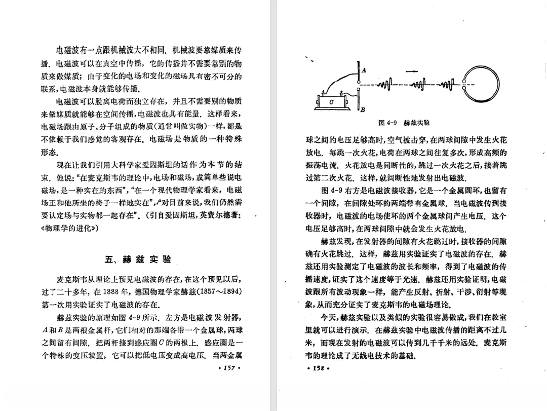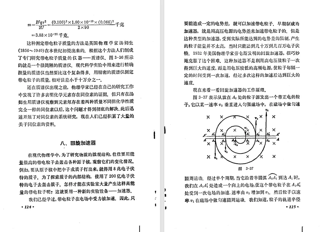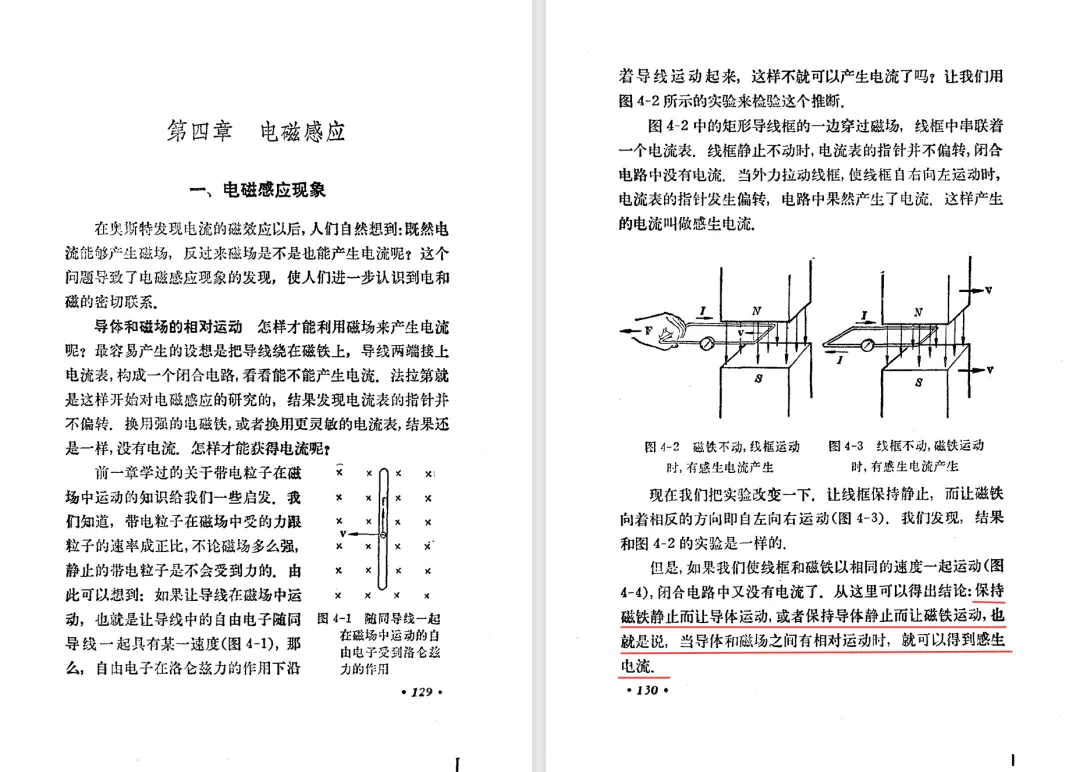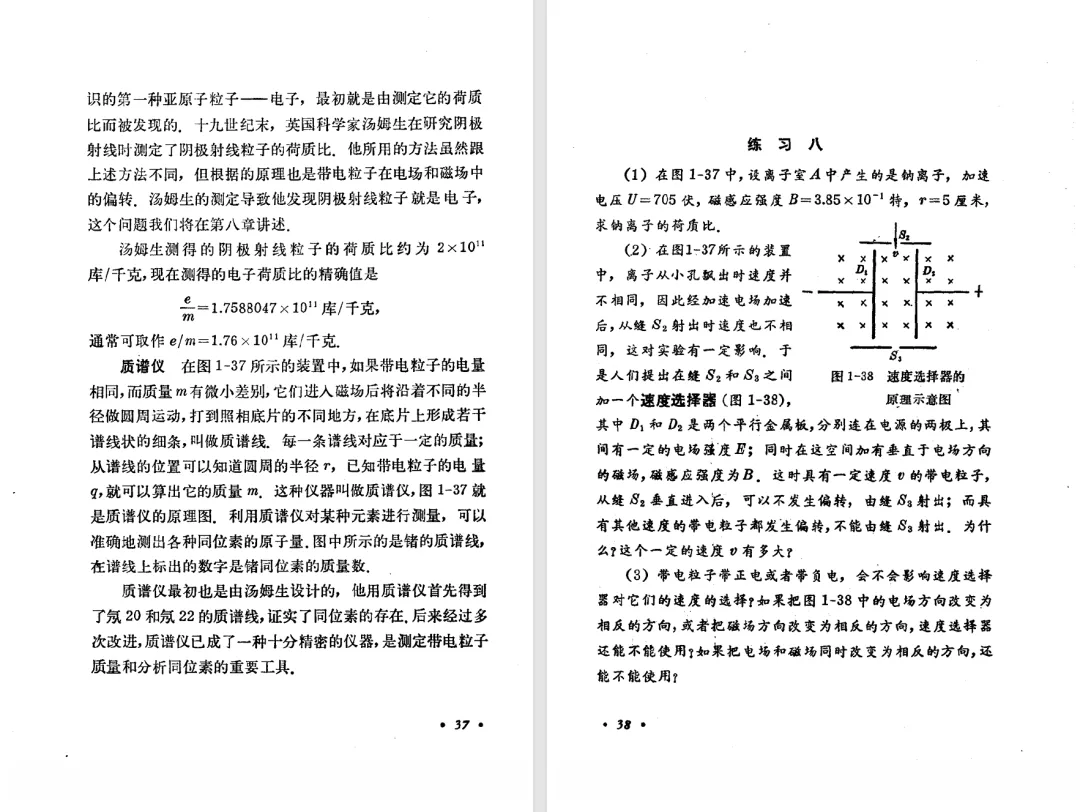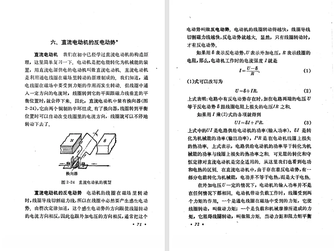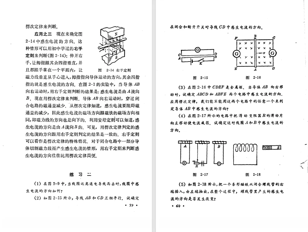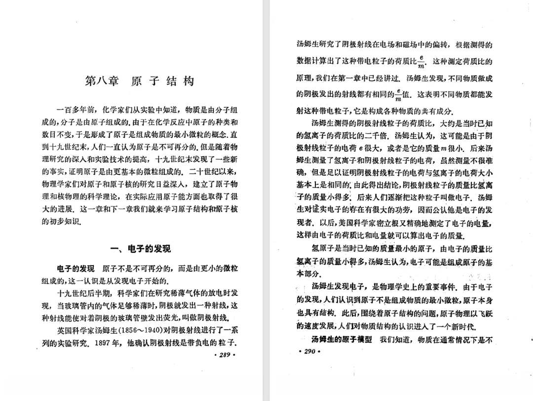 本文对高级中学课本 物理 甲种本 第三册进行详细介绍。本文将物理甲种本与上一版全日制十年制学校高中物理课本(简称旧教材)对比,展示两版教材的差异,从而了解教学要求和教材编写方式和风格的改变。先对比旧教材和甲种本的目录。甲种本同样对旧教材的小节做了拆分。甲种本前三节对应旧教材第一节。甲种本第五节磁通量在旧教材是在电磁感应这章的,甲种本第七节第八节对应旧教材第四节。甲种本第十节第十一节对应旧教材第六节。甲种本删除了测定带电粒子的质量,增加荷质比的测定 质谱仪。甲种本把磁通量放在磁场这一章,用一页半的正文进行介绍。教材给出的磁通量计算公式,覆盖了平面与磁力线垂直的情况和平面与磁力线不垂直的情况。旧教材在介绍电磁感应时才介绍磁通量。教材仅给出了平面与磁力线垂直情况下的磁通量计算公式,不垂直的情况仅文字说明,没有给公式。这种旧教材理论性不如甲种本情况是很少见的。回到甲种本。第六节介绍直线电流的磁场,这节内容对应于点电荷的电场。第七节介绍磁场对电流的作用力。安培力的计算实际上是矢量外积运算,但是甲种本给出的是标量形式的公式,然后根据左手定则确定力的方向,旧教材也如此。下图中的阅读材料介绍了物理基本单位安培。国际单位制中,安培是基本单位,电量单位是导出单位,这是比较反直觉的。下面看旧教材。旧教材对直线电流的磁场的介绍非常详细,不仅通过实验探求影响磁场的因素,还在推导出磁场强度公式后给出了一道例题,显然旧教材更重视本节内容,甲种本弱化了。注意,下图第106页的例题中,表示磁感应强度的Ba和Bb是矢量形式的。事实上旧教材物理下册中的矢量表达式已经少很多了,到了电磁学部分,确实有些公式不太方便用矢量形式表示,但是教材还是尽可能地使用矢量表达式。在第四节 磁场对电流的作用力一节,下图第110页的例题,与甲种本阅读材料介绍国际单位制物理基本单位安培的场景是相同的。本节末尾,如下图红框所示,教材提到电流表灵敏度高,可以测量微弱电流,对过载敏感,说白了就是可测量范围小。本节末尾,如下图红框所示,旧教材多了一段话,说明可以将电流表改造成安培表、伏特表、欧姆表。甲种本和旧教材都是先介绍大量程电表的原理,再介绍基本的敏感度高且量程小的电流表。下图红框这段话的存在可以呼应前文,让教材内容更完整。不知道为什么甲种本删掉了这段话。旧教材给出的对应小节讲的是下图的测定的带电粒子的质量。甲种本同样对小节做了拆分。旧教材第二节对应甲种本第二节和第三节。旧教材第三节对应甲种本第四节和第五节。甲种本中直流电动机的反电动势一节的部分内容,在旧教材中出现在稳恒电流一章欧姆定律的应用一节。本章内容新旧教材的编写方式差别非常大,需要进行仔细对比。先看甲种本如何介绍电磁感应现象。教材给出了三个实验,引出利用磁场产生电流的三种方法。注意三个实验的示意图,所用的实验设备和材料是比较常规的。在第51页开头,教材闭合电路产生电流的条件做了总结。后面的阅读材料介绍法拉第如何发现电磁感应现象,也是介绍了物理学历史。再看旧教材。旧教材在第一节通过两个小标题介绍磁场产生电流的方法。第一个小标题,导体和磁场的相对运动,对应甲种本的实验一和实验二。第二个小标题,磁场的变化,对应甲种本的实验三。需要注意的是,旧教材给出的实验示意图比较抽象,可能只有理论上的可行性,如果真的要做这些实验,所用的实验和材料呈现出的样子可能和示意图有较大的差别。相比之下,甲种本的实验有更强的可行性。上图第132页末尾介绍磁通量,甲种本在磁场一章已经介绍了。甲种本的编排方法导致学了磁通量后没有实际应用,让磁通量这个概念相对孤立地存在。下图中第134页,教材总结闭合电路产生电流的条件。回到甲种本。甲种本介绍楞次定律有两个小节,前一个小节介绍楞次定律,后一个小节介绍楞次定律的应用。旧教材花了较大的篇幅介绍引出楞次定律的实验,对于楞次定律的应用篇幅较少。先看第四节,本节一开头,教材就通过现象直接引出法拉第电磁感应定律。然后给出闭合电路感生电动势的计算方法,得出(1)式。接下来研究导体切割磁力线产生的感生电动势的计算方法,得出(3)式。接下来的第五节,教材从能量守恒的角度研究导线切割磁力线所产生的感生电动势。旧教材的介绍法拉第电磁感应定律的方法完全不同。如下图所示,教材以导线切割磁感线过程中的能量守恒原则推导出了导体切割磁感线所得的感生电动势的公式,即(1)式。然后进一步研究磁通量变化率与感生电动势的关系,得出(3)式。进而得出法拉第电磁感应定律。可以看出,旧教材是通过直线导体切割磁感线中的能量守恒关系得出感生电动势的计算方法,进而推导出感生电动势与磁通量变化率成正比这个规律,即法拉第电磁感应定律。而甲种本是先通过简单的定性的实验直接引出法拉第电磁感应定律,再推导直线导体切割磁感线所产生的感生电动势,最后研究直线导体切割磁感线中的能量守恒关系。两个版本教材编排完全是相反的。旧教材体现的是逐步得出法拉第电磁感应定律的过程,甲种本是先给出法拉第电磁感应定律,再研究电磁感应中的一些关系。