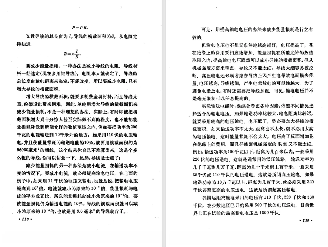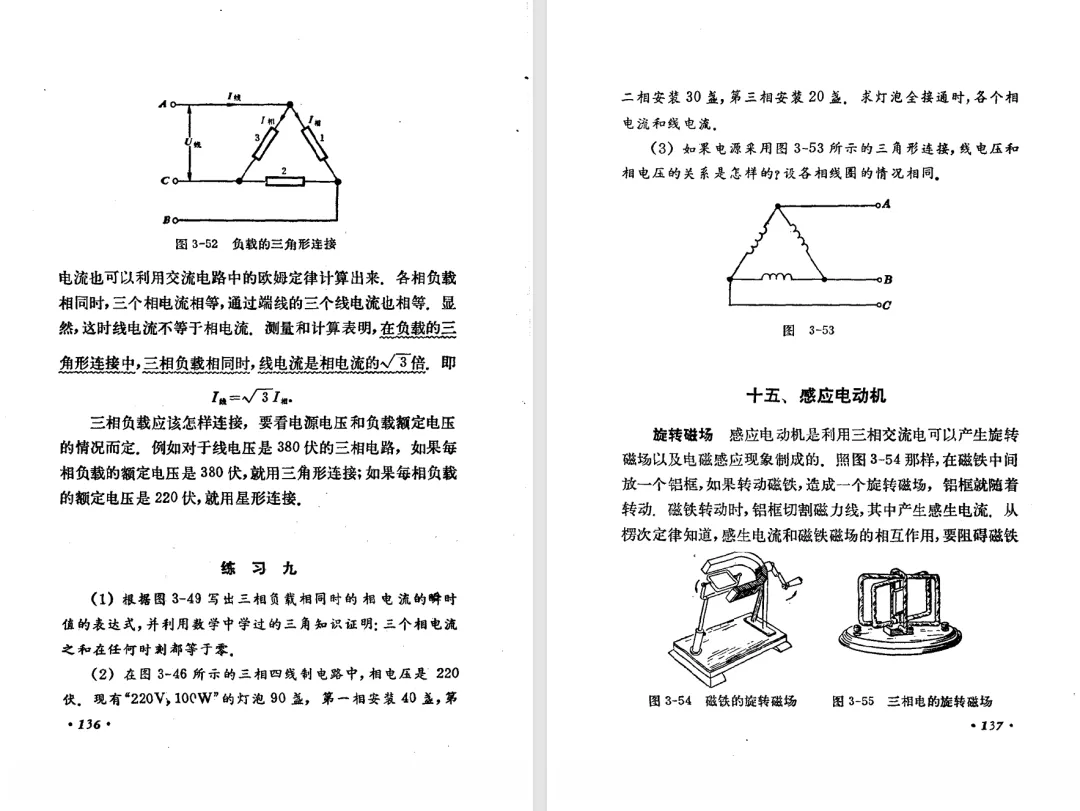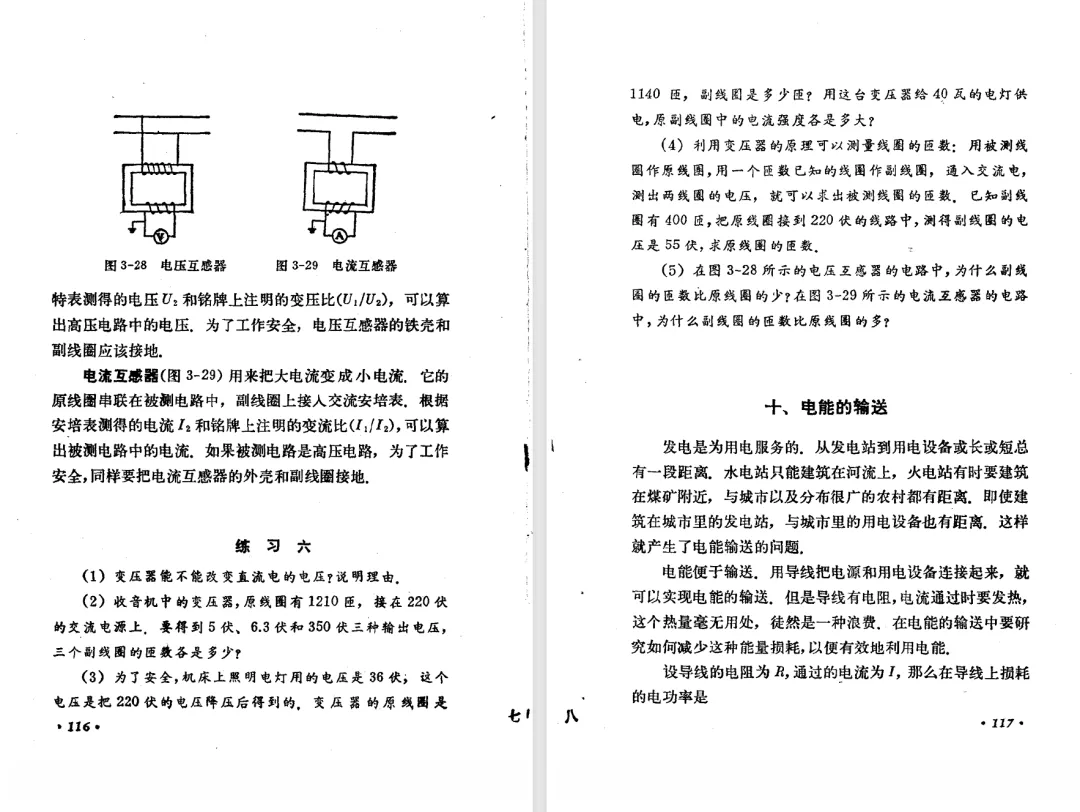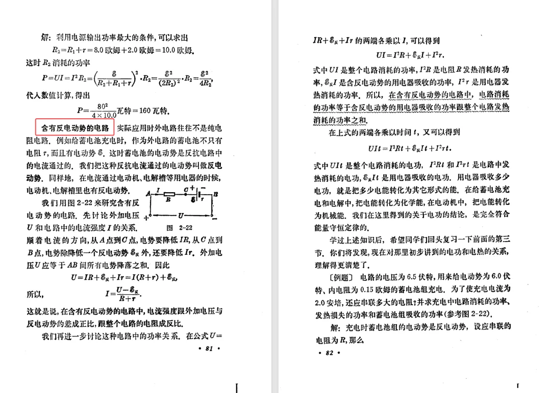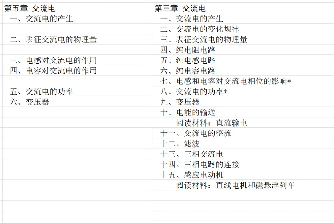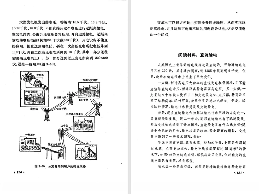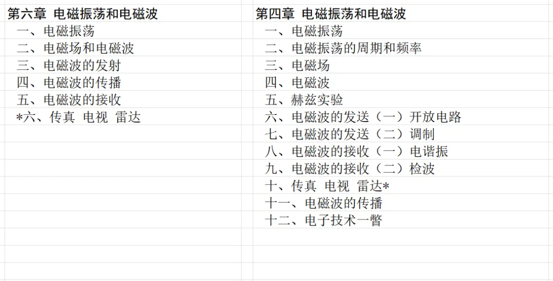 本文对高级中学课本 物理 甲种本 第三册进行详细介绍。本文将物理甲种本与上一版全日制十年制学校高中物理课本(简称旧教材)对比,展示两版教材的差异,从而了解教学要求和教材编写方式和风格的改变。先对比旧教材和甲种本的目录。甲种本同样对旧教材的小节做了拆分。甲种本前三节对应旧教材第一节。甲种本第五节磁通量在旧教材是在电磁感应这章的,甲种本第七节第八节对应旧教材第四节。甲种本第十节第十一节对应旧教材第六节。甲种本删除了测定带电粒子的质量,增加荷质比的测定 质谱仪。甲种本把磁通量放在磁场这一章,用一页半的正文进行介绍。教材给出的磁通量计算公式,覆盖了平面与磁力线垂直的情况和平面与磁力线不垂直的情况。旧教材在介绍电磁感应时才介绍磁通量。教材仅给出了平面与磁力线垂直情况下的磁通量计算公式,不垂直的情况仅文字说明,没有给公式。这种旧教材理论性不如甲种本情况是很少见的。回到甲种本。第六节介绍直线电流的磁场,这节内容对应于点电荷的电场。第七节介绍磁场对电流的作用力。安培力的计算实际上是矢量外积运算,但是甲种本给出的是标量形式的公式,然后根据左手定则确定力的方向,旧教材也如此。下图中的阅读材料介绍了物理基本单位安培。国际单位制中,安培是基本单位,电量单位是导出单位,这是比较反直觉的。下面看旧教材。旧教材对直线电流的磁场的介绍非常详细,不仅通过实验探求影响磁场的因素,还在推导出磁场强度公式后给出了一道例题,显然旧教材更重视本节内容,甲种本弱化了。注意,下图第106页的例题中,表示磁感应强度的Ba和Bb是矢量形式的。事实上旧教材物理下册中的矢量表达式已经少很多了,到了电磁学部分,确实有些公式不太方便用矢量形式表示,但是教材还是尽可能地使用矢量表达式。在第四节 磁场对电流的作用力一节,下图第110页的例题,与甲种本阅读材料介绍国际单位制物理基本单位安培的场景是相同的。本节末尾,如下图红框所示,教材提到电流表灵敏度高,可以测量微弱电流,对过载敏感,说白了就是可测量范围小。本节末尾,如下图红框所示,旧教材多了一段话,说明可以将电流表改造成安培表、伏特表、欧姆表。甲种本和旧教材都是先介绍大量程电表的原理,再介绍基本的敏感度高且量程小的电流表。下图红框这段话的存在可以呼应前文,让教材内容更完整。不知道为什么甲种本删掉了这段话。旧教材给出的对应小节讲的是下图的测定的带电粒子的质量。甲种本同样对小节做了拆分。旧教材第二节对应甲种本第二节和第三节。旧教材第三节对应甲种本第四节和第五节。甲种本中直流电动机的反电动势一节的部分内容,在旧教材中出现在稳恒电流一章欧姆定律的应用一节。本章内容新旧教材的编写方式差别非常大,需要进行仔细对比。先看甲种本如何介绍电磁感应现象。教材给出了三个实验,引出利用磁场产生电流的三种方法。注意三个实验的示意图,所用的实验设备和材料是比较常规的。在第51页开头,教材闭合电路产生电流的条件做了总结。后面的阅读材料介绍法拉第如何发现电磁感应现象,也是介绍了物理学历史。再看旧教材。旧教材在第一节通过两个小标题介绍磁场产生电流的方法。第一个小标题,导体和磁场的相对运动,对应甲种本的实验一和实验二。第二个小标题,磁场的变化,对应甲种本的实验三。需要注意的是,旧教材给出的实验示意图比较抽象,可能只有理论上的可行性,如果真的要做这些实验,所用的实验和材料呈现出的样子可能和示意图有较大的差别。相比之下,甲种本的实验有更强的可行性。上图第132页末尾介绍磁通量,甲种本在磁场一章已经介绍了。甲种本的编排方法导致学了磁通量后没有实际应用,让磁通量这个概念相对孤立地存在。下图中第134页,教材总结闭合电路产生电流的条件。回到甲种本。甲种本介绍楞次定律有两个小节,前一个小节介绍楞次定律,后一个小节介绍楞次定律的应用。旧教材花了较大的篇幅介绍引出楞次定律的实验,对于楞次定律的应用篇幅较少。先看第四节,本节一开头,教材就通过现象直接引出法拉第电磁感应定律。然后给出闭合电路感生电动势的计算方法,得出(1)式。接下来研究导体切割磁力线产生的感生电动势的计算方法,得出(3)式。接下来的第五节,教材从能量守恒的角度研究导线切割磁力线所产生的感生电动势。旧教材的介绍法拉第电磁感应定律的方法完全不同。如下图所示,教材以导线切割磁感线过程中的能量守恒原则推导出了导体切割磁感线所得的感生电动势的公式,即(1)式。然后进一步研究磁通量变化率与感生电动势的关系,得出(3)式。进而得出法拉第电磁感应定律。可以看出,旧教材是通过直线导体切割磁感线中的能量守恒关系得出感生电动势的计算方法,进而推导出感生电动势与磁通量变化率成正比这个规律,即法拉第电磁感应定律。而甲种本是先通过简单的定性的实验直接引出法拉第电磁感应定律,再推导直线导体切割磁感线所产生的感生电动势,最后研究直线导体切割磁感线中的能量守恒关系。两个版本教材编排完全是相反的。旧教材体现的是逐步得出法拉第电磁感应定律的过程,甲种本是先给出法拉第电磁感应定律,再研究电磁感应中的一些关系。