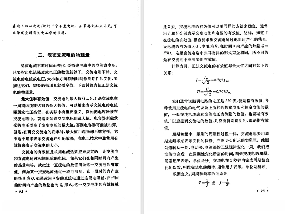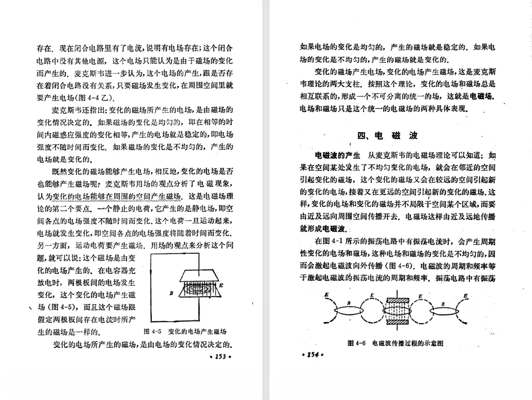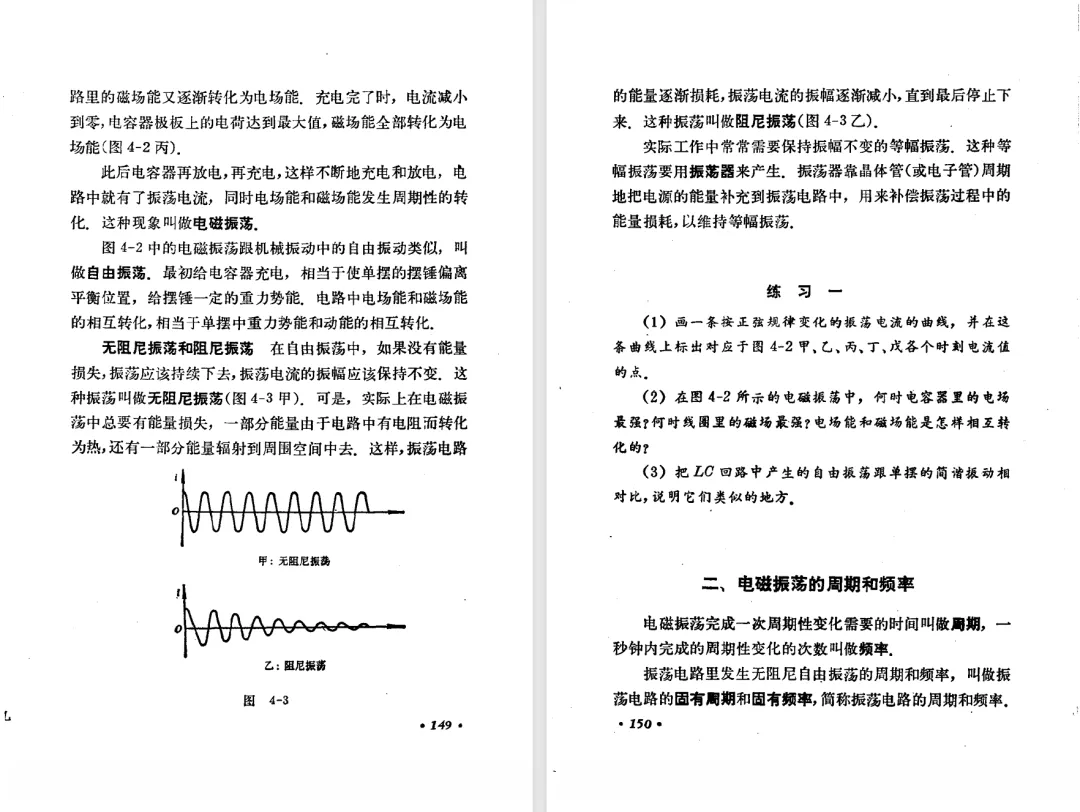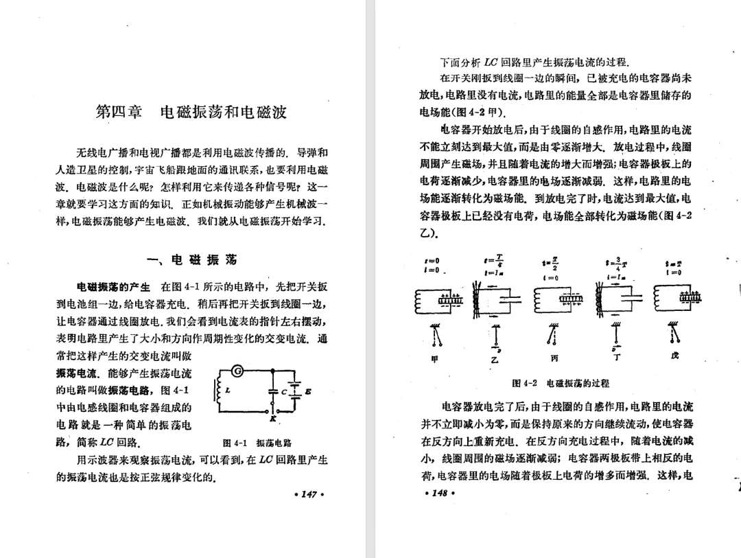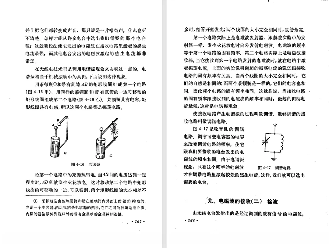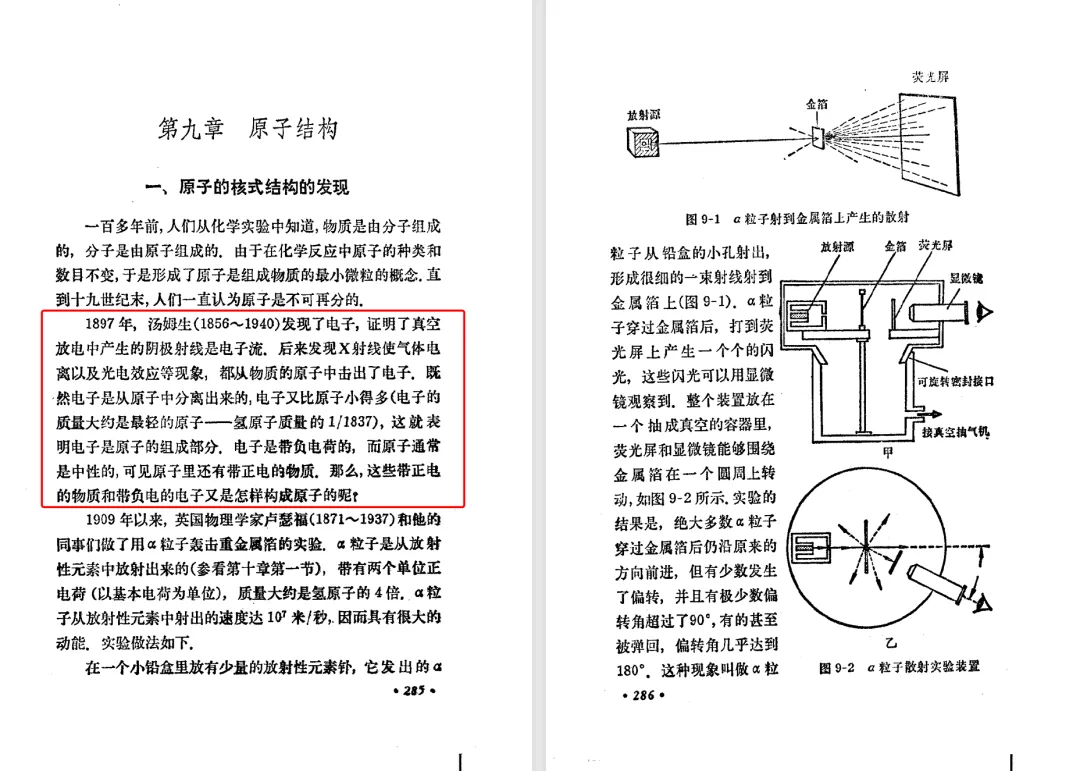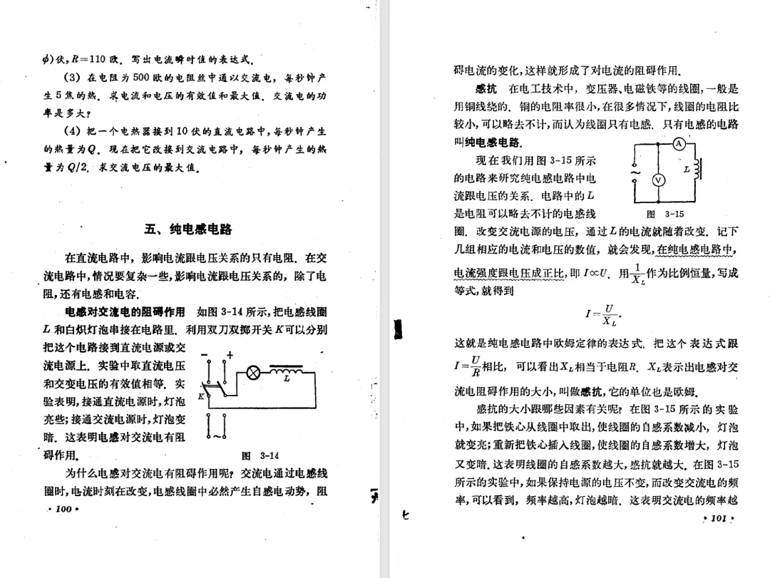 本文对高级中学课本 物理 甲种本 第三册进行详细介绍。本文将物理甲种本与上一版全日制十年制学校高中物理课本(简称旧教材)对比,展示两版教材的差异,从而了解教学要求和教材编写方式和风格的改变。先对比旧教材和甲种本的目录。甲种本同样对旧教材的小节做了拆分。甲种本前三节对应旧教材第一节。甲种本第五节磁通量在旧教材是在电磁感应这章的,甲种本第七节第八节对应旧教材第四节。甲种本第十节第十一节对应旧教材第六节。甲种本删除了测定带电粒子的质量,增加荷质比的测定 质谱仪。甲种本把磁通量放在磁场这一章,用一页半的正文进行介绍。教材给出的磁通量计算公式,覆盖了平面与磁力线垂直的情况和平面与磁力线不垂直的情况。旧教材在介绍电磁感应时才介绍磁通量。教材仅给出了平面与磁力线垂直情况下的磁通量计算公式,不垂直的情况仅文字说明,没有给公式。这种旧教材理论性不如甲种本情况是很少见的。回到甲种本。第六节介绍直线电流的磁场,这节内容对应于点电荷的电场。第七节介绍磁场对电流的作用力。安培力的计算实际上是矢量外积运算,但是甲种本给出的是标量形式的公式,然后根据左手定则确定力的方向,旧教材也如此。下图中的阅读材料介绍了物理基本单位安培。国际单位制中,安培是基本单位,电量单位是导出单位,这是比较反直觉的。下面看旧教材。旧教材对直线电流的磁场的介绍非常详细,不仅通过实验探求影响磁场的因素,还在推导出磁场强度公式后给出了一道例题,显然旧教材更重视本节内容,甲种本弱化了。注意,下图第106页的例题中,表示磁感应强度的Ba和Bb是矢量形式的。事实上旧教材物理下册中的矢量表达式已经少很多了,到了电磁学部分,确实有些公式不太方便用矢量形式表示,但是教材还是尽可能地使用矢量表达式。在第四节 磁场对电流的作用力一节,下图第110页的例题,与甲种本阅读材料介绍国际单位制物理基本单位安培的场景是相同的。本节末尾,如下图红框所示,教材提到电流表灵敏度高,可以测量微弱电流,对过载敏感,说白了就是可测量范围小。本节末尾,如下图红框所示,旧教材多了一段话,说明可以将电流表改造成安培表、伏特表、欧姆表。甲种本和旧教材都是先介绍大量程电表的原理,再介绍基本的敏感度高且量程小的电流表。下图红框这段话的存在可以呼应前文,让教材内容更完整。不知道为什么甲种本删掉了这段话。旧教材给出的对应小节讲的是下图的测定的带电粒子的质量。甲种本同样对小节做了拆分。旧教材第二节对应甲种本第二节和第三节。旧教材第三节对应甲种本第四节和第五节。甲种本中直流电动机的反电动势一节的部分内容,在旧教材中出现在稳恒电流一章欧姆定律的应用一节。本章内容新旧教材的编写方式差别非常大,需要进行仔细对比。先看甲种本如何介绍电磁感应现象。教材给出了三个实验,引出利用磁场产生电流的三种方法。注意三个实验的示意图,所用的实验设备和材料是比较常规的。在第51页开头,教材闭合电路产生电流的条件做了总结。后面的阅读材料介绍法拉第如何发现电磁感应现象,也是介绍了物理学历史。再看旧教材。旧教材在第一节通过两个小标题介绍磁场产生电流的方法。第一个小标题,导体和磁场的相对运动,对应甲种本的实验一和实验二。第二个小标题,磁场的变化,对应甲种本的实验三。需要注意的是,旧教材给出的实验示意图比较抽象,可能只有理论上的可行性,如果真的要做这些实验,所用的实验和材料呈现出的样子可能和示意图有较大的差别。相比之下,甲种本的实验有更强的可行性。上图第132页末尾介绍磁通量,甲种本在磁场一章已经介绍了。甲种本的编排方法导致学了磁通量后没有实际应用,让磁通量这个概念相对孤立地存在。下图中第134页,教材总结闭合电路产生电流的条件。回到甲种本。甲种本介绍楞次定律有两个小节,前一个小节介绍楞次定律,后一个小节介绍楞次定律的应用。旧教材花了较大的篇幅介绍引出楞次定律的实验,对于楞次定律的应用篇幅较少。先看第四节,本节一开头,教材就通过现象直接引出法拉第电磁感应定律。然后给出闭合电路感生电动势的计算方法,得出(1)式。接下来研究导体切割磁力线产生的感生电动势的计算方法,得出(3)式。接下来的第五节,教材从能量守恒的角度研究导线切割磁力线所产生的感生电动势。旧教材的介绍法拉第电磁感应定律的方法完全不同。如下图所示,教材以导线切割磁感线过程中的能量守恒原则推导出了导体切割磁感线所得的感生电动势的公式,即(1)式。然后进一步研究磁通量变化率与感生电动势的关系,得出(3)式。进而得出法拉第电磁感应定律。可以看出,旧教材是通过直线导体切割磁感线中的能量守恒关系得出感生电动势的计算方法,进而推导出感生电动势与磁通量变化率成正比这个规律,即法拉第电磁感应定律。而甲种本是先通过简单的定性的实验直接引出法拉第电磁感应定律,再推导直线导体切割磁感线所产生的感生电动势,最后研究直线导体切割磁感线中的能量守恒关系。两个版本教材编排完全是相反的。旧教材体现的是逐步得出法拉第电磁感应定律的过程,甲种本是先给出法拉第电磁感应定律,再研究电磁感应中的一些关系。