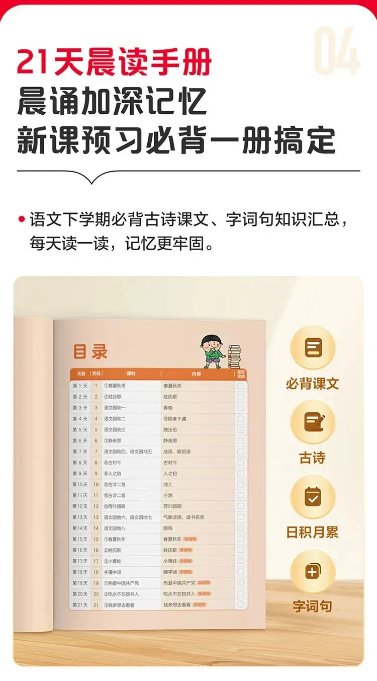前7天复习,把上学期知识点再巩固一遍,生字、词语、句子、日积月累和阅读,非常全面;
