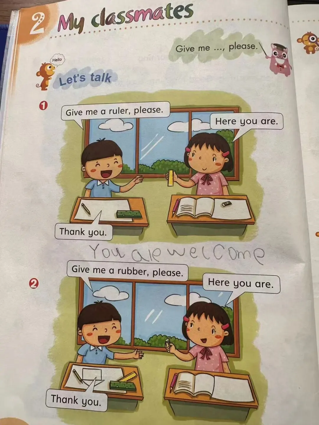 当你想让同桌给你一支铅笔时,你可以说“Give me a pencil, please.” ,同桌把铅笔给你时会说“Here you are.” ,这时你要说“Thank you.” ,同桌可以回应“You're welcome.”