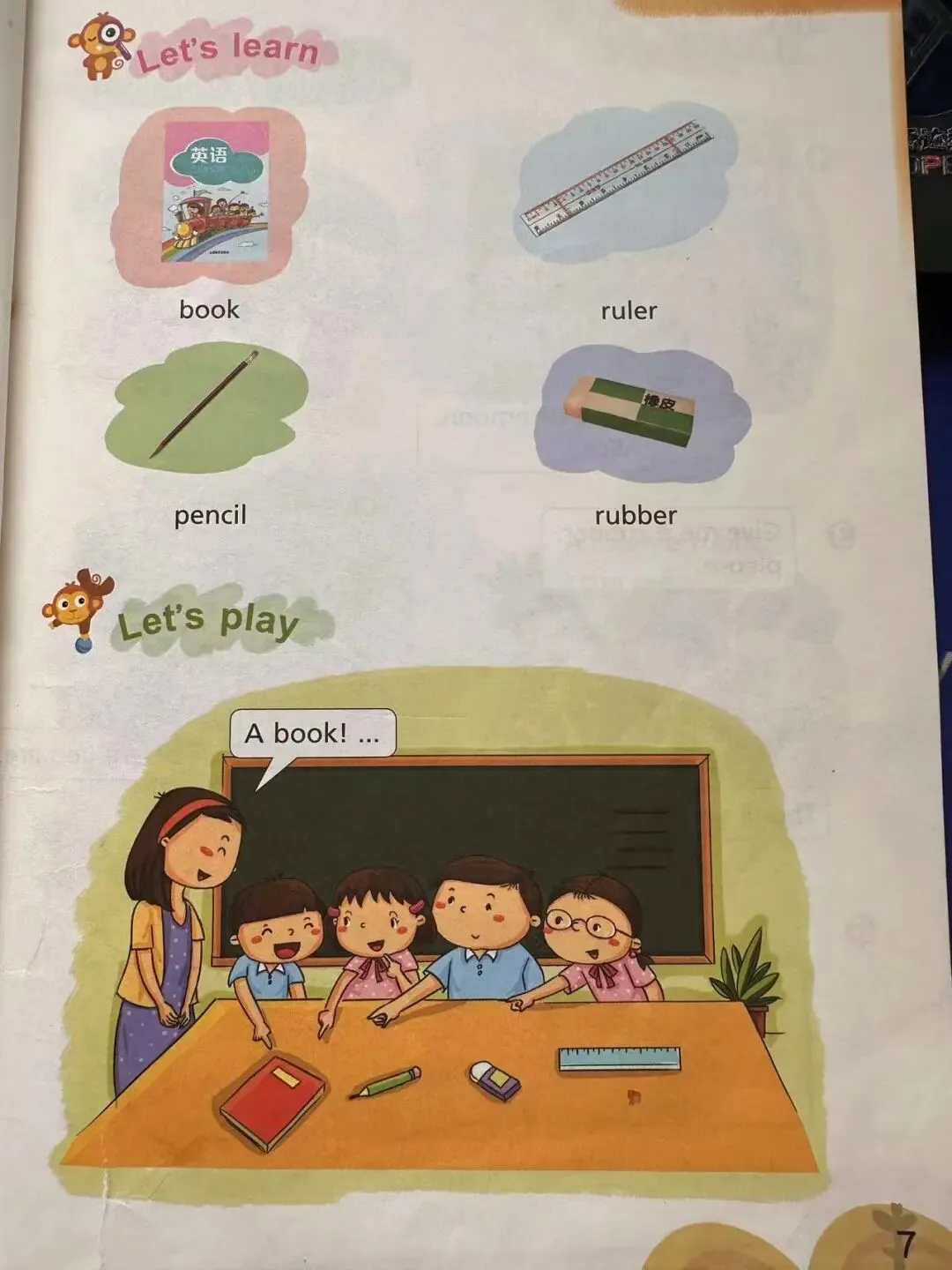 老师把一些文具放在桌子上,然后说“A pencil!” ,同学们就要快速指出铅笔在哪里。