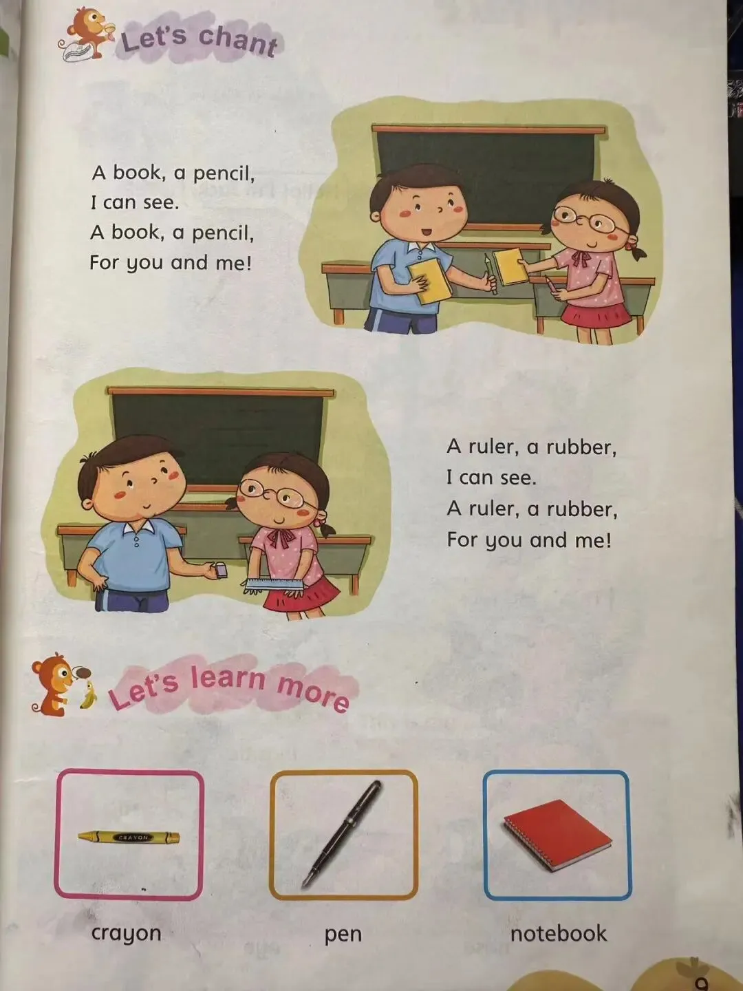 美术课上,你可以说“I have a crayon.”(我有一支蜡笔)。写作业时可以说“I need a pen.”(我需要一支钢笔) ,记东西时说“I use a notebook.”(我用一个笔记本)