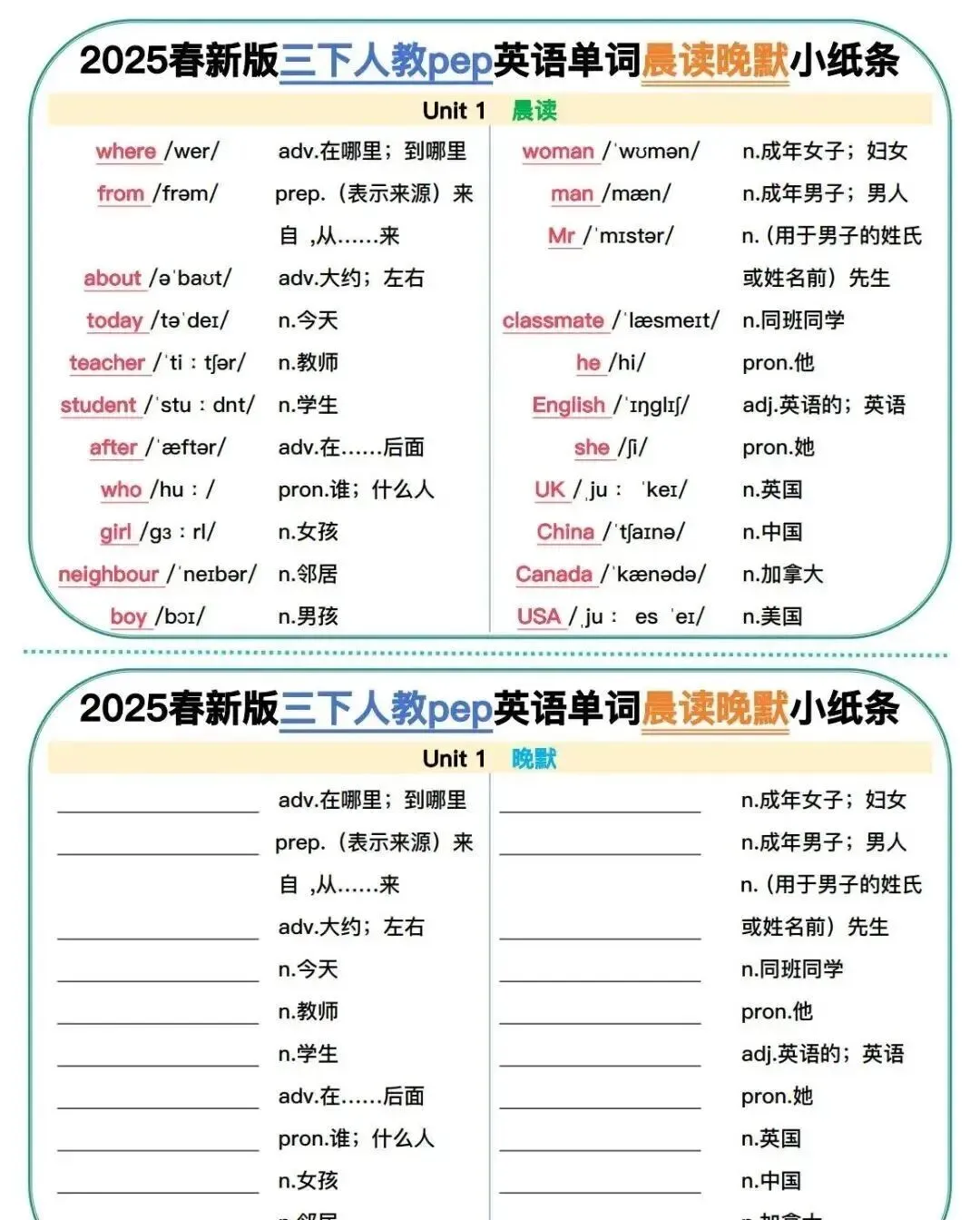 人教PEP版3-6年级同步教材单词练习,包含每个单元单词,早读晚练,很好用!