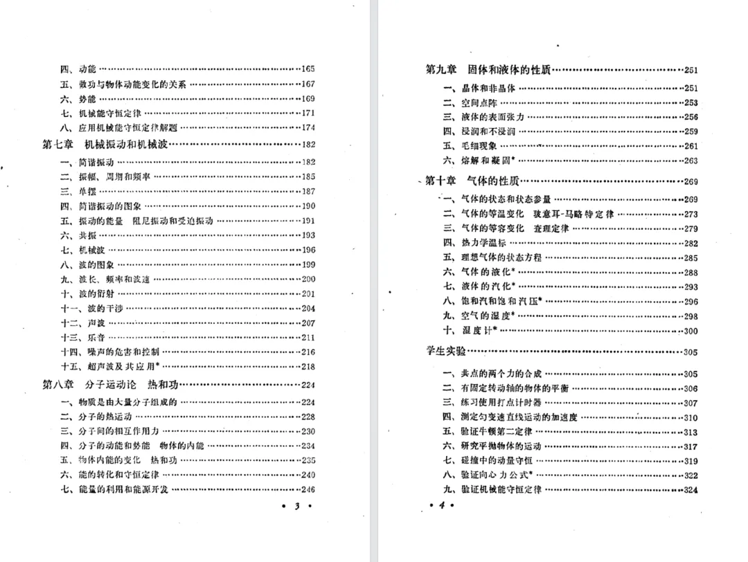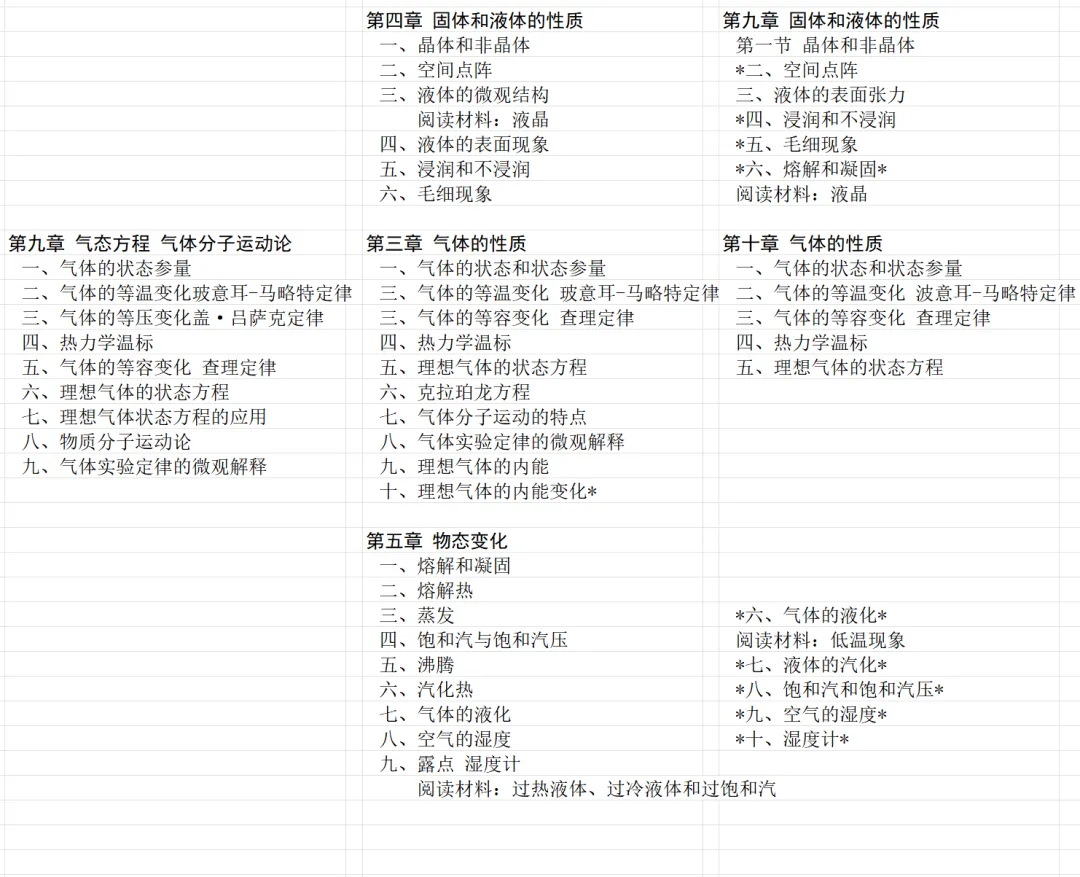 下面看三版教材中固体、液体和气体相关的章节。旧教材只有气体的内容。甲种本和乙种本有固体、液体和气体的内容。甲种本是先气体,后固体和液体,最后物态变化。乙种本是先固体和液体,后气体,物态变化的内容没有单独成章,而是合并到前面介绍三态物体的两章里。很明显,乙种本的内容相比甲种本少很多。乙种本把固体和液体以及物态变化的内容几乎全都打上了星号,第二版打得更多(第一版的星号在标题后,第二版的星号在小节编号前)。