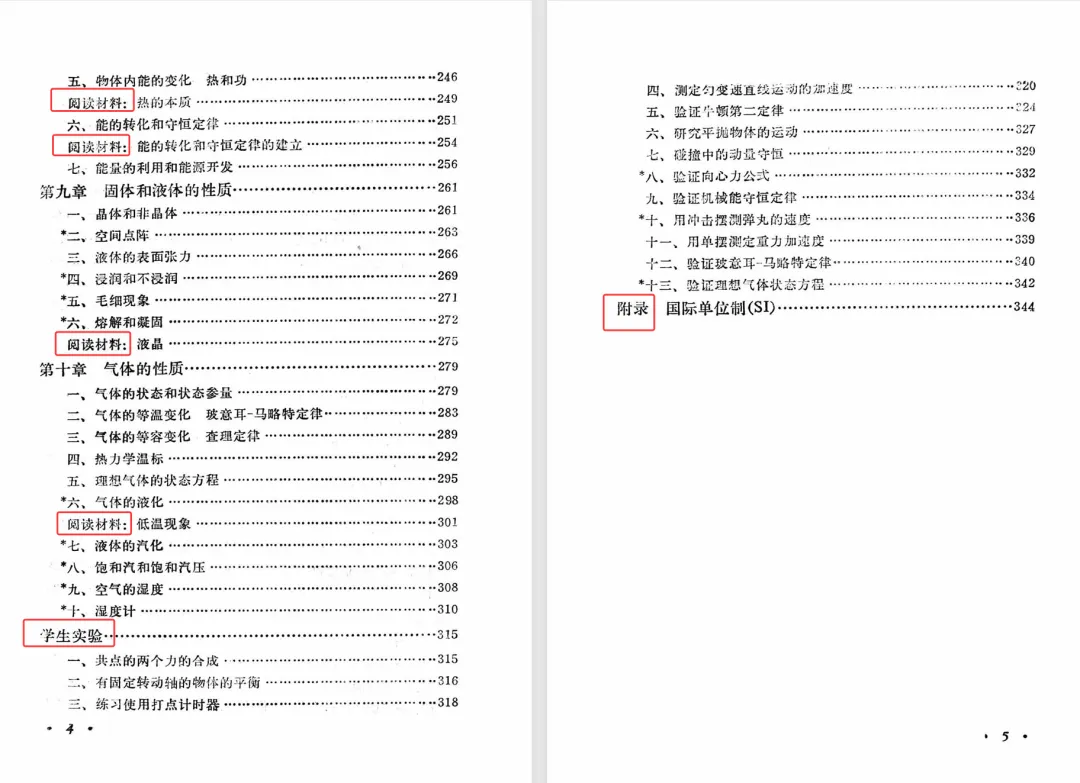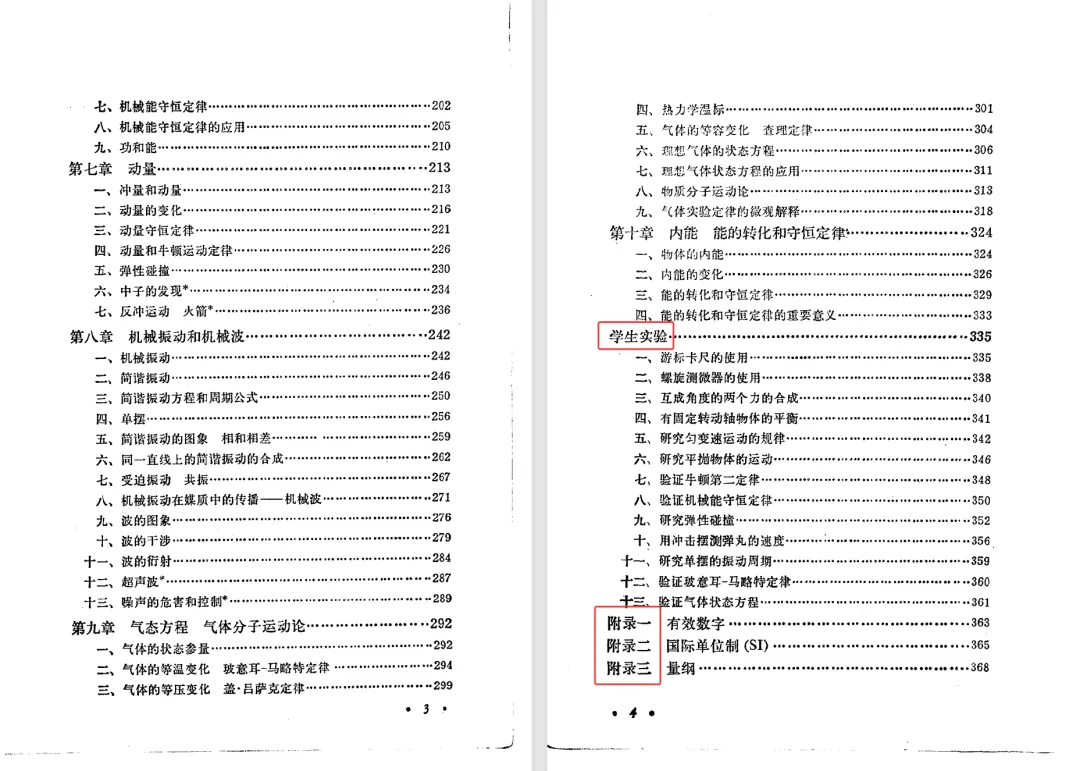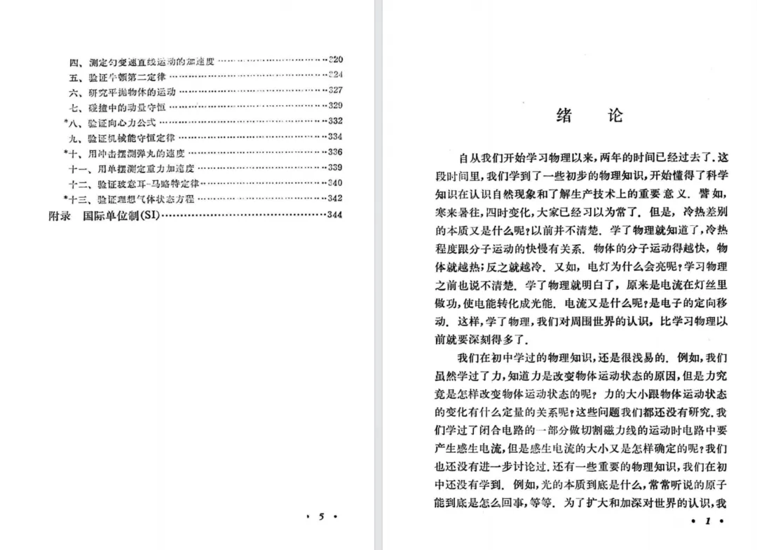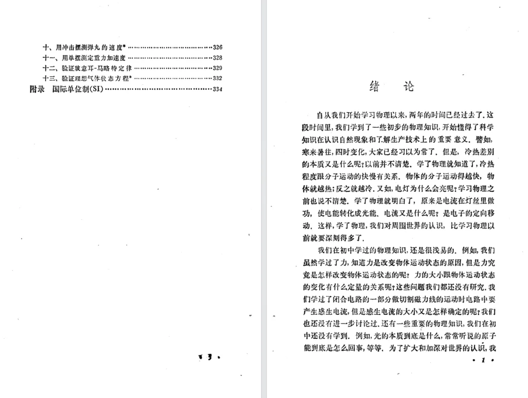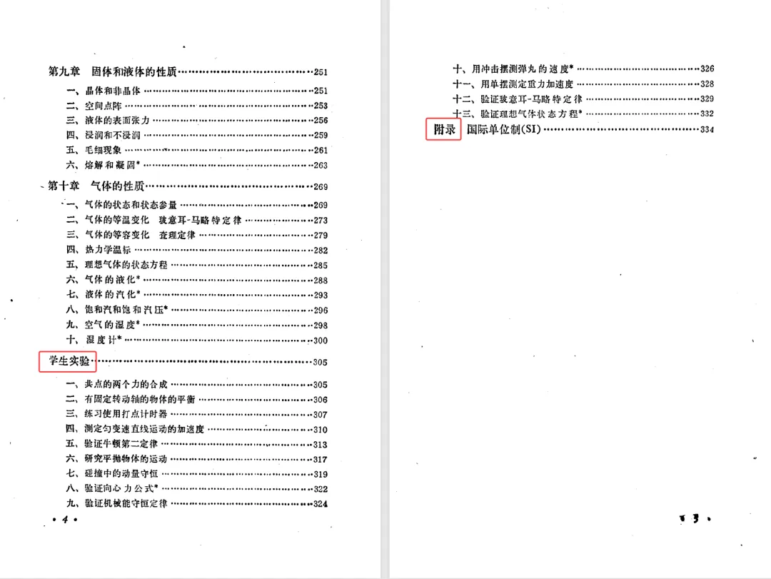 按《物理教材建设史》的说法,第二版仅增加了一节,删除了一个学生实验,但是,第二版做了重新排版,导致两个版本的页数有较大的变化。上册的国际单位制的附录,第一版在第334页,第二版在第344页。接下来先对比分析教材目录,后对比两版教材排版的差异。