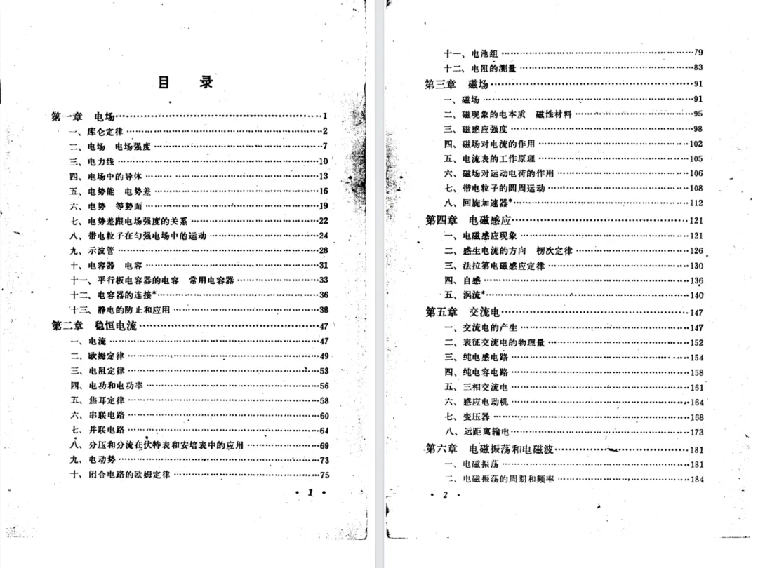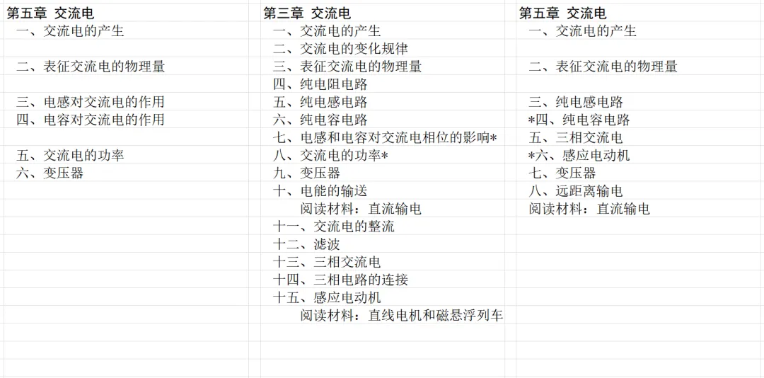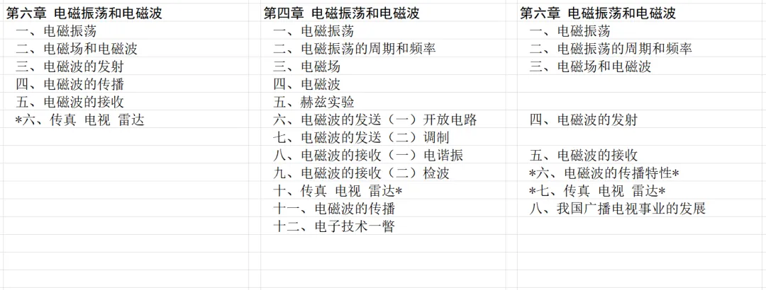 下面是交流电、电磁场和电磁波三版教材的章节。显然乙种本内容最少。