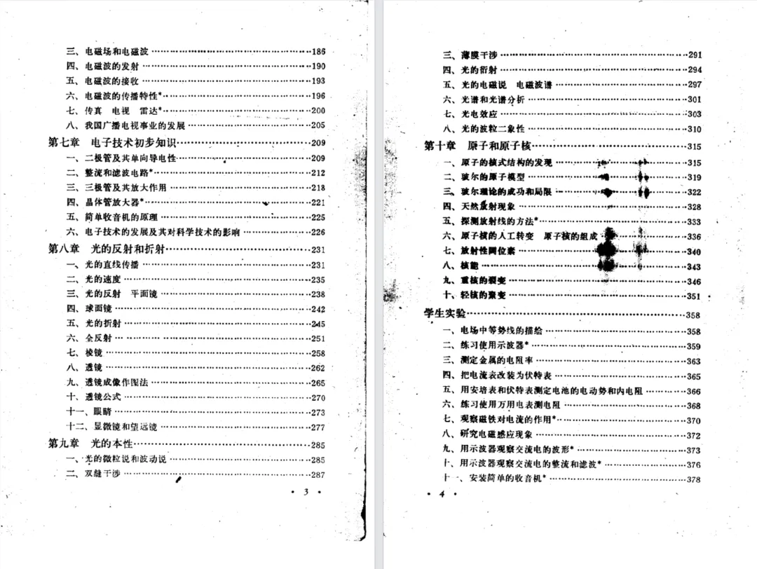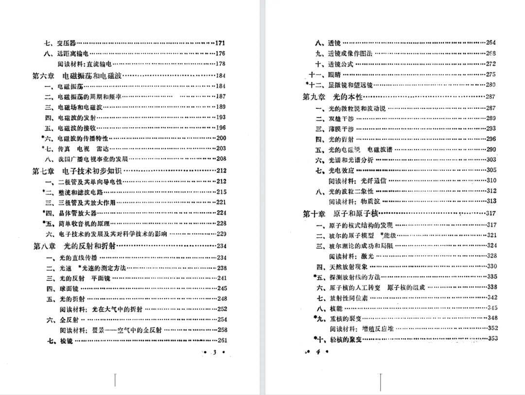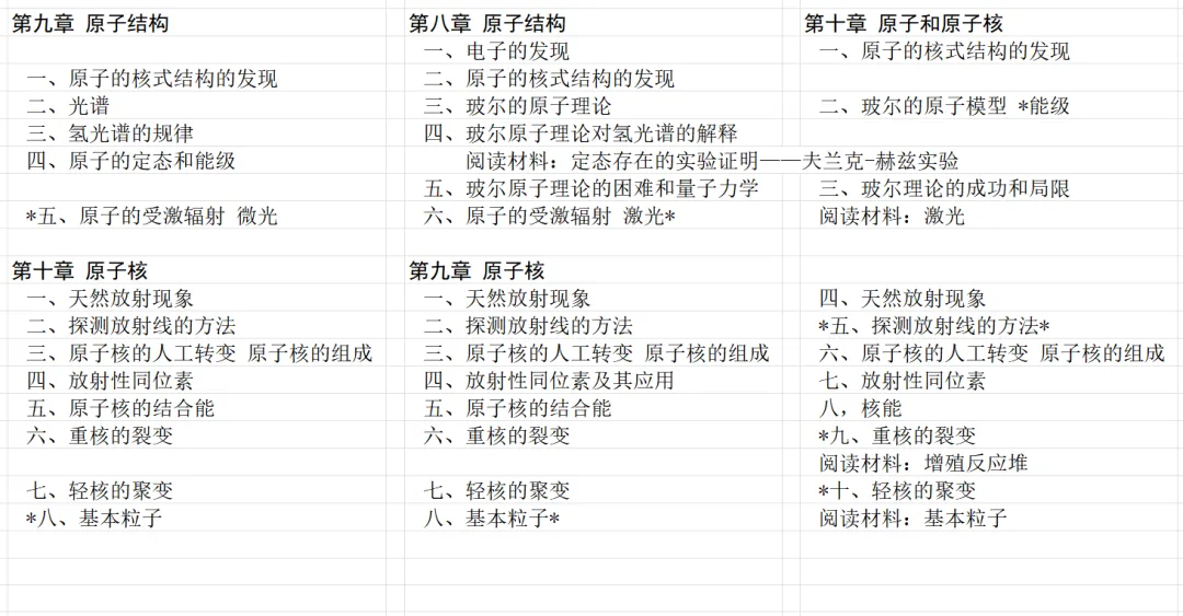 最后是原子结构和原子核的章节。旧教材把光谱放在原子结构一章,甲种本和乙种本是放在前面光的本性的章中。甲种本第八章第一节电子的发现,在乙种本放在磁场一章的阅读材料里。乙种本加星号的选学内容较多。基本粒子在旧教材和甲种本是选学小节,在乙种本是阅读材料。