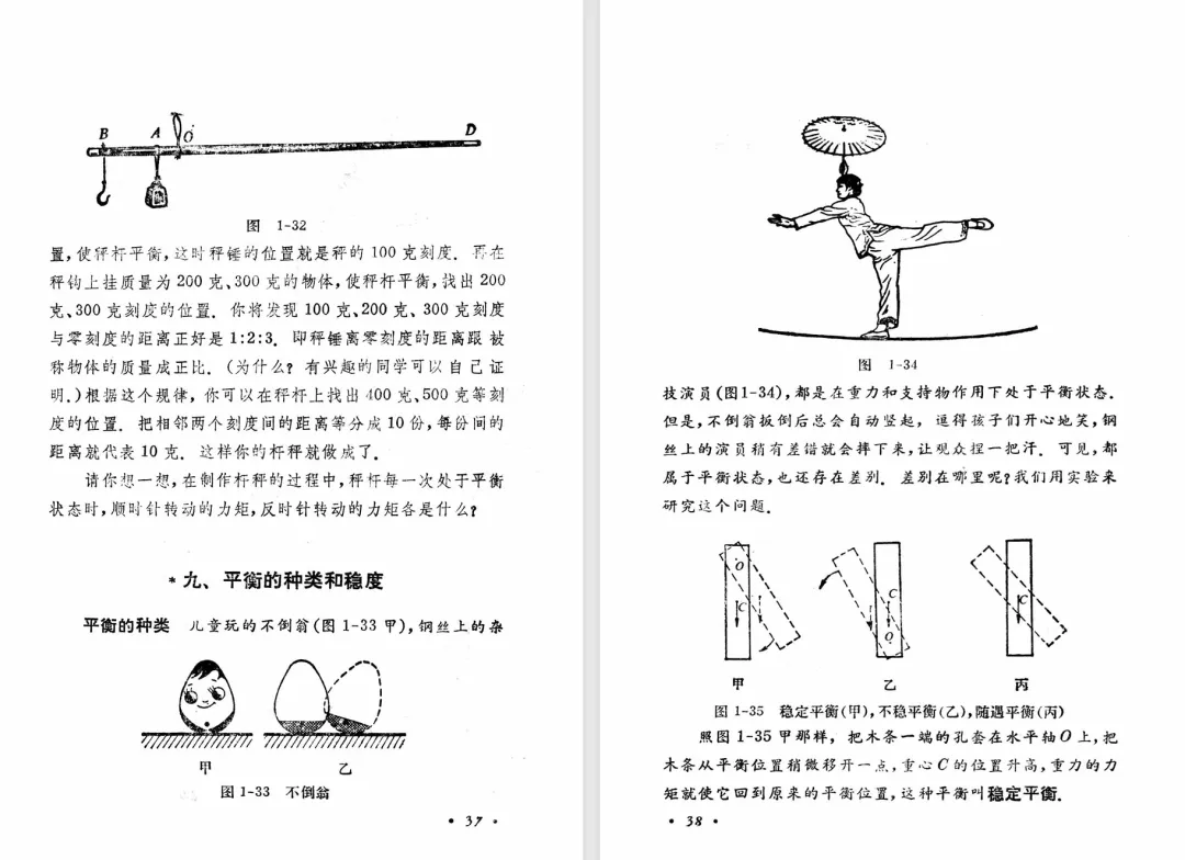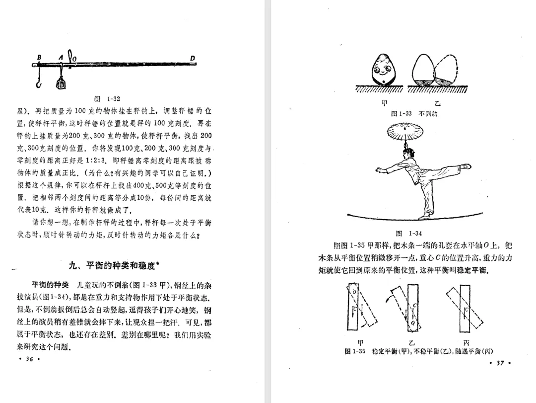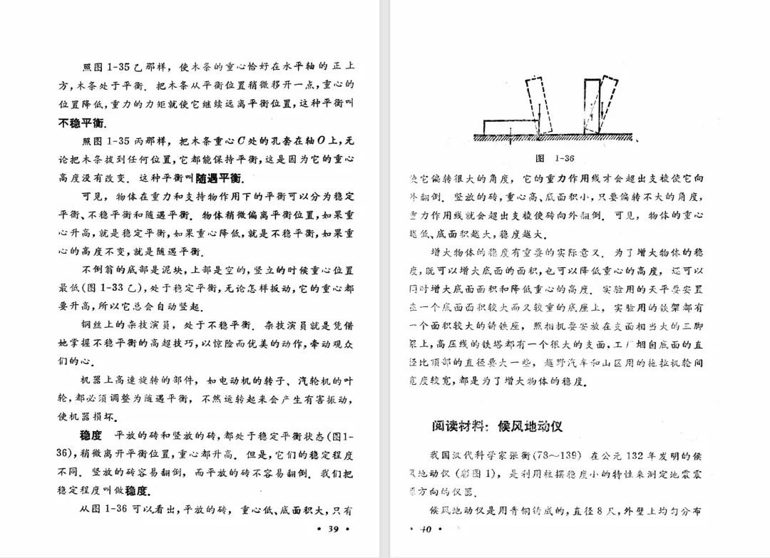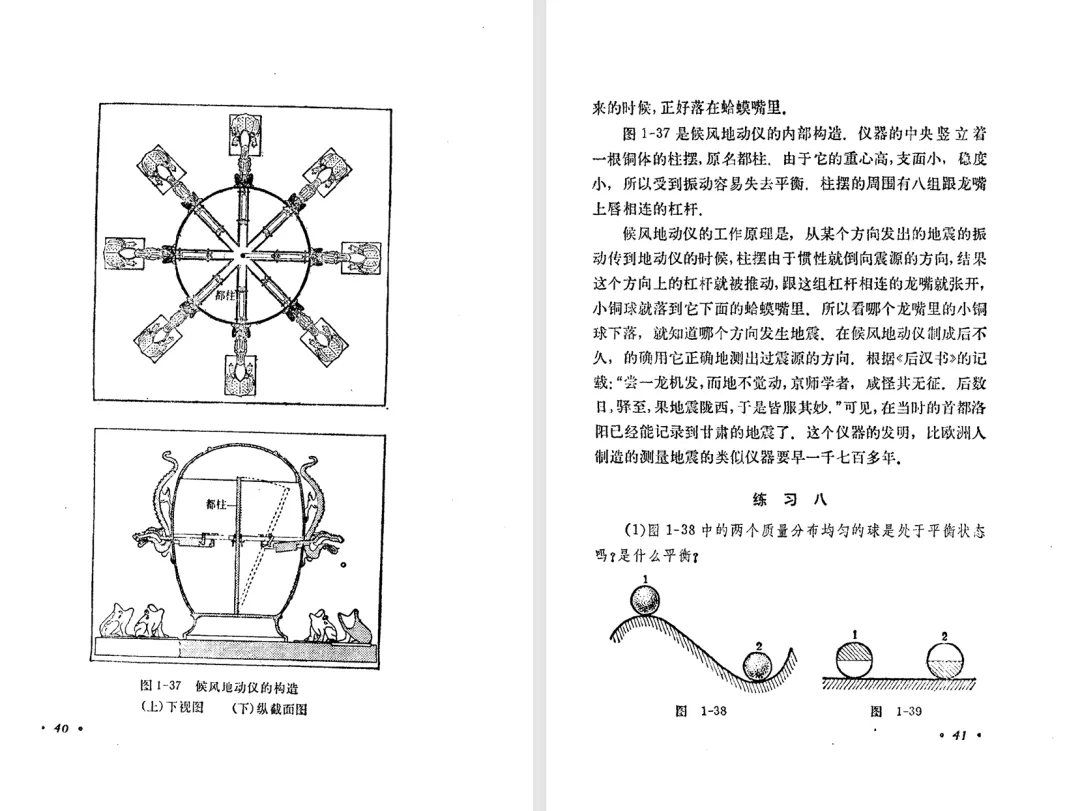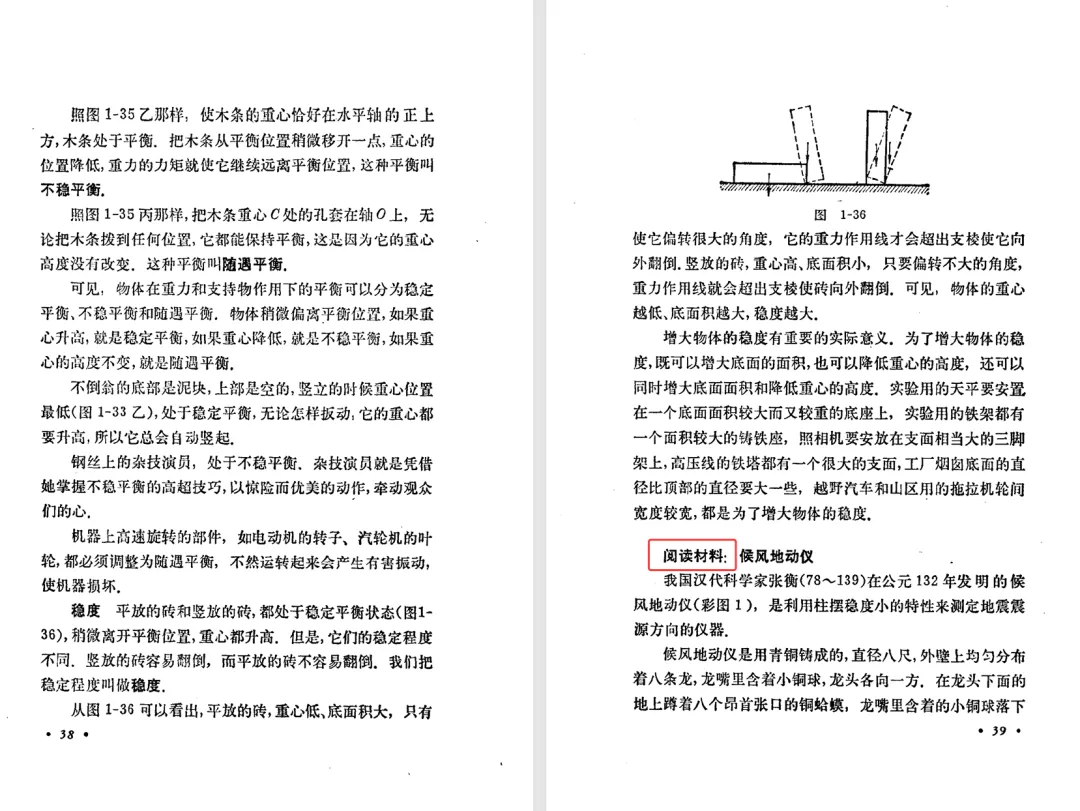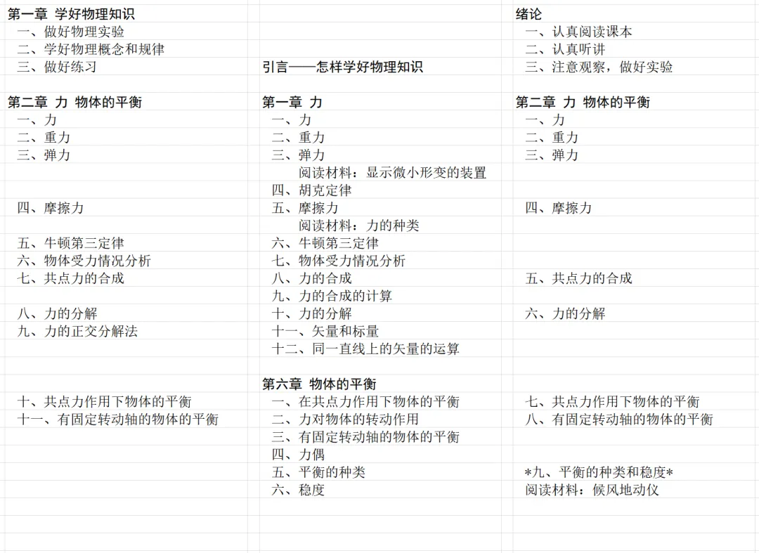 下面的表格中,从左到右的三列分别是旧教材、甲种本、乙种本的开篇、力、物体的平衡有关内容的目录。我们注意到,乙种本的小节是最少的。乙种本第一章没有牛顿第三定律,放到后面第四章了。乙种本有甲种本中的平衡的种类和稳度,是打了星号的第九节。表格中乙种本一列,小节编号前面的星号表示第二版中本节或者本主题是选学内容,标题后面的星号表示乙种本第一版中本节或者本主题是选学内容,前后都有星号表示两版教材中都是选学内容。我们还注意到,乙种本第一章末尾有一个候风地动仪的阅读材料,甲种本没有。可见,甲种本和乙种本并不是单纯的包含关系,乙种本中可能会有甲种本没有的内容。甲种本和乙种本不是同一班人马编写的,出现这种情况也正常。