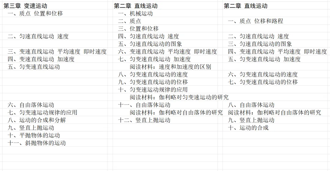 接下来对比三版教材主要介绍直线运动的一章的目录。乙种本和甲种本的小节比较接近,旧教材最少。