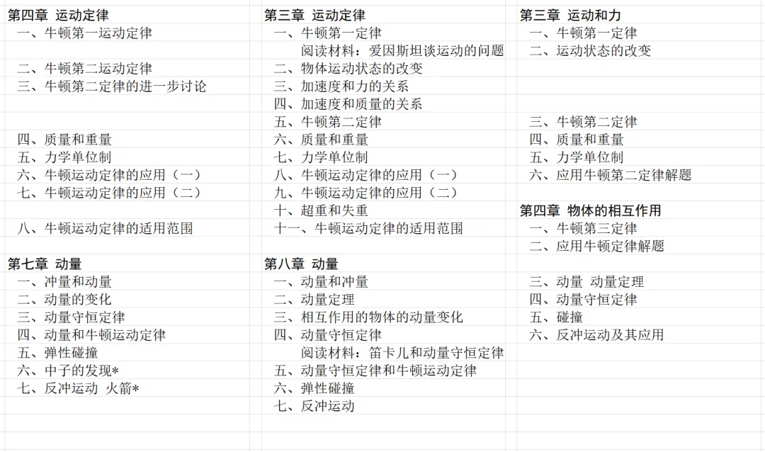 下面是运动定律和动量有关的两章的目录的对比。显然,乙种本的小节最少。乙种本中,牛顿第二定律和动量有关的小节数量最少。注意,甲种本第三章的第二节到第五节都是与牛顿第二定律有关的小节。