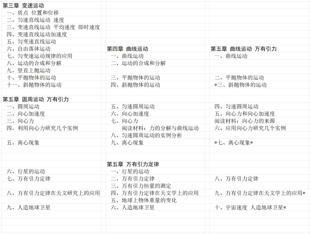 接下来对比三版教材与曲线运动和万有引力有关章节。乙种本将旧教材中变速运动一章中的抛体运动和旧教材的 第五章 圆周运动 万有引力 合并成新的 第五章 曲线运动 万有引力。乙种本第五章的小节和旧教材对应内容的小节接近,但是难度比旧教材要低。甲种本内容最多。