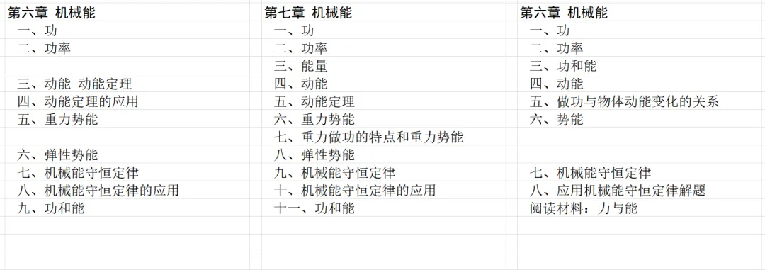 下面是三个版本教材机械能一章。可以明显看到,乙种本弱化了势能的内容。