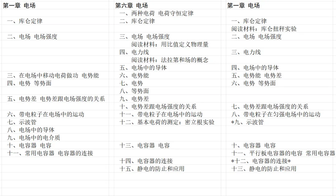 下面看电场一章的小节编排。可以看出,三个版本教材内容是接近的,甲种本小节最多,划分最细。但是前面的文章已经表明,甲种本内容的覆盖面和难度是比不上旧教材的。乙种本把库仑扭秤实验单拎出来作为阅读材料出现,而不是放在正文中。甲种本将示波管放在后面的 第八章 物质的导电性,乙种本和旧教材一样,示波管放在电场这一章,但是乙种本的示波管是打星号的选学内容。乙种本的必学内容是最少的,难度也必然是最低的。