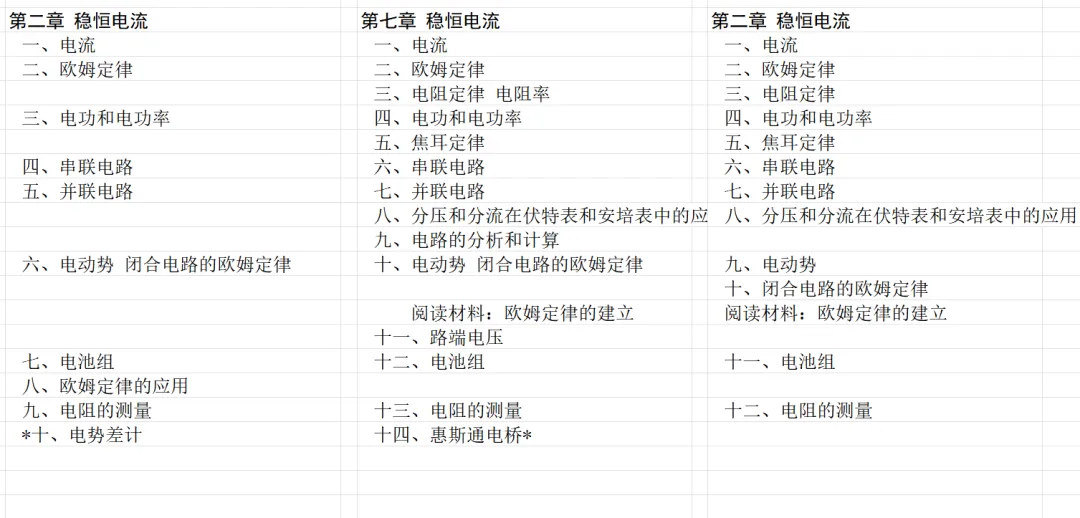 下面看稳恒电流一章。乙种本没有甲种本的独立的电路的分析和计算小节。甲种本第十节和第十一节的内容与乙种本第九节和第十节的内容对应,两版教材只是小节划分不同。乙种本没有甲种本的惠斯通电桥,这部分内容在甲种本已经是选学内容了,难度更低的乙种本将其删除也合理。