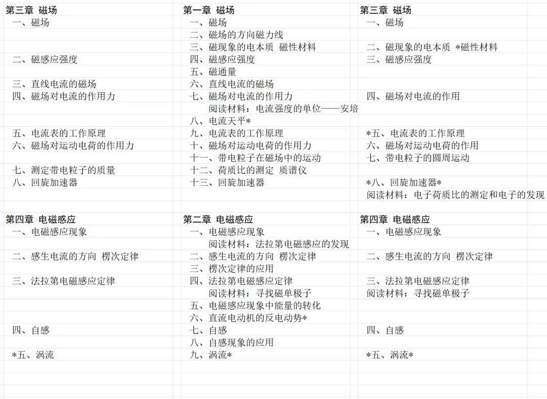 接下来对比磁场和电磁感应的内容。注意,乙种本第二版把磁性材料和电流表的工作原理都改为了选学内容。回旋加速器在第一版和第二版都是选学内容,在旧教材和甲种本是必学内容。甲种本的荷质比的测定在乙种本中是阅读材料。乙种本的阅读材料中还有电子的发现。甲种本是把电子的发现放在原子结构这一章的。