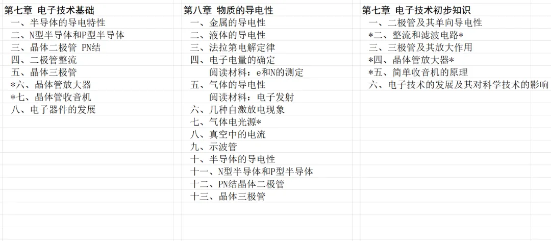 接下来这部分内容比较特殊。旧教材的主题是电子技术基础,甲种本的主题是物质的导电性,乙种本与旧教材类似,主题是电子技术初步知识,内容也类似。甲种本比另两版教材多了金属、液体、气体的导电性,真空中的电流,这些内容在上一版中学物理教材是放在初中的,乙种本没有加入这些内容。