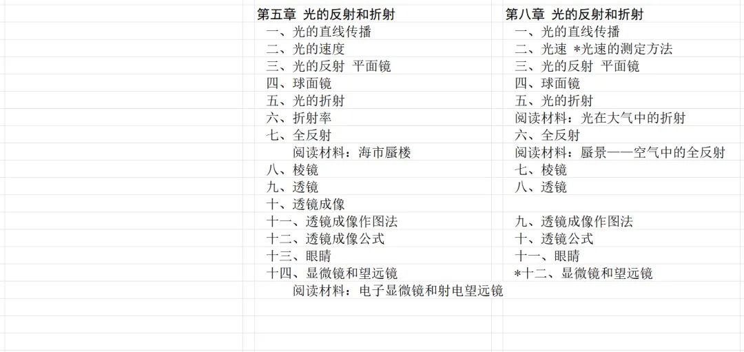 再对比下册。乙种本增加第八章 光的反射和折射,将旧教材第九章和第十章合并为乙种本的第十章。